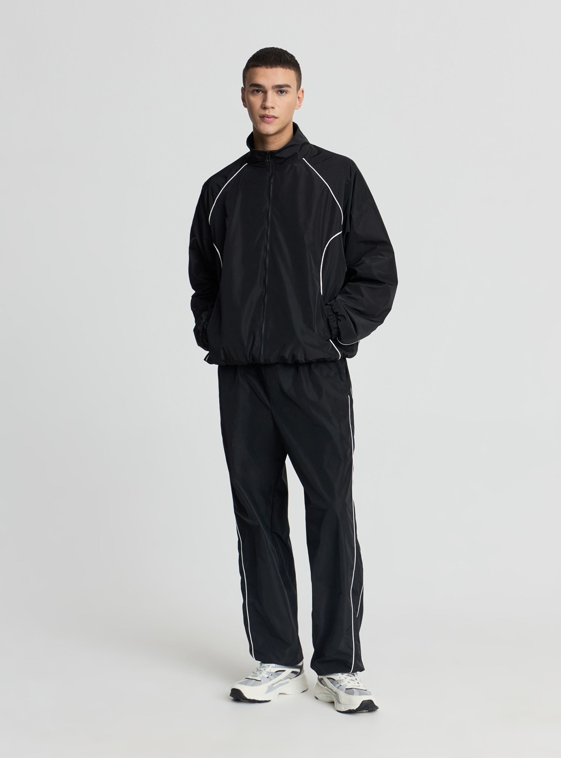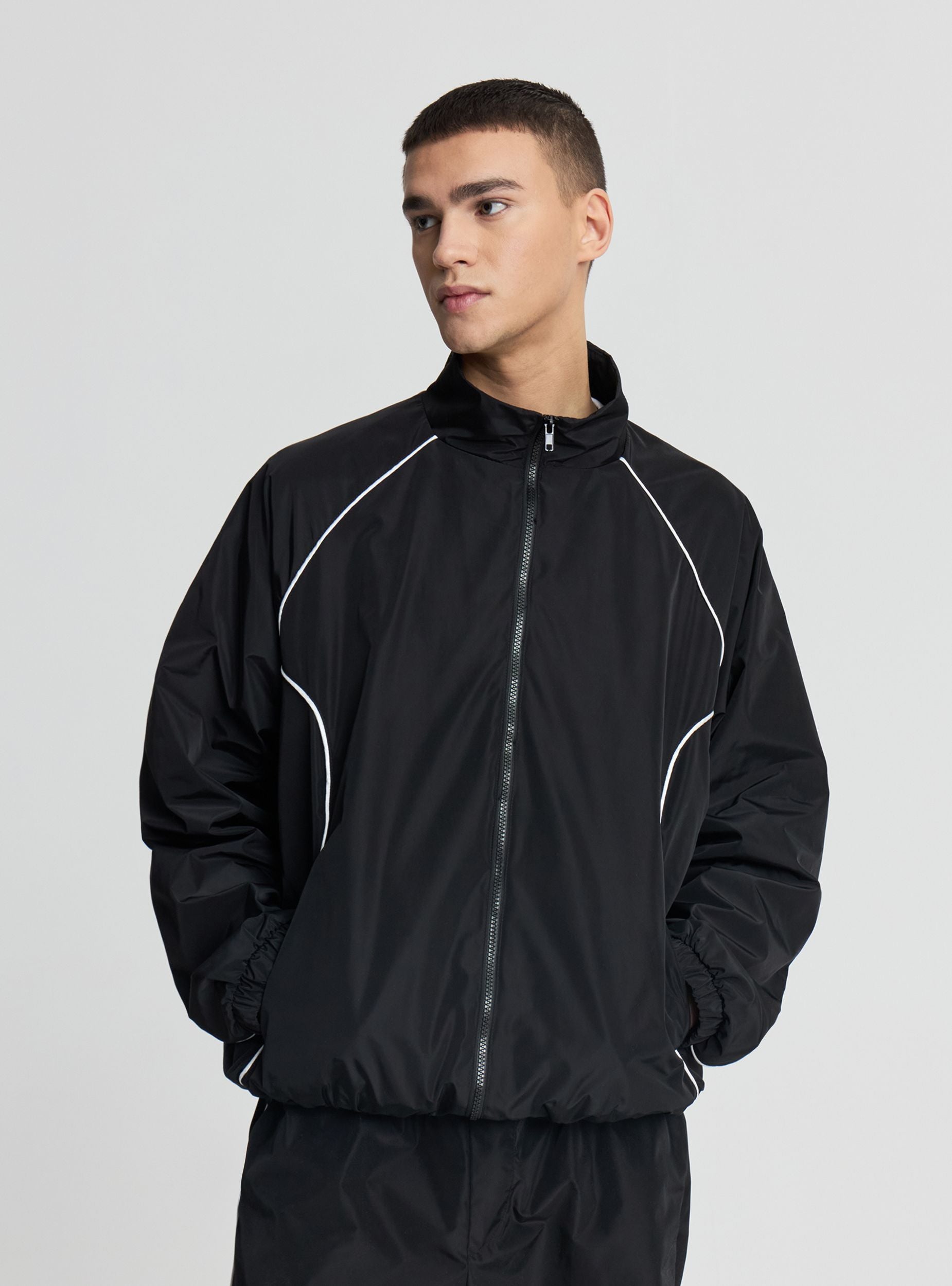 Giubbino da uomo a tinta unita con zip frontale e fondo elasticizzato. Design leggero ideale per il tempo libero e gli spostamenti in cittá, rifinito da profili a contrasto che slanciano la linea. Collo alto e maniche lunghe dal comfort elastico ai polsi. Si abbina a jeans e sneakers o a pantaloni jogger per un look sporty. Tasche laterali per portare l’essenziale.Dettagli