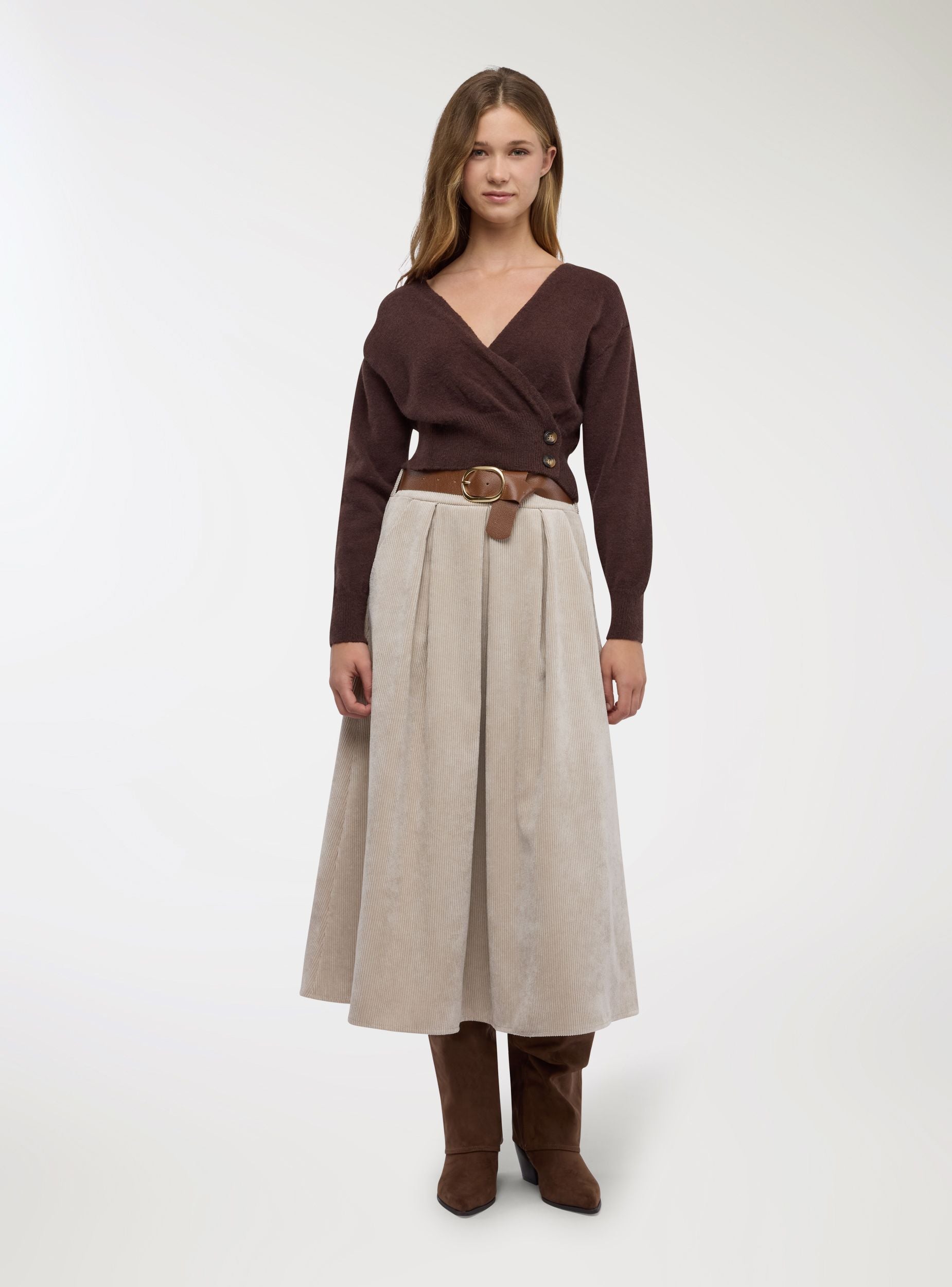 Gonna lunga da donna a tinta unita, caratterizzata da pieghe frontali che creano volume e movimento. Vita con cintura abbinata e fibbia arrotondata, pratica per definire la silhouette. Tasche laterali inclinate e linea svasata per una vestibilità confortevole. Ideale con stivali e maglione per il giorno o con camicia e mocassini in ufficio, perfetta per look casual curati.Dettagli
