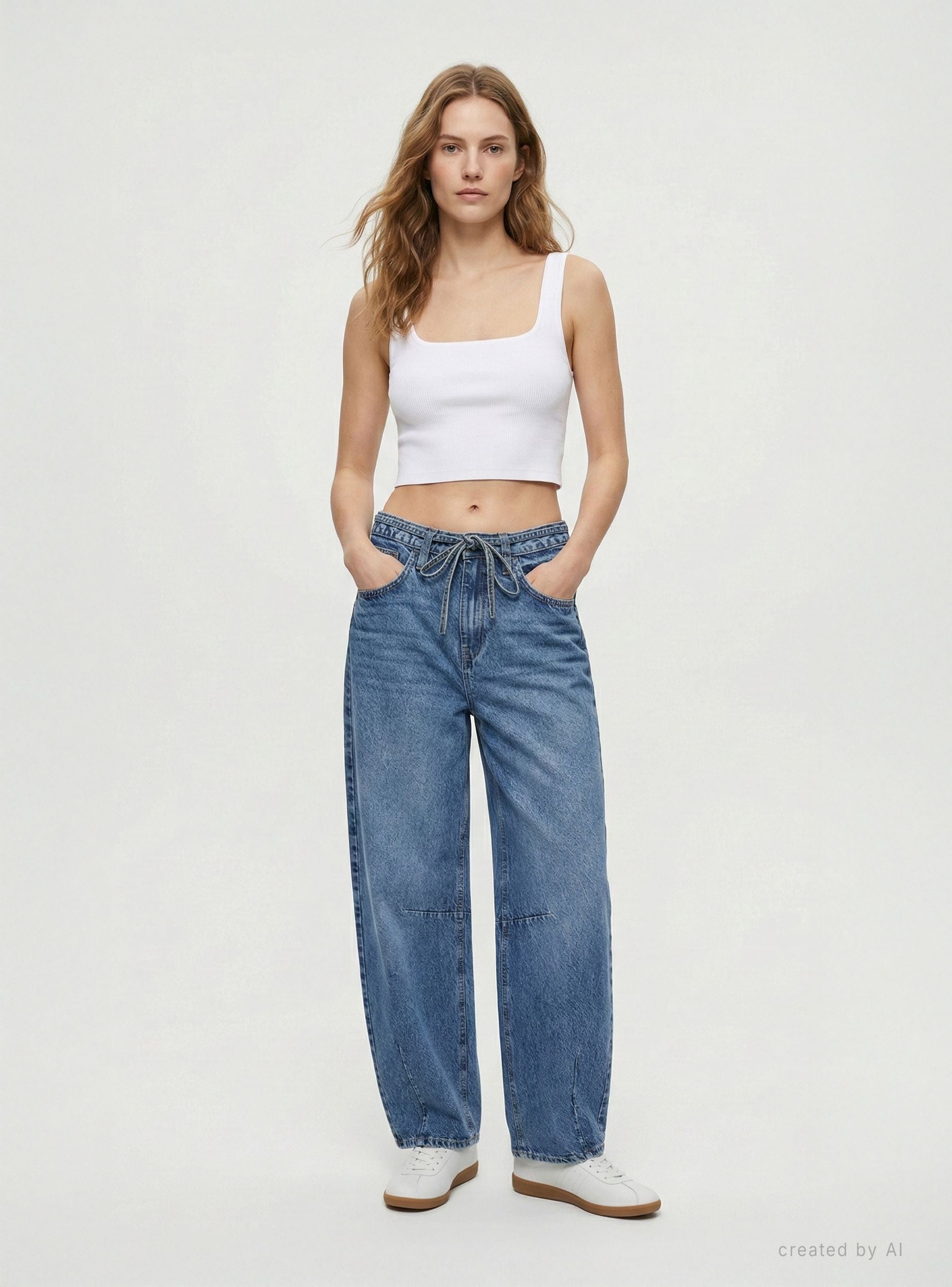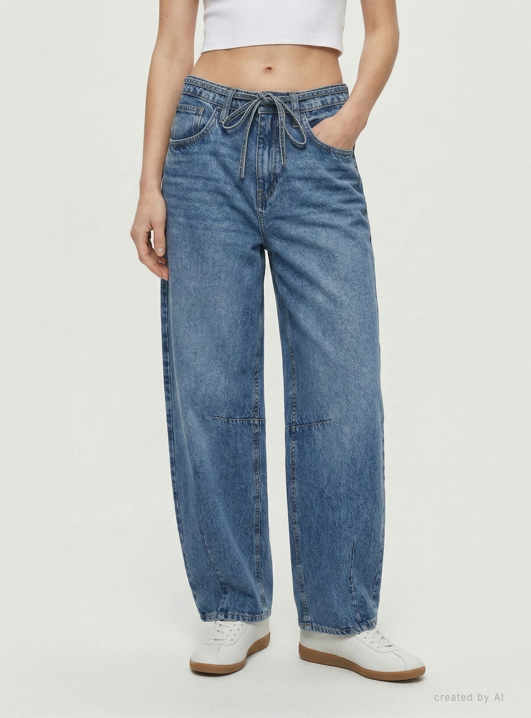 Jeans da donna a tinta unita dal taglio barrel con gamba ampia e leggermente affusolata, ideali per look casual e street. La vita alta con passanti è arricchita da coulisse annodata, mentre la chiusura con zip completa il design. Modello a cinque tasche, facile da abbinare a top aderenti o camicie morbide e sneakers o sandali.