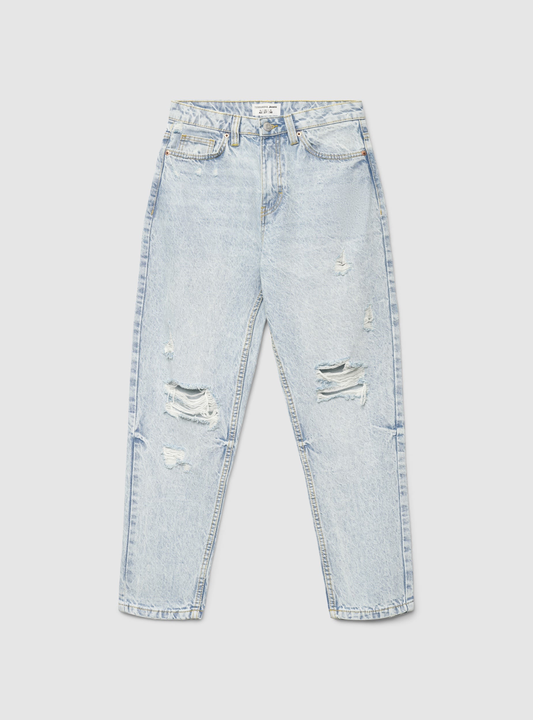 Jeans da donna a tinta unita con vestibilità regular in stile mom. Modello a vita media con passanti in vita e chiusura con bottone e zip. Presenta cinque tasche e strappi distribuiti sulle gambe per un tocco grintoso. Ideale con maglietta e sneakers per il giorno, si abbina anche a camicie e blazer per un look urbano. Lunghezza alla caviglia e lavaggio chiaro dall’aspetto vissuto.Dettagli