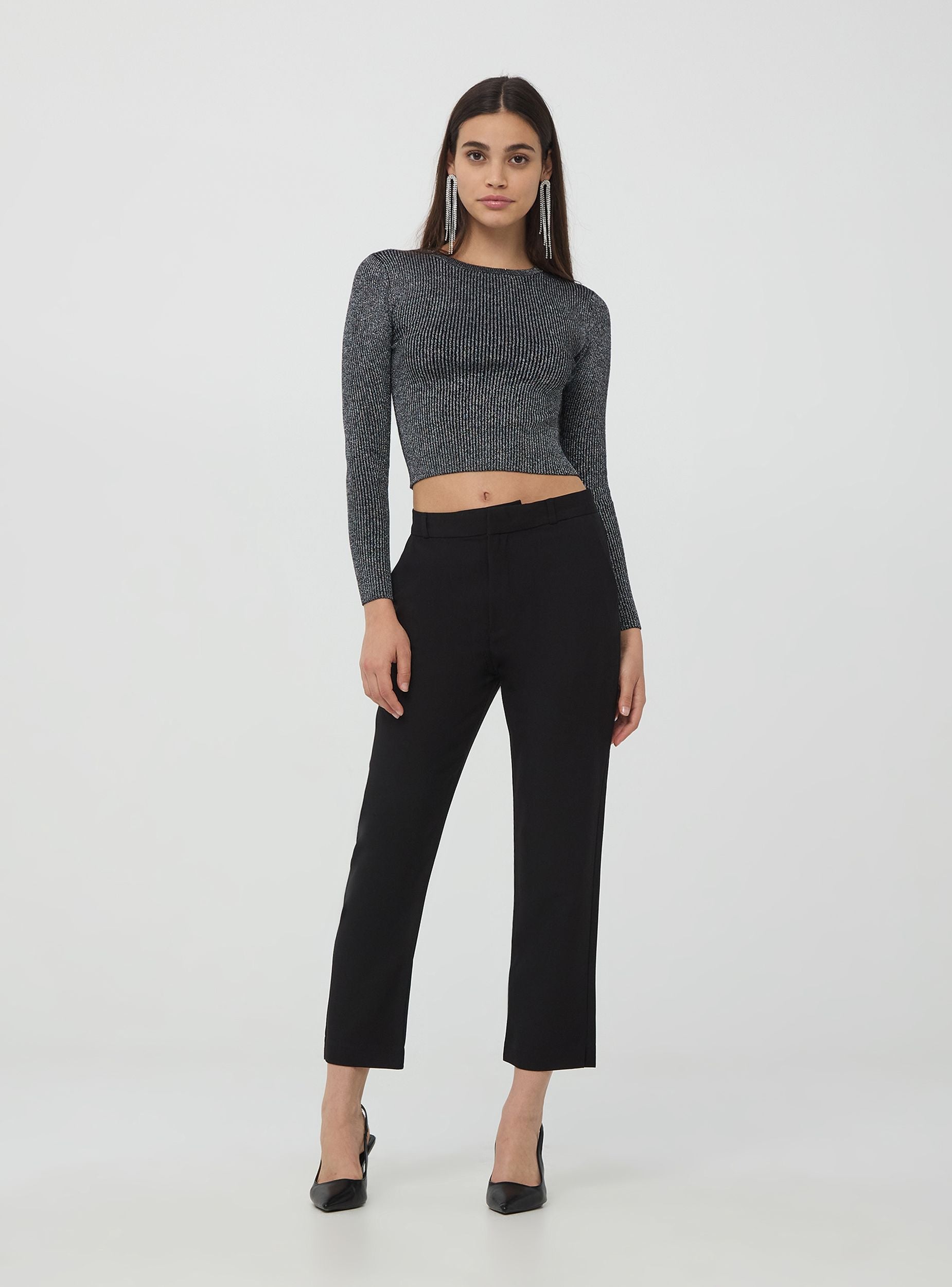Maglia crop da donna a costinluccicante, aderisce perfettamente al corpo, mettendo in risalto la silhouette femminile. Il design a maniche lunghe offre una copertura completa, mentre la lunghezza crop, che termina sopra la vita, conferisce un look moderno e alla moda. Il tessuto luccicante dona un effetto scintillante, ideale per aggiungere un tocco glamour al tuo outfit. Le costine verticali creano una texture raffinata e un effetto visivo snellente.Dettagli