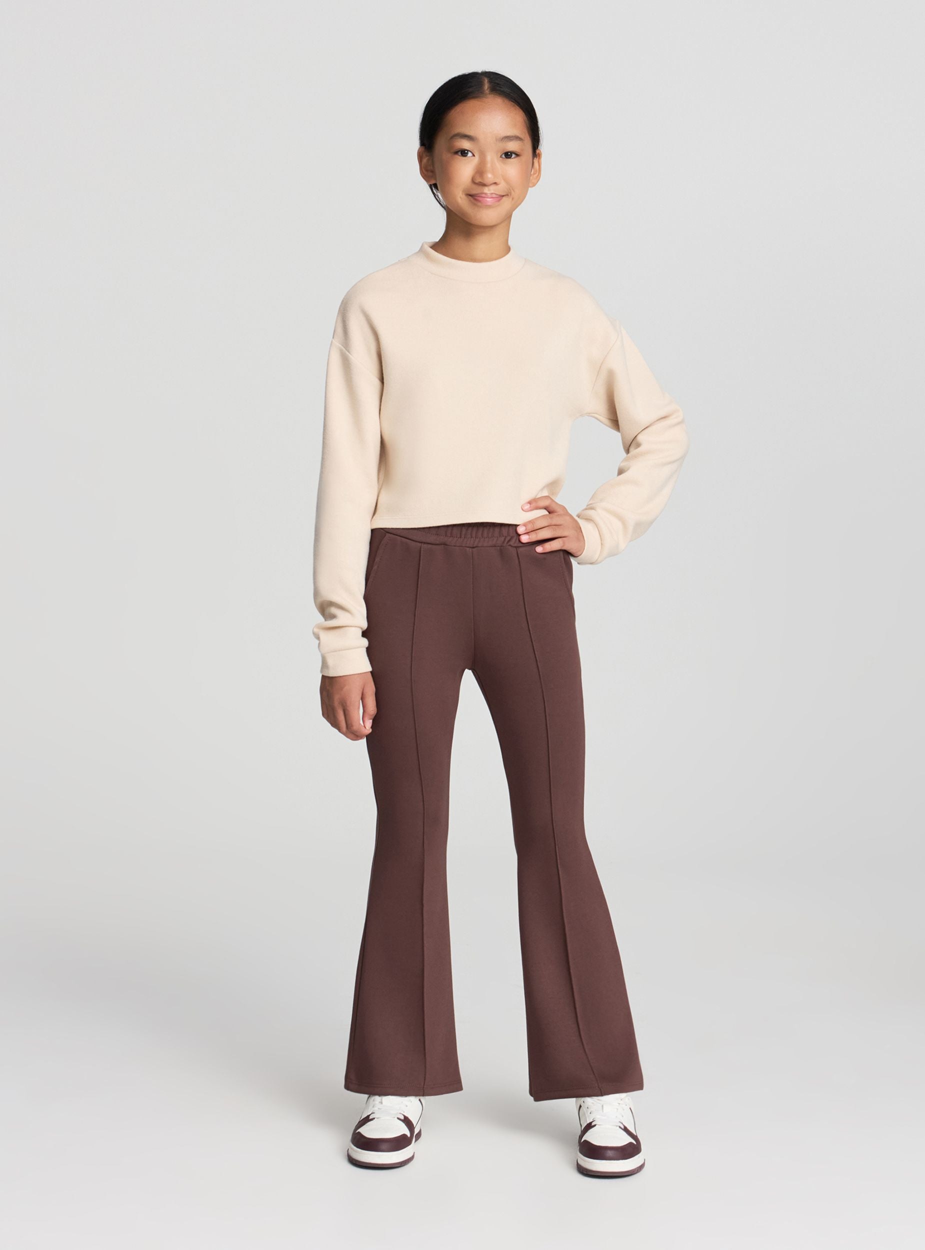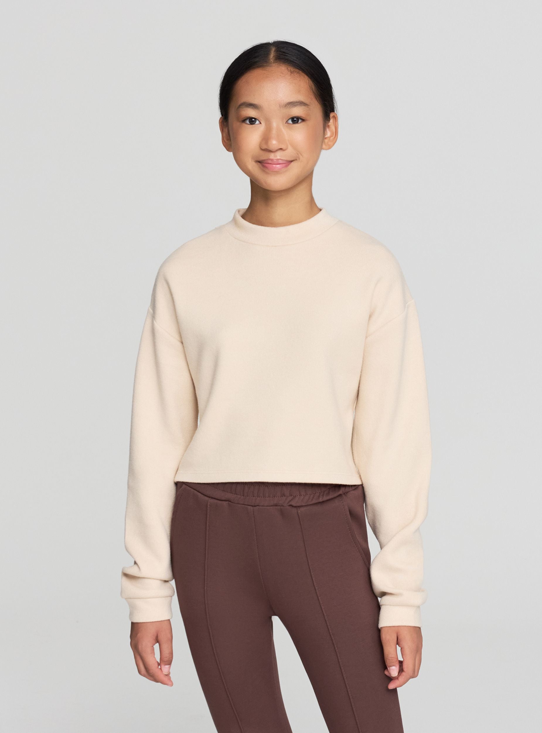 Tessuto caldo. Maglietta da bambina a maniche lunghe con vestibilità crop e collo lupetto. Linea pulita e tinta unita, ideale per look quotidiani e per la scuola. Perfetta sotto cardigan o giubbotti, si abbina a jeans, pantaloni cargo o gonne per outfit versatili. Orlo dritto e polsini rifiniti la rendono comoda e pratica da indossare in ogni momento.Dettagli