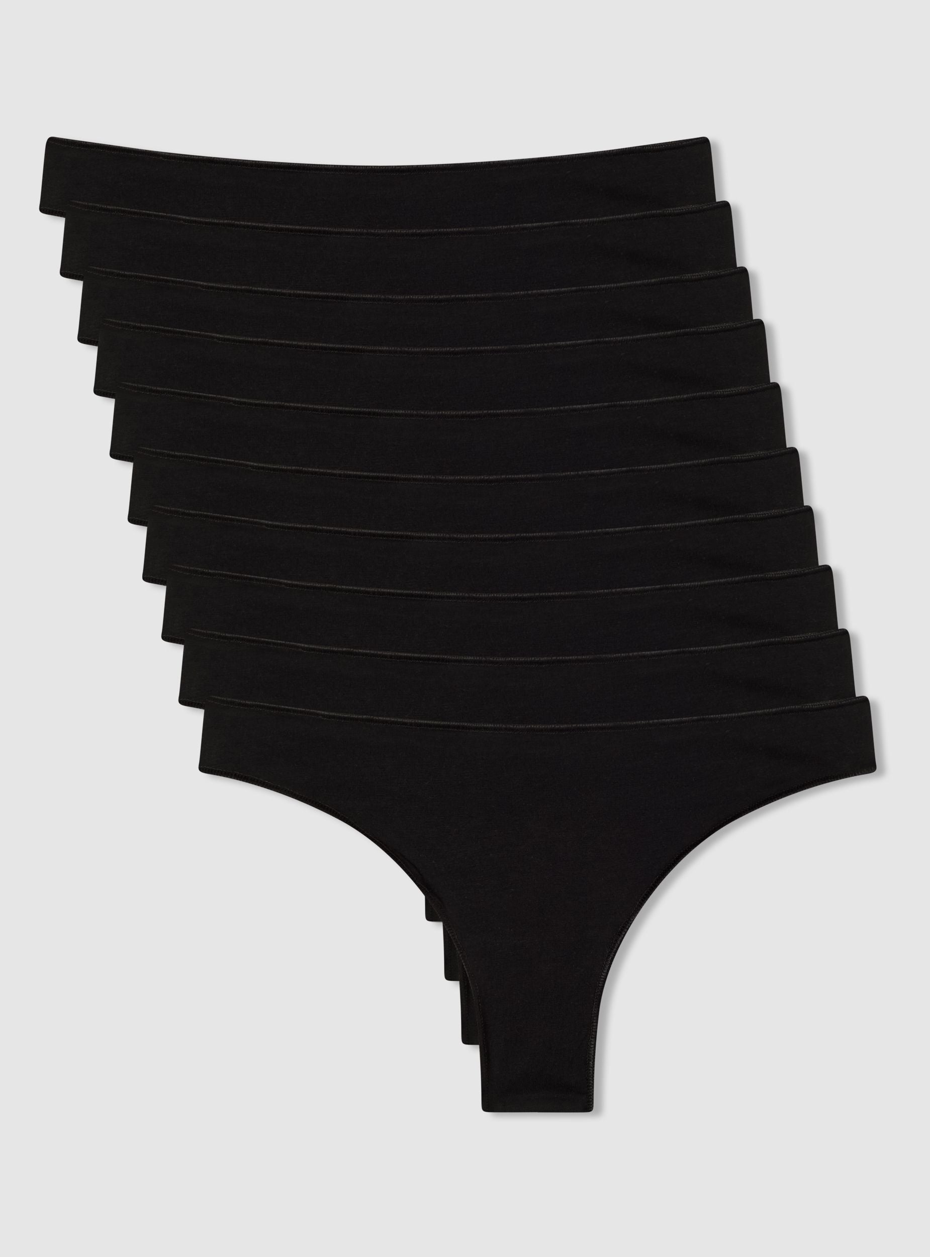 Confezione composta da 10 slip da donna con vestibilità brasiliana. Perfette per essere indossate sotto qualsiasi tipo di abbigliamento, grazie al design tinta unita che garantisce discrezione e stile. La vestibilità brasiliana offre un tocco di femminilità e comfort, rendendolo adatto per l'uso quotidiano.Dettagli