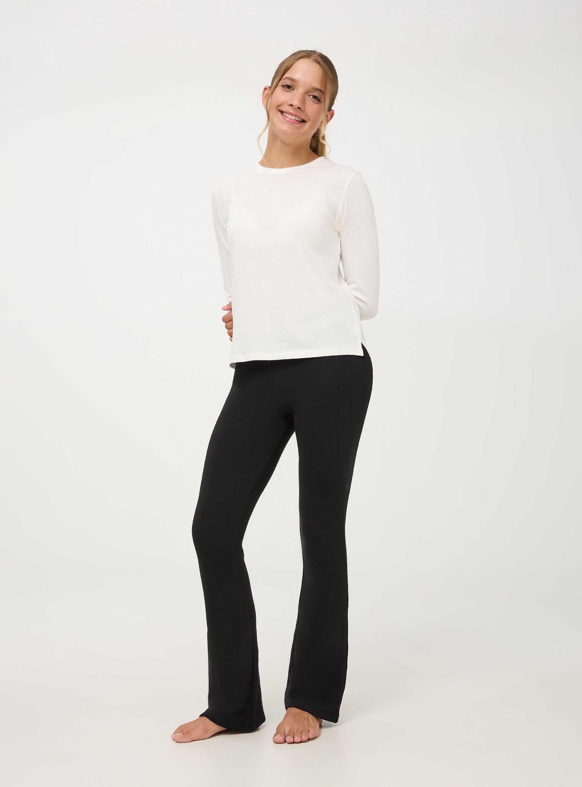 Confezione composta da 2 leggings neri in cotone elasticizzato perfetti per un look chic e versatile. Il design aderisce sui fianchi e si apre verso il fondo in uno stile a zampa, garantendo una vestibilità comoda e alla moda. Le cuciture sono sottili e pulite, senza bottoni o zip per un effetto minimalista. Ideali per occasioni casual o outfit eleganti, questi pantaloni sono un must-have essenziale da avere nel guardaroba di ogni bambina.Dettagli