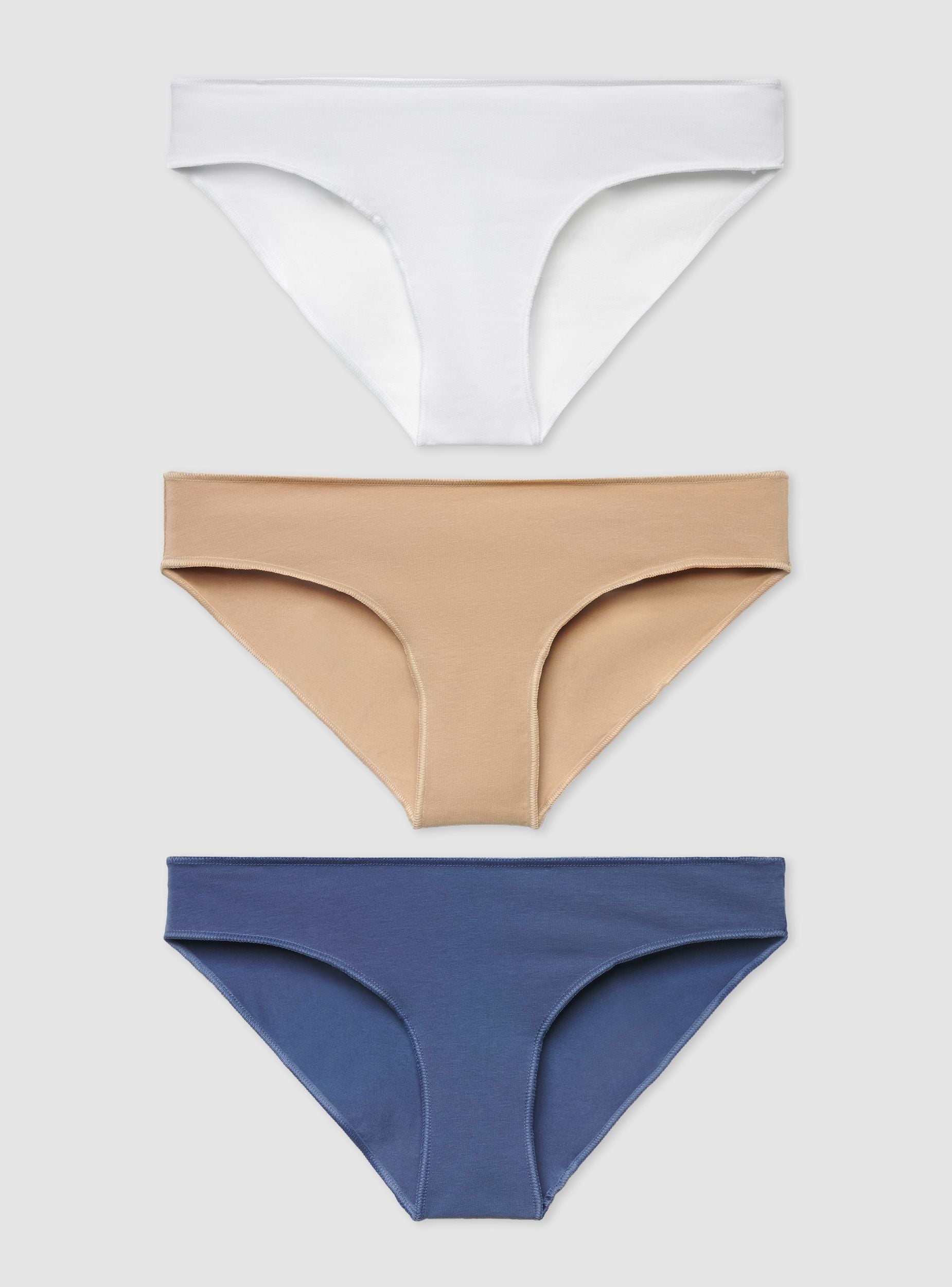 Slip da donna in tinta unita, in confezione da tre. Modello essenziale con vita media e sgambatura morbida, pensato per un comfort quotidiano, ideale sotto ogni outfit. Linee pulite, perfetti da abbinare a reggiseni coordinati o a completi intimi minimal.Dettagli