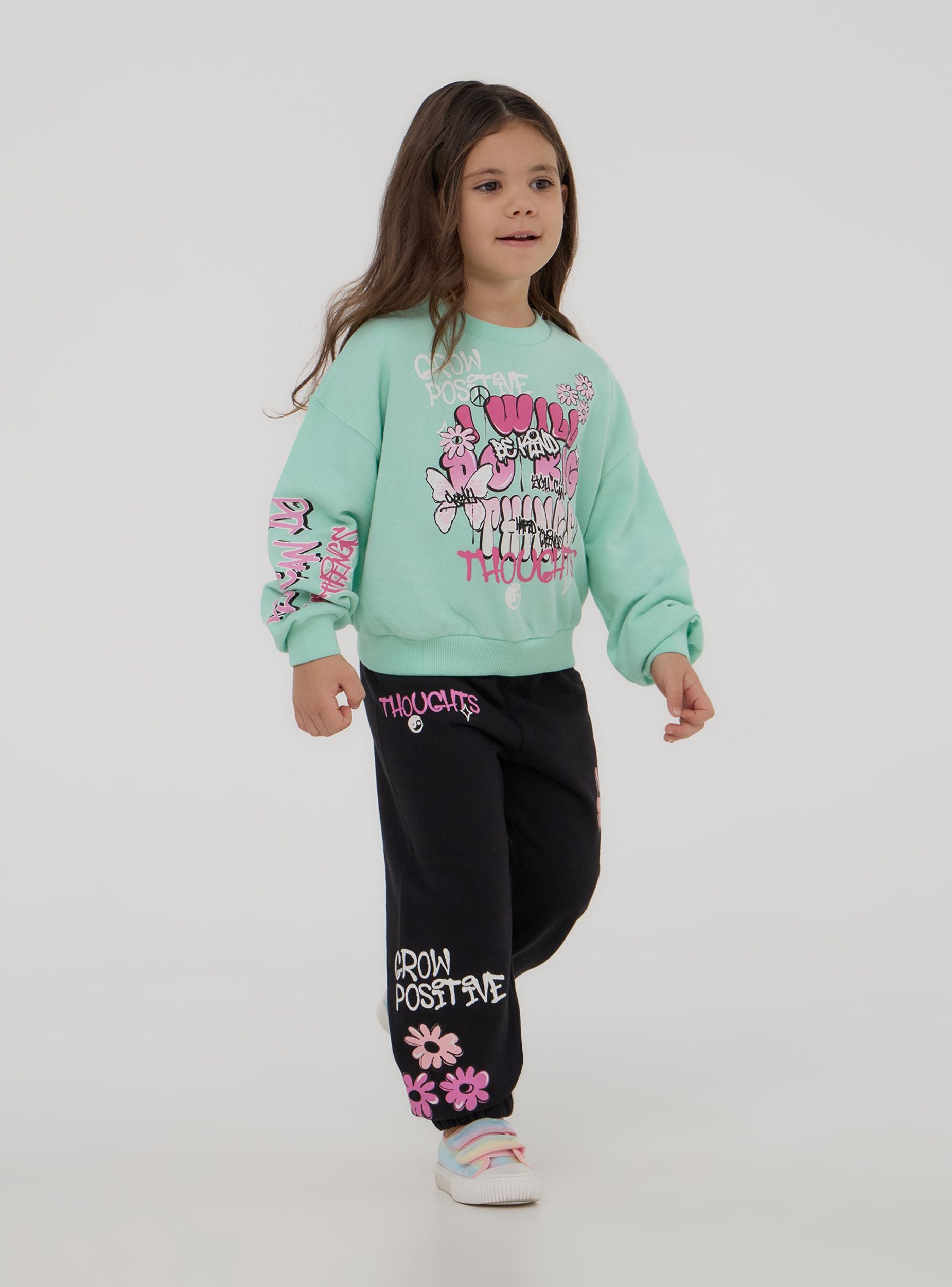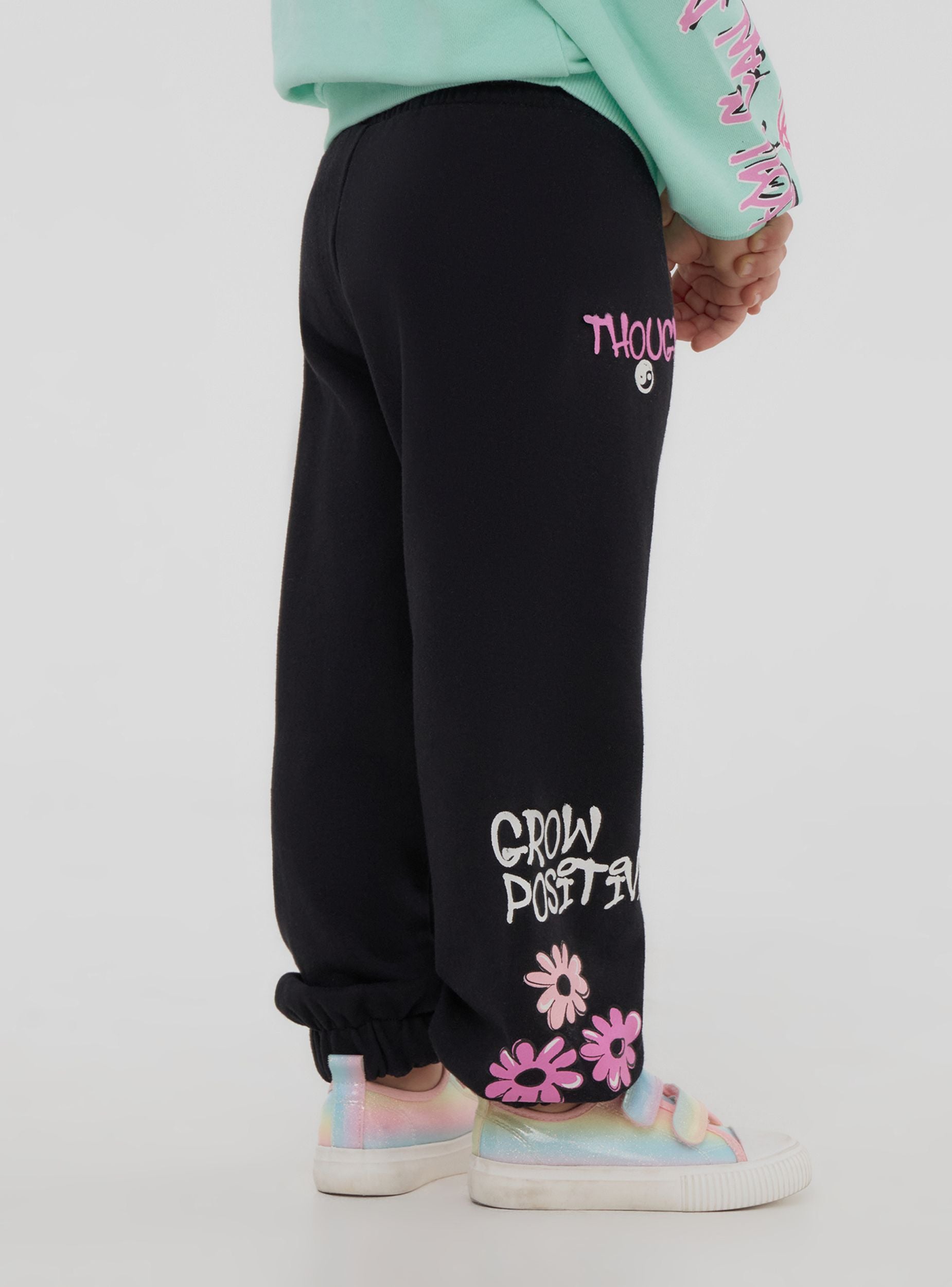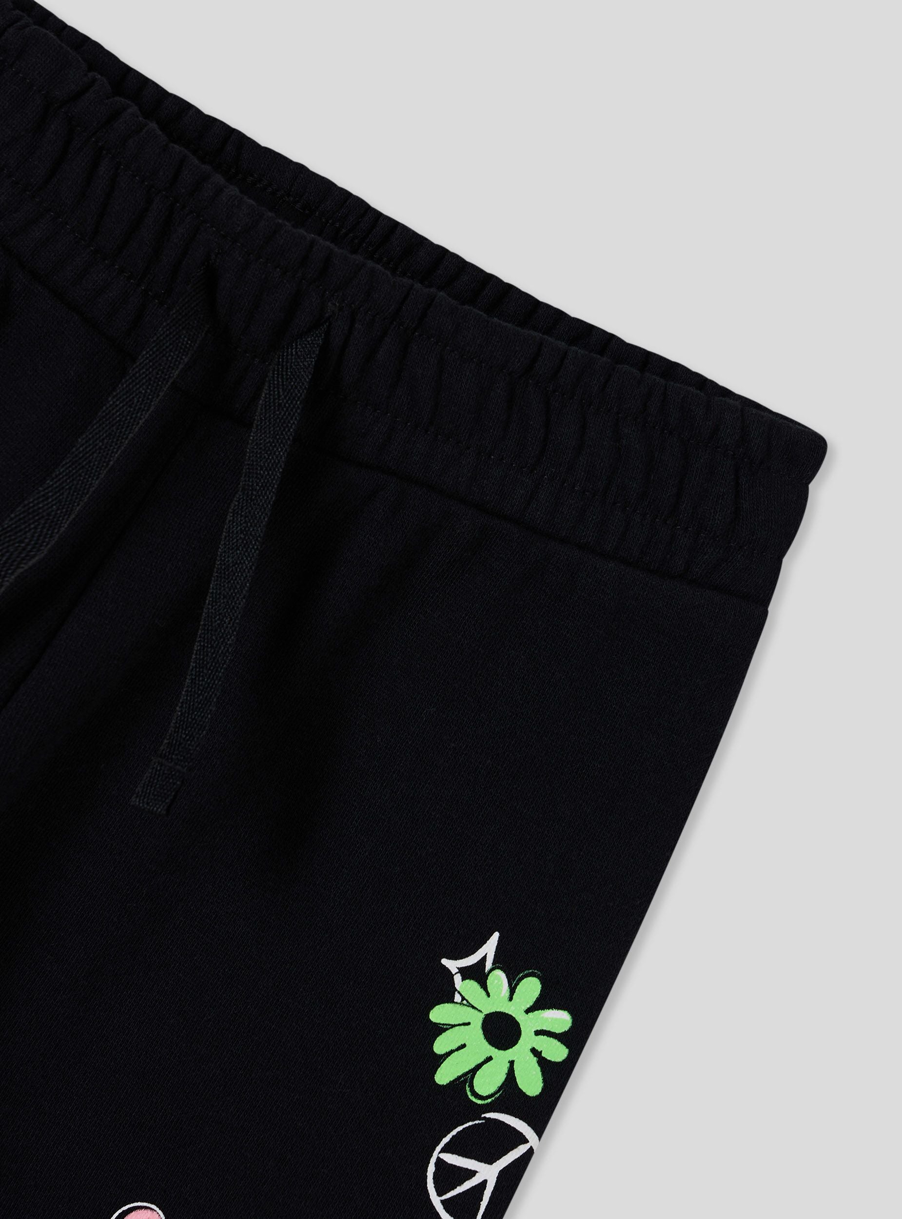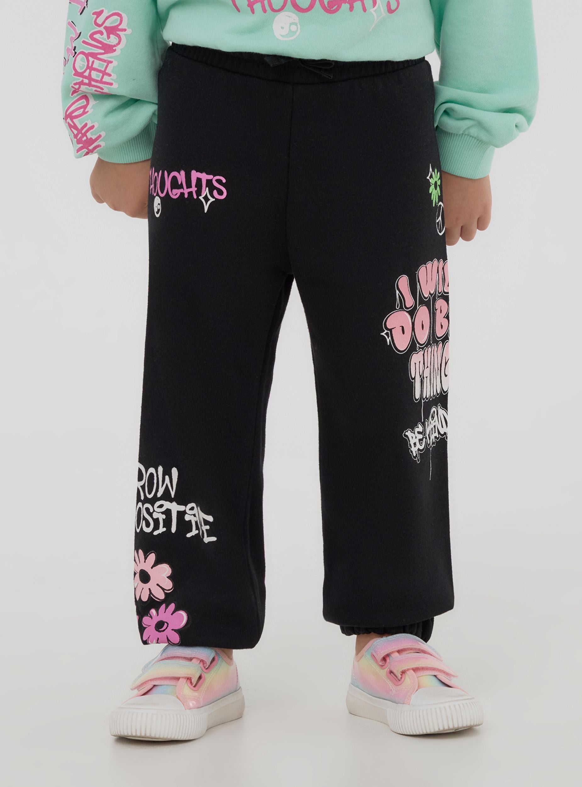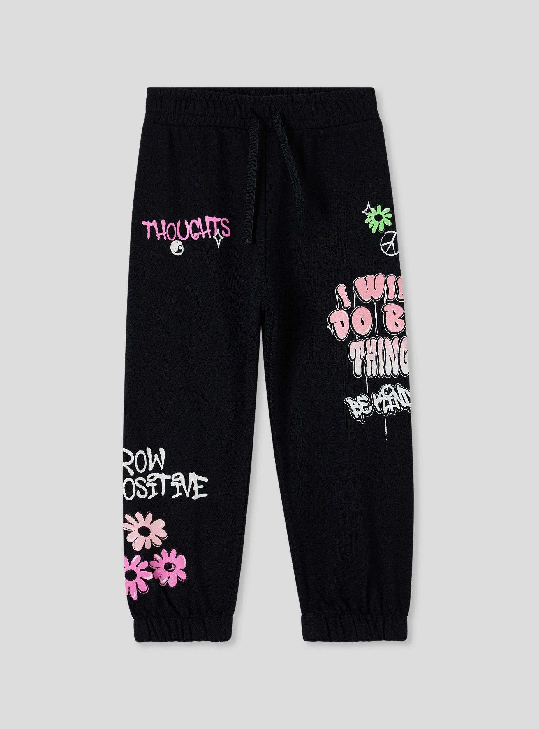 Pantaloni leggeri della tuta da bimba ideali per il tempo libero o per attività casual, caratterizzati da una comoda vestibilità. Modello lungo con pratica coulisse regolabile in vita per il massimo comfort. Decorati con vivaci stampe in stile graffiti, aggiungono un tocco moderno e creativo a ogni outfit.Dettagli