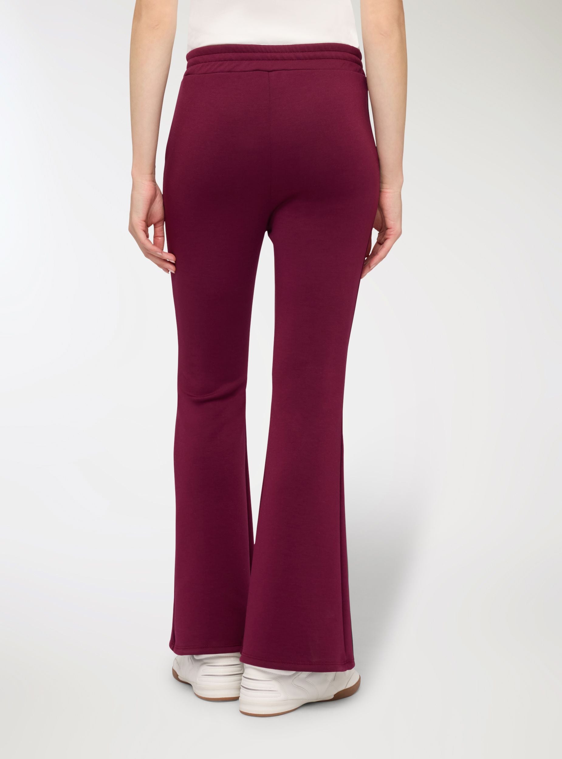 Pantaloni tuta da donna a tinta unita con vita elasticizzata e gamba svasata. Il modello lungo presenta cuciture centrali effetto piega e tasche laterali a filetto, ideali per donare un tocco curato anche ai look informali. Perfetti per il tempo libero o per viaggiare, si abbinano facilmente a felpe over o magliette basic e sneakers, garantendo una vestibilità confortevole e uno stile disinvolto. Tessuto pesante.Dettagli