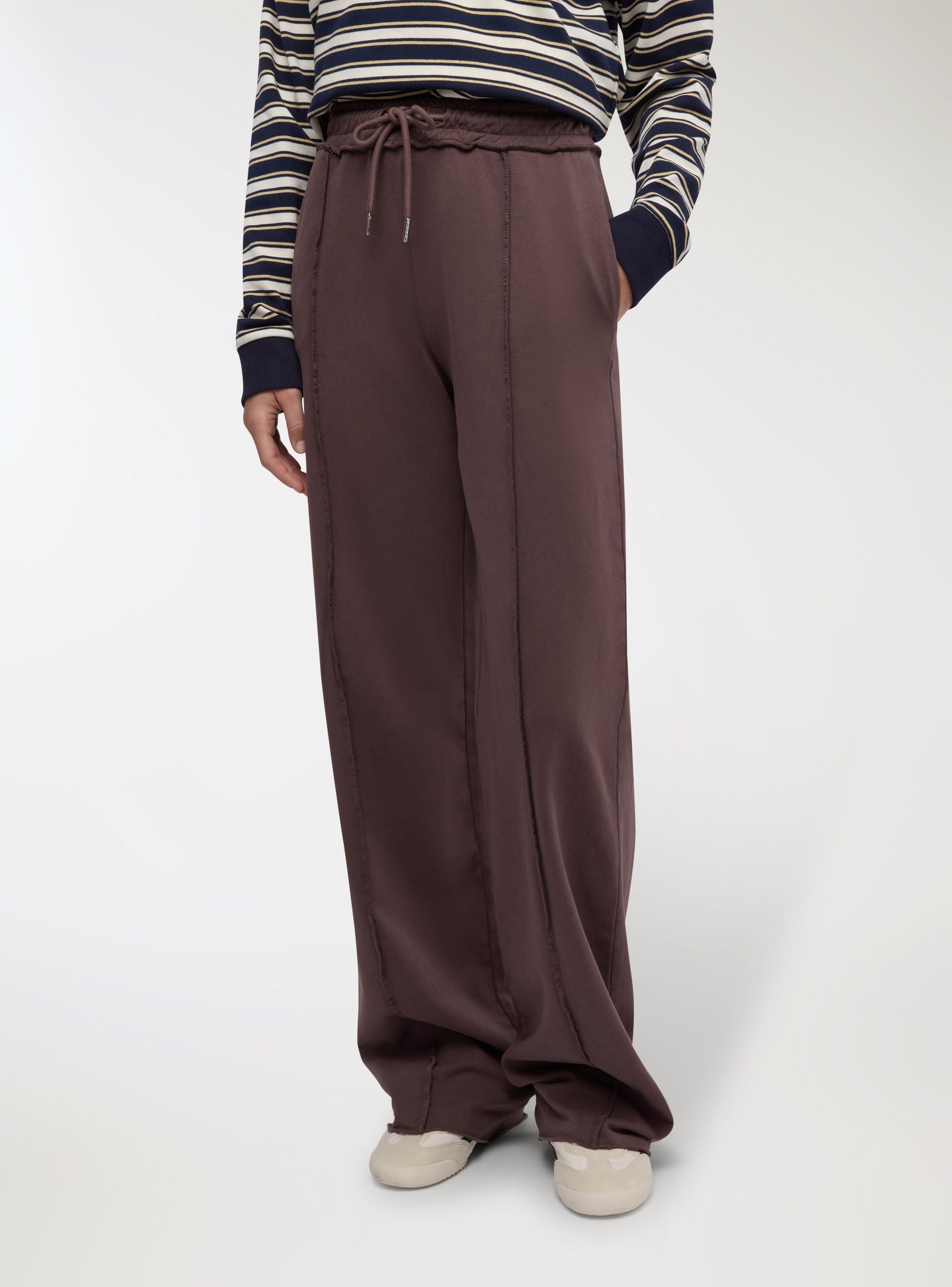 Pantaloni tuta da donna in tinta unita con vestibilità ampia e gamba wide leg. Vita elasticizzata con coulisse e dettagli di nervature sul davanti che slanciano la linea. Lunghezza alla caviglia, ideali per il tempo libero o look casual in città. Facili da abbinare a felpe oversize o magliette e sneakers, offrono comfort quotidiano grazie alla costruzione con elastico e al design essenziale. Tessuto pesante.Dettagli