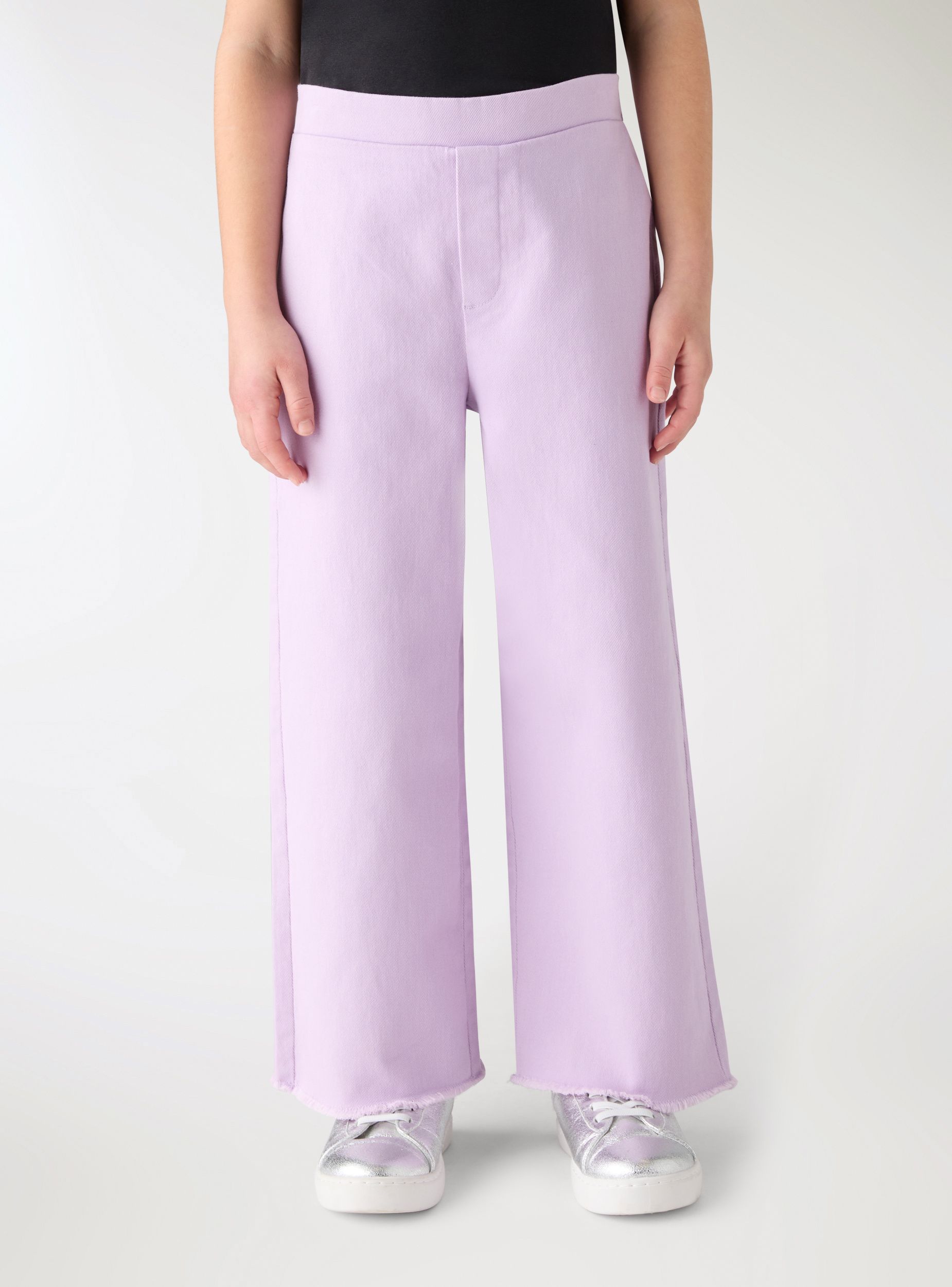 Pantaloni da bambina a tinta unita con taglio wide leg. Vita elastica per un comfort quotidiano. Orlo a taglio vivo che dona un tocco moderno. Ideali per la scuola e il tempo libero, si abbinano a maglietta e sneakers o a una felpa leggera. Vestibilità comoda e silhouette dritta ampia, perfetta per outfit casual e trendy.Dettagli
