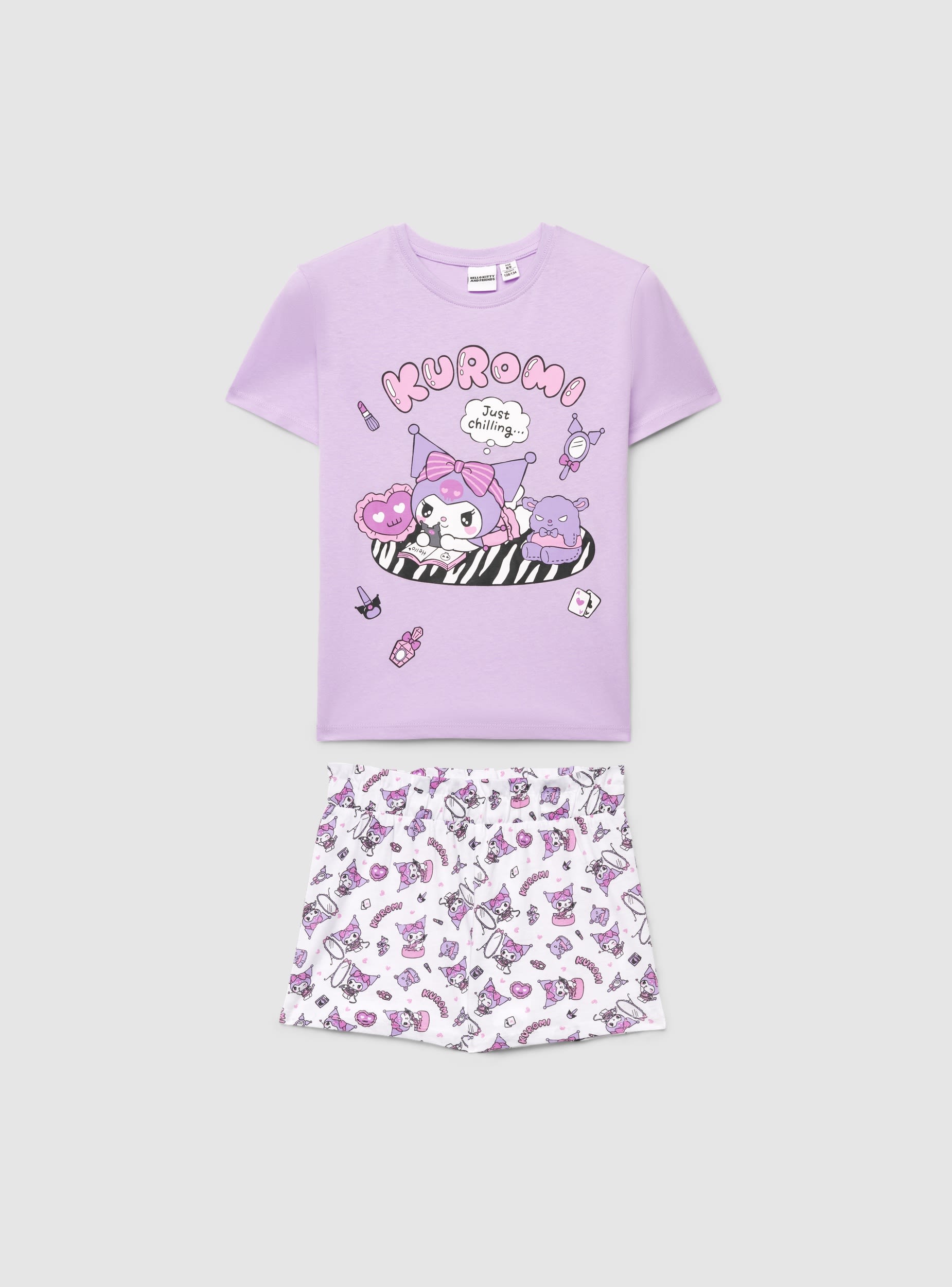 Pigiama da bambina con maglietta a maniche corte e girocollo, rifinita con stampa e scritta Kuromi® sul davanti. Shorts coordinati con fantasia all over e vita con elastico per una vestibilità comoda. Ideale per la notte e i momenti di relax, da abbinare a ciabatte o calze per un look da casa curato.Dettagli