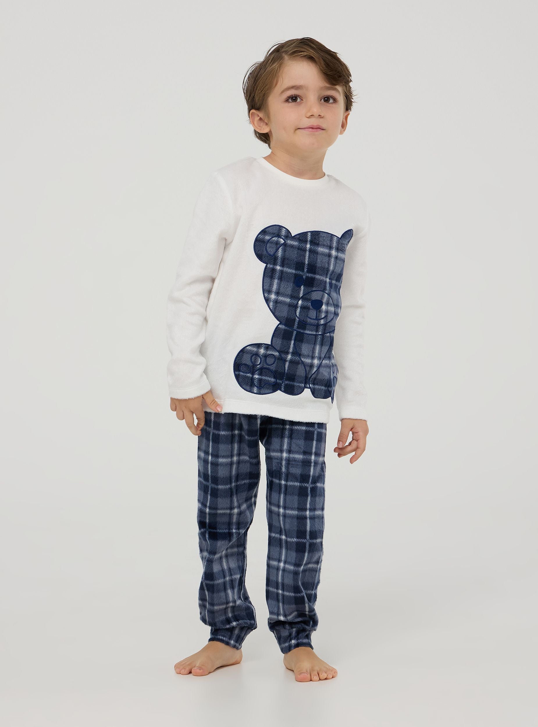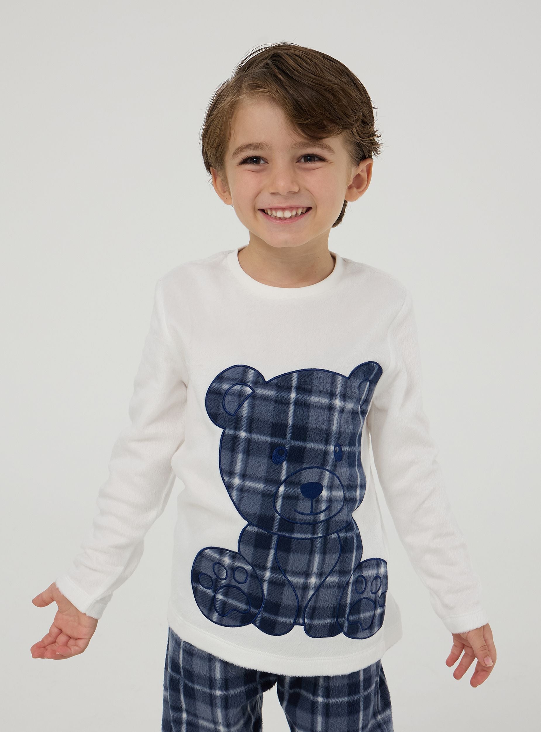 Pigiama bimbo perfetto per le notti invernali, composto da una maglia a maniche lunghe e pantaloni lunghi. La maglia presenta un simpatico orsetto in tessuto con fantasia tartan applicato aggiungendo un tocco di dolcezza e stile. I pantaloni, abbinati alla maglia, sono decorati con lo stesso motivo tartan, garantendo un look coordinato e alla moda. Questo pigiama offre comfort e calore. Perfetto per aggiungere un tocco di allegria e stile all'abbigliamento da notte.Dettagli