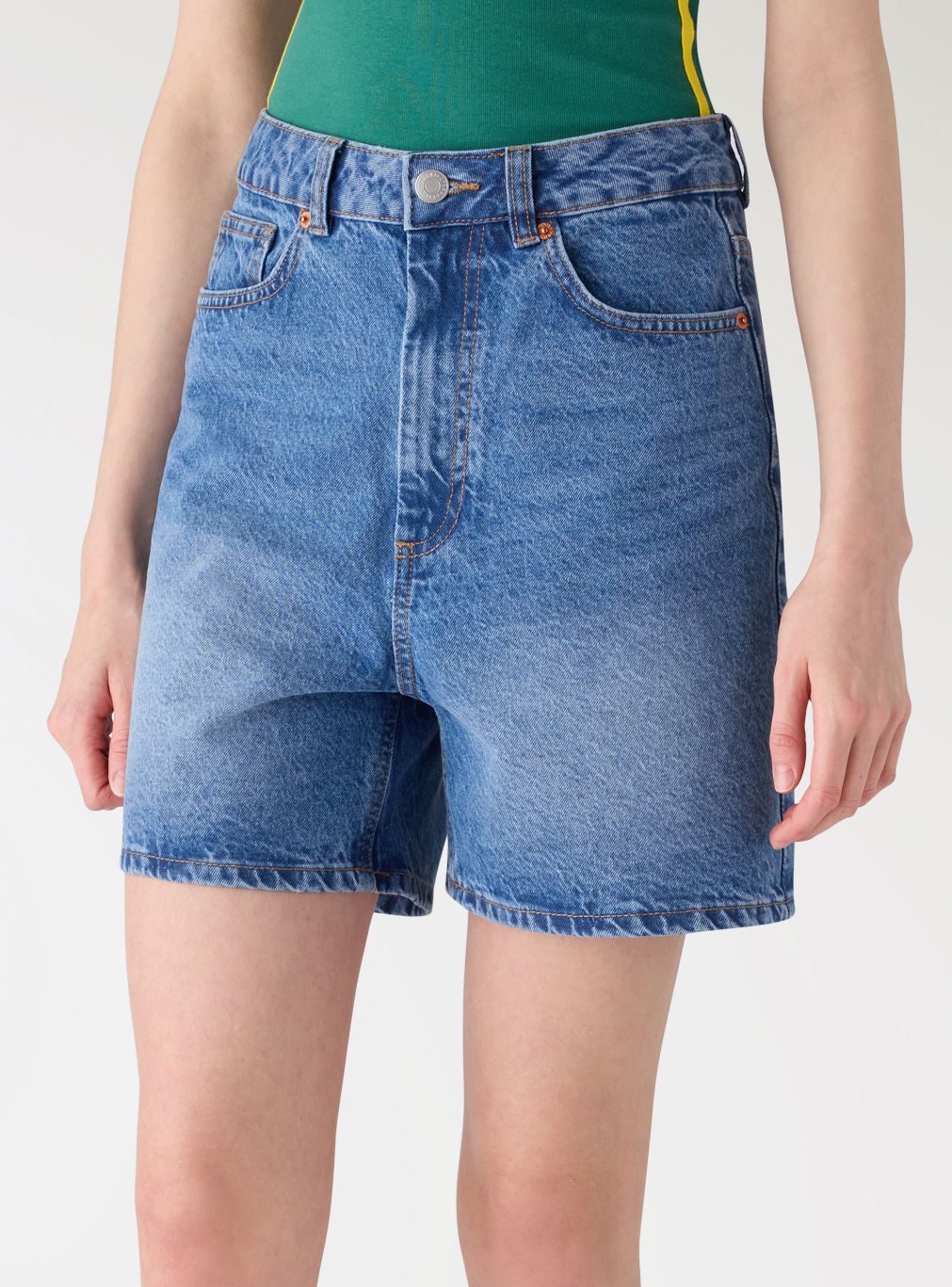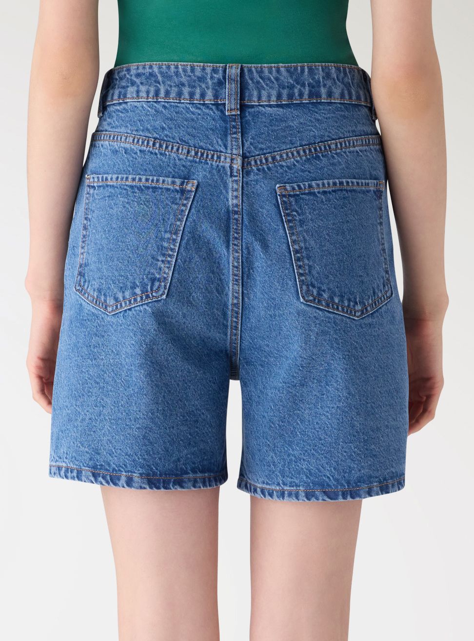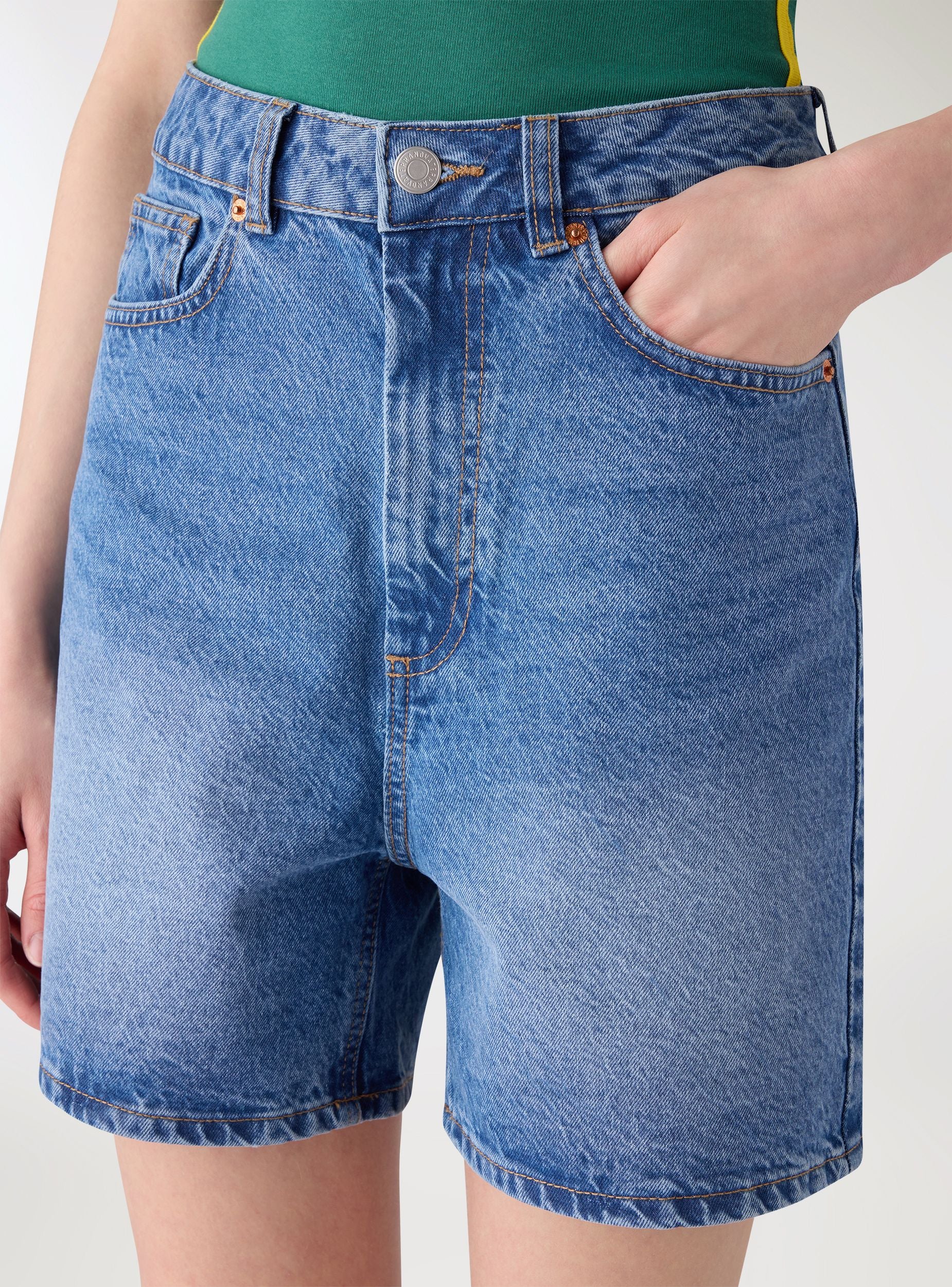Pantaloncini da donna modello bermuda in jeans, ideali per look urbani e da tempo libero. Vita alta con passanti e chiusura con bottone e zip, taglio dritto e fondo pulito per una vestibilità comoda. Design cinque tasche con taschino e cuciture a contrasto, perfetti con canotte, camicie over o blazer leggero e sneakers o sandali.Dettagli
