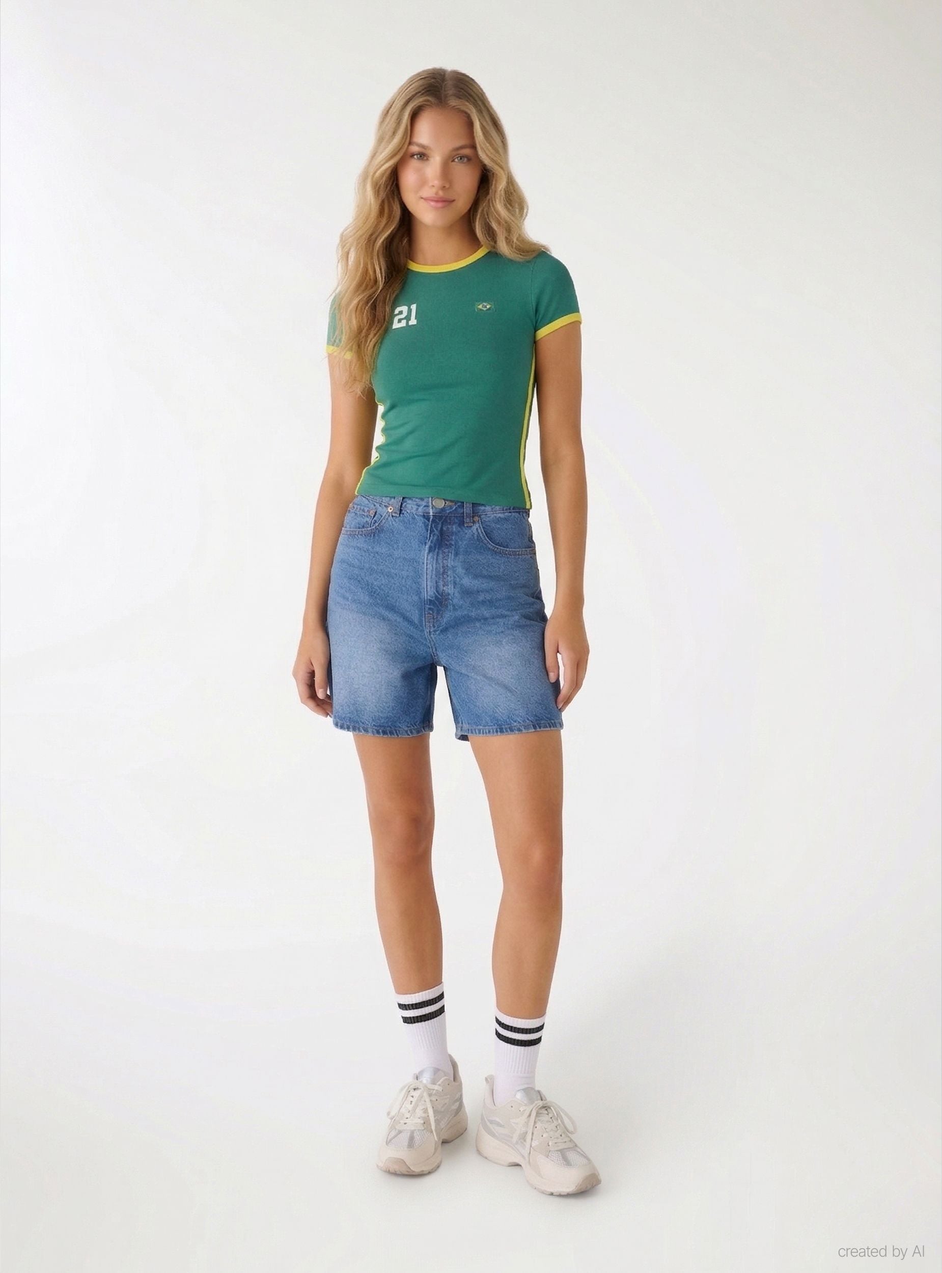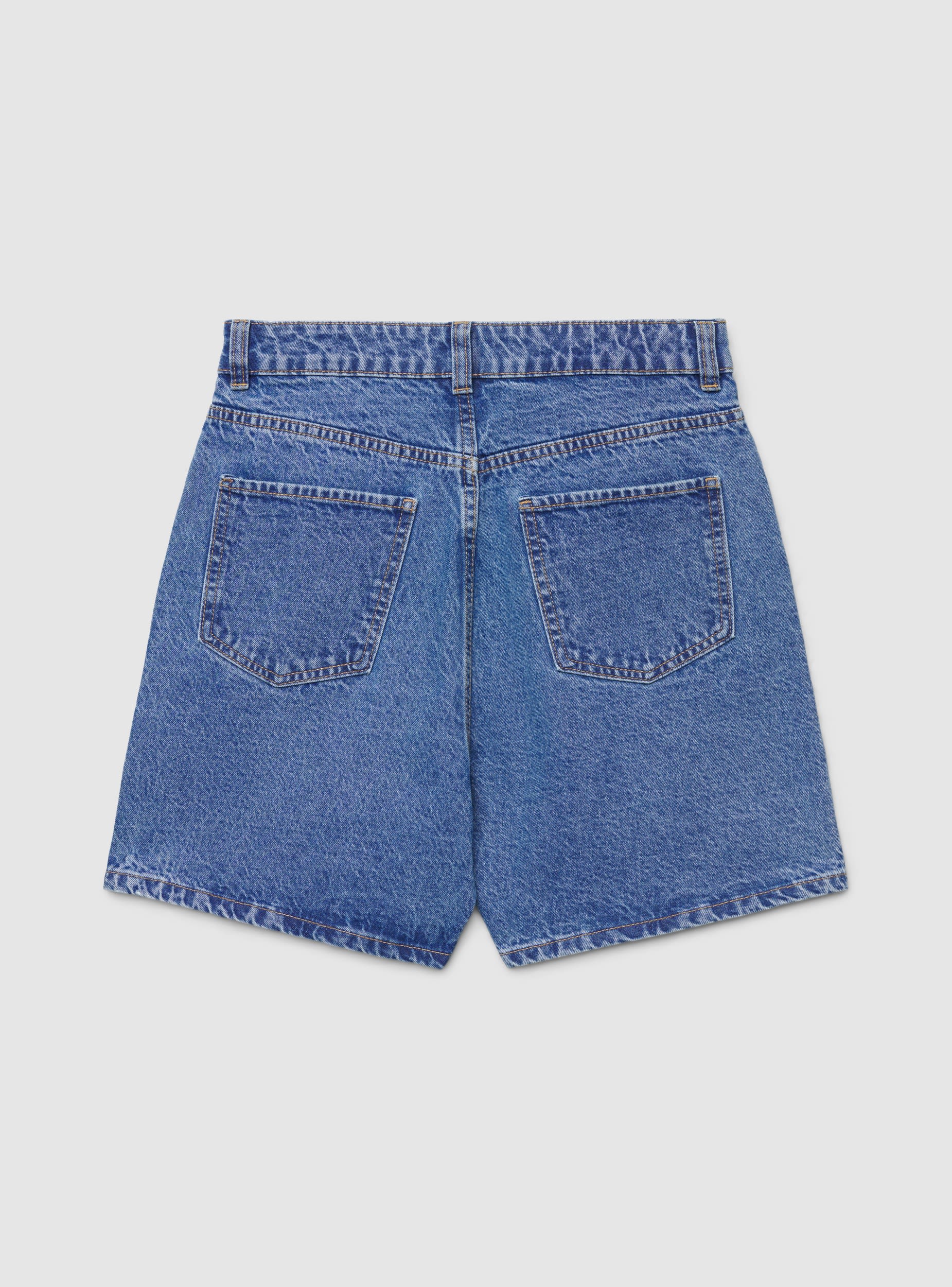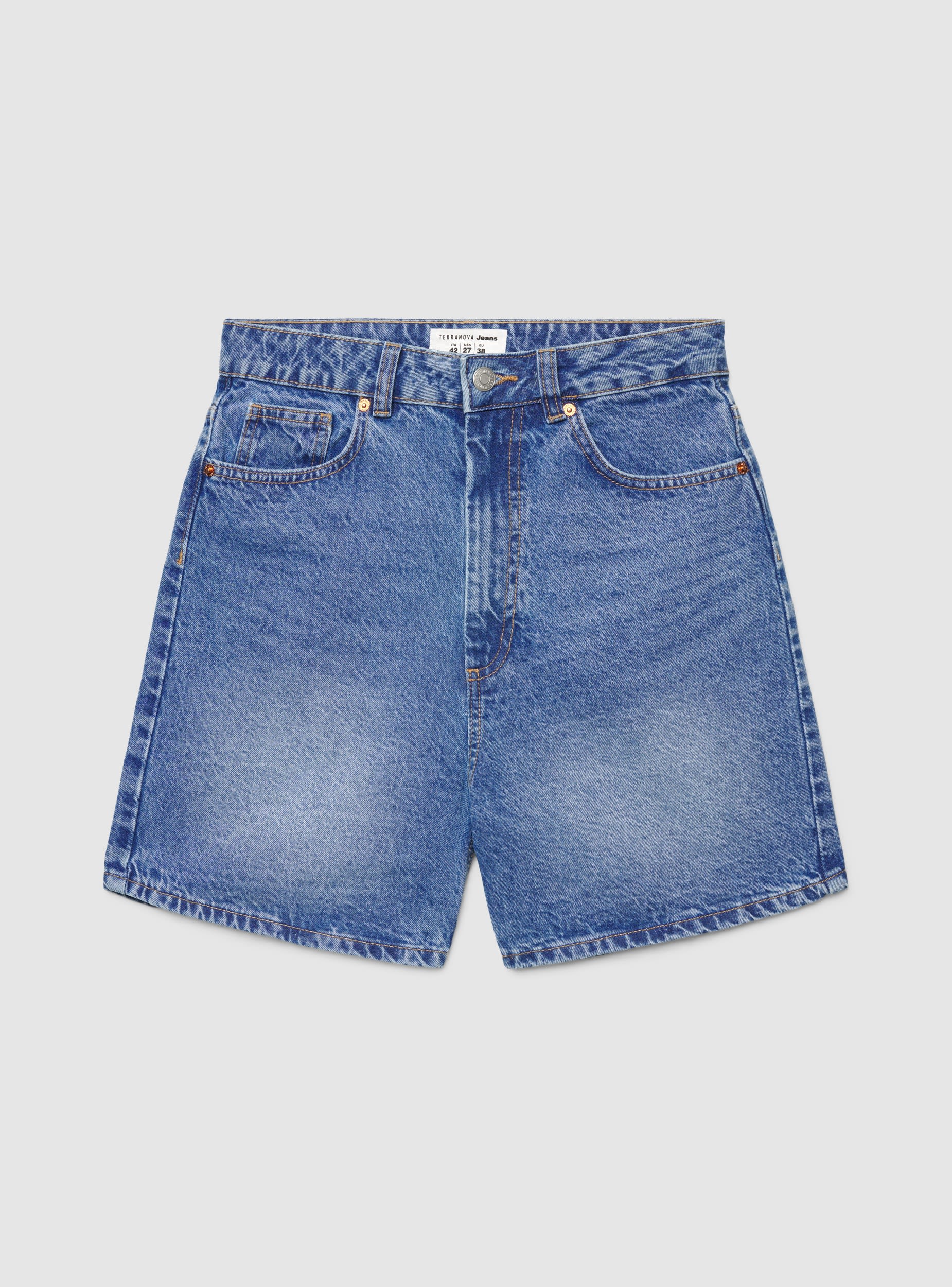 Pantaloncini da donna modello bermuda in jeans, ideali per look urbani e da tempo libero. Vita alta con passanti e chiusura con bottone e zip, taglio dritto e fondo pulito per una vestibilità comoda. Design cinque tasche con taschino e cuciture a contrasto, perfetti con canotte, camicie over o blazer leggero e sneakers o sandali.Dettagli