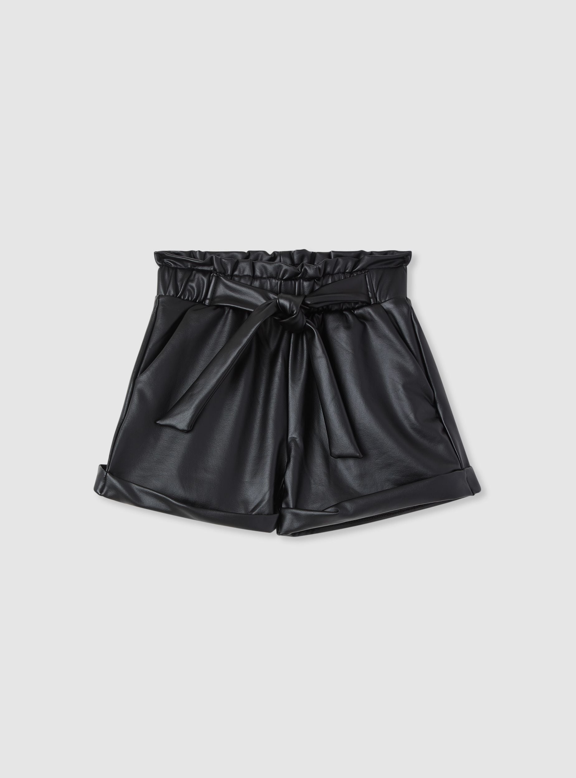 Pantaloncini da bambina con vita paperbag e cintura annodata, ideali per look urbani e per occasioni speciali. Design effetto pelle a tinta unita con risvolto al fondo e linea morbida che assicura comfort nei movimenti. Da abbinare a maglietta e sneakers di giorno o a una camicia per un outfit più curato.