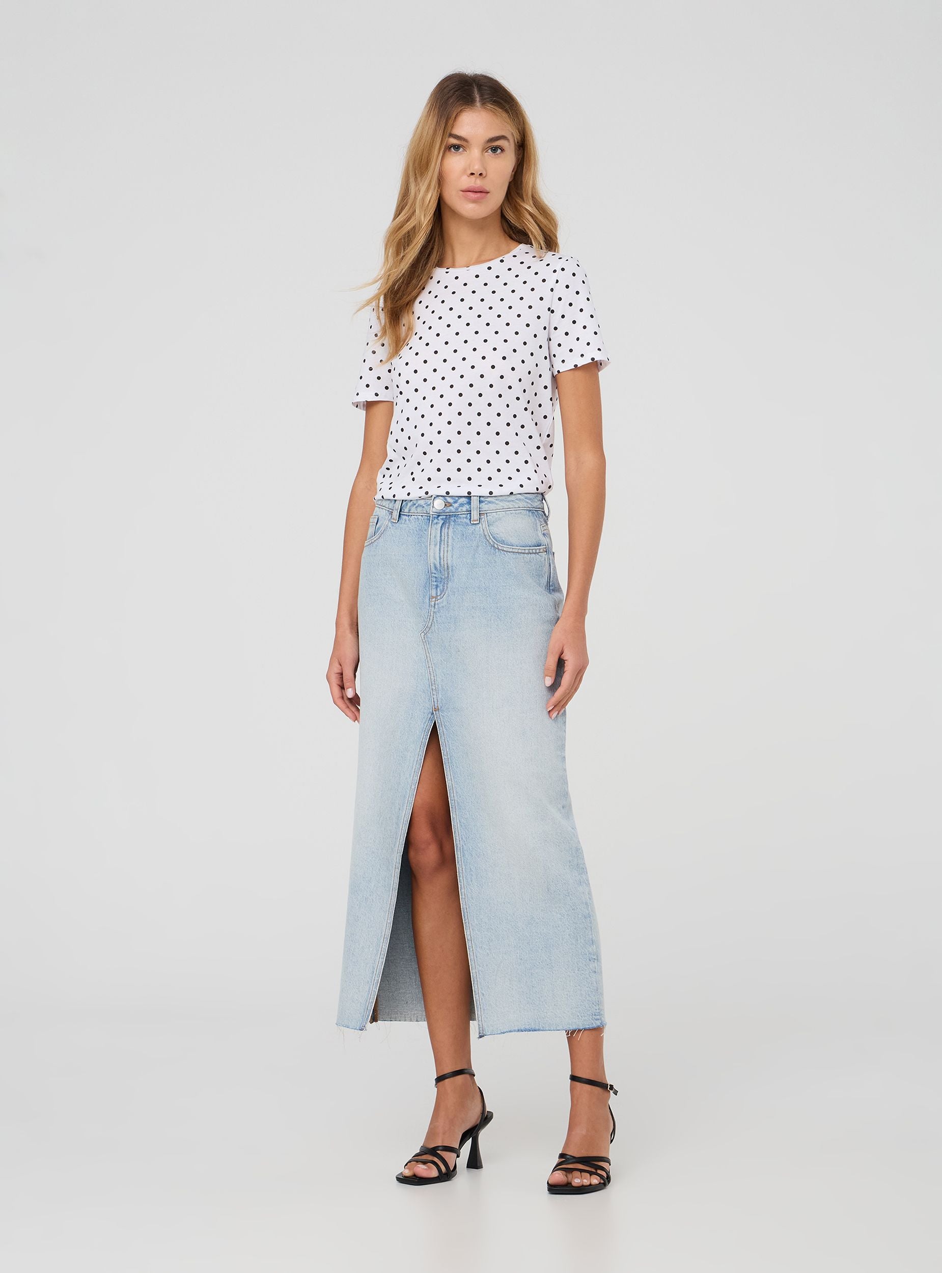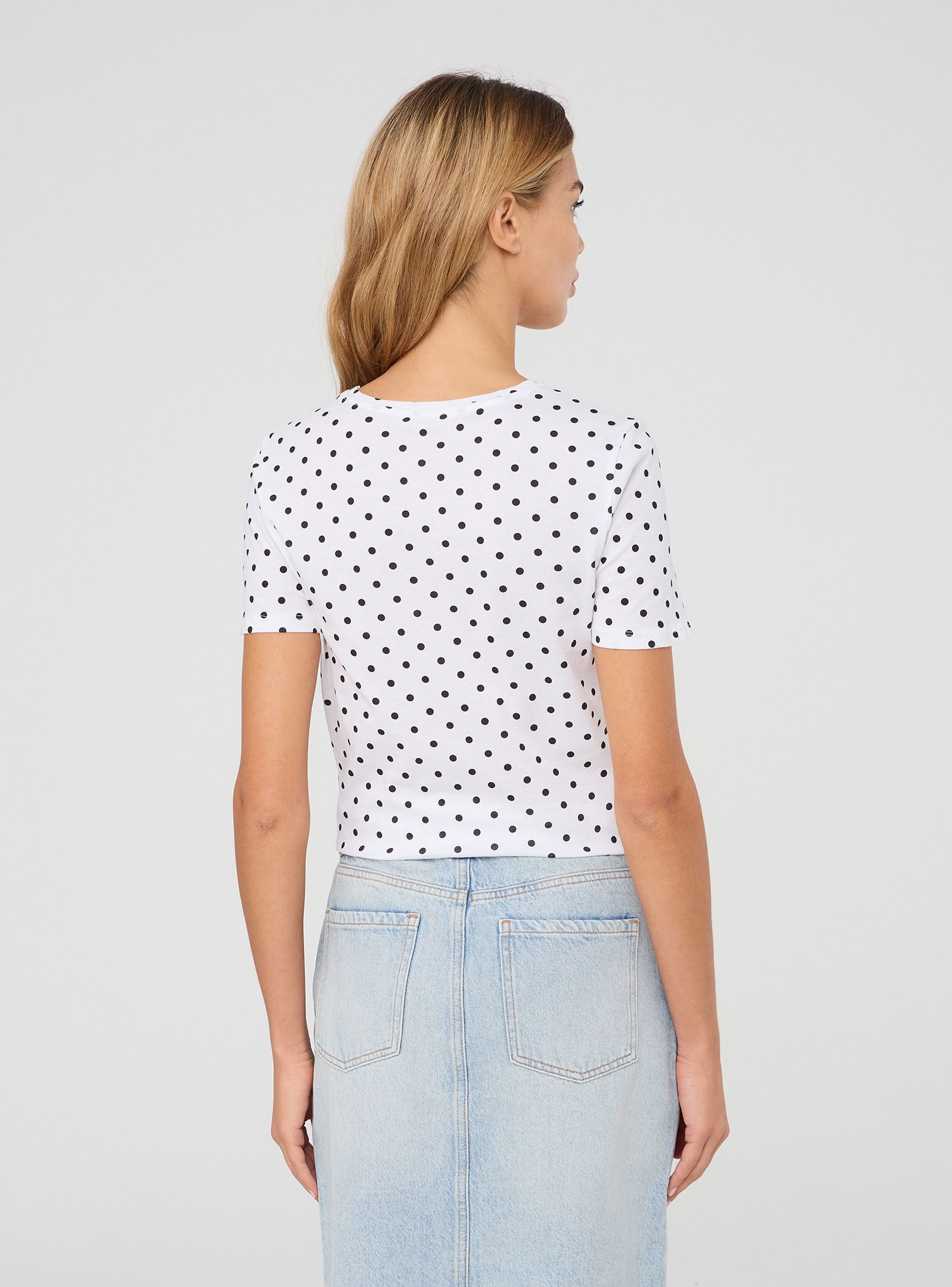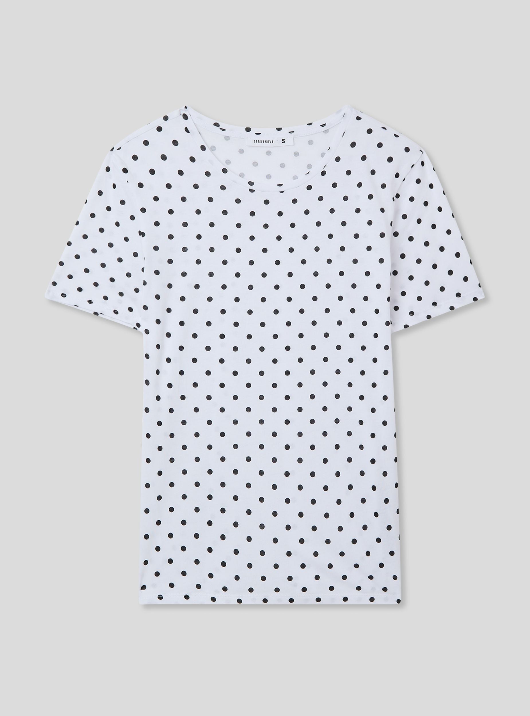 Maglietta da donna a maniche corte con stampa a pois. Il taglio regular offre una vestibilità comoda, perfetta per un look casual e versatile. Il motivo a pois dona un tocco retrò e vivace, ideale per essere abbinata a vari outfit, sia per il tempo libero che per un'occasione informale.Dettagli