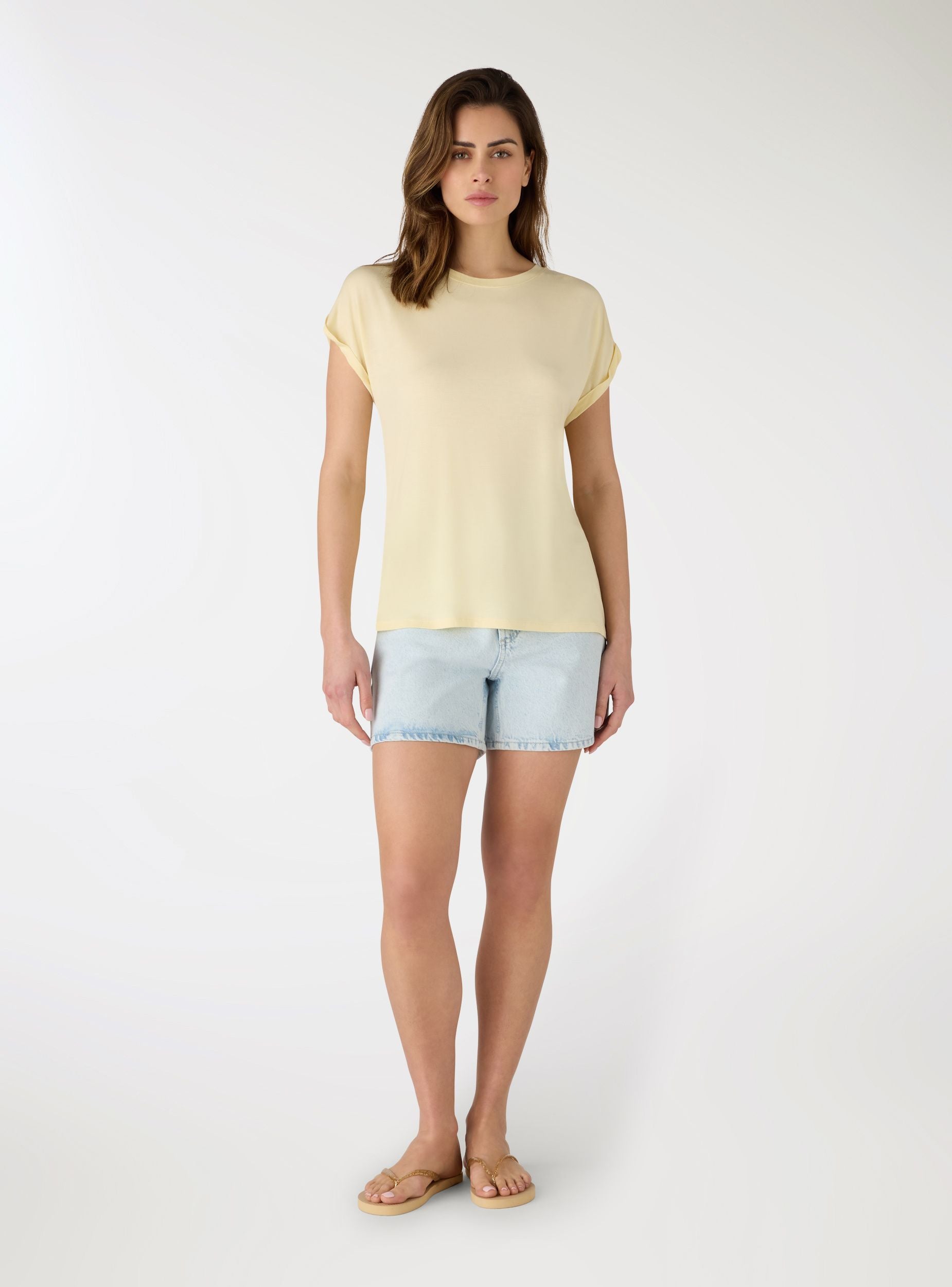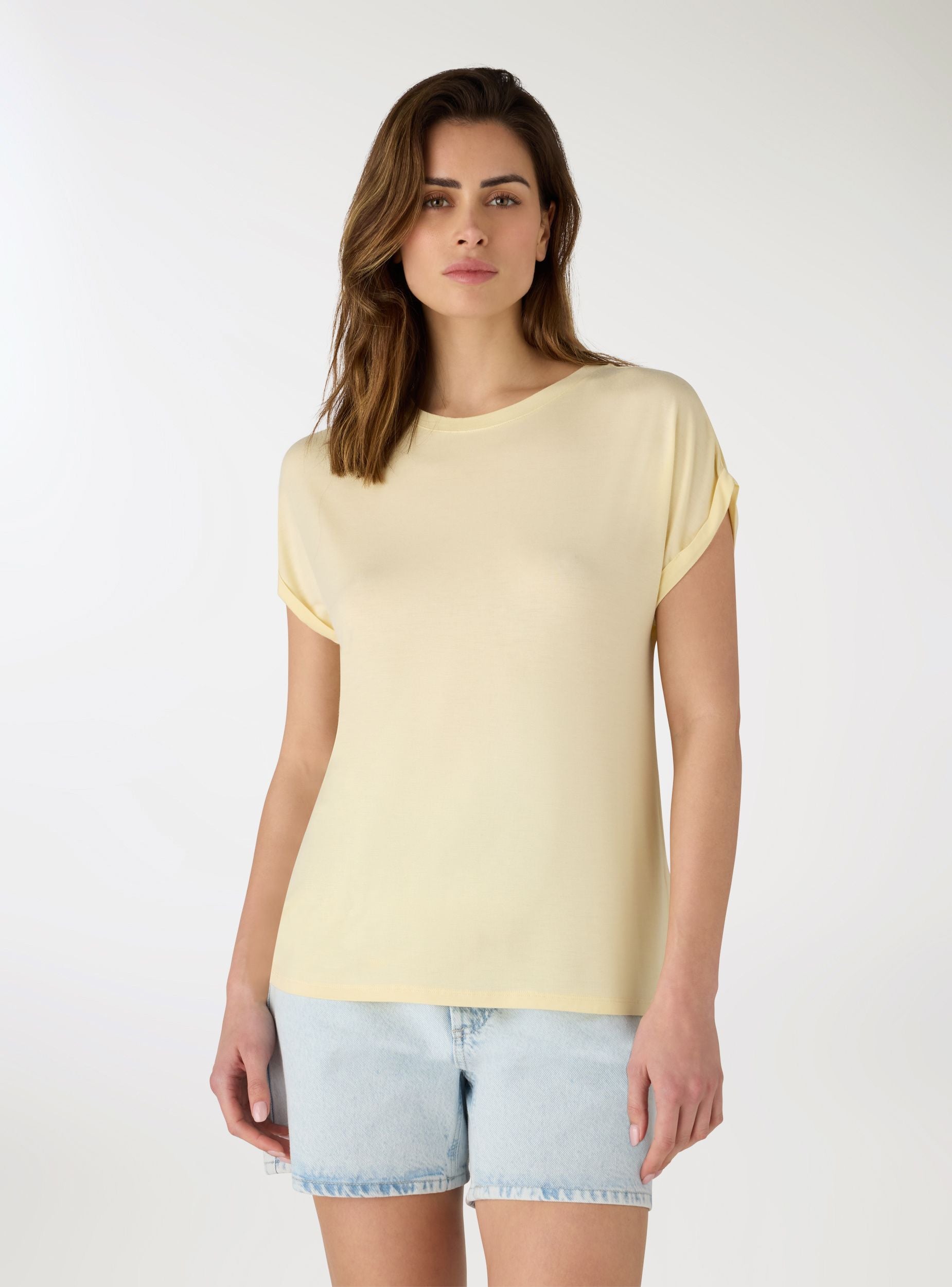 Maglietta da donna a tinta unita dal taglio ampio, ideale per look quotidiani e weekend. Girocollo pulito e maniche corte con piccolo risvolto per un tocco curato. Si abbina facilmente a jeans, pantaloni sartoriali o gonne, da indossare dentro o fuori per modulare la vestibilità con semplicità.