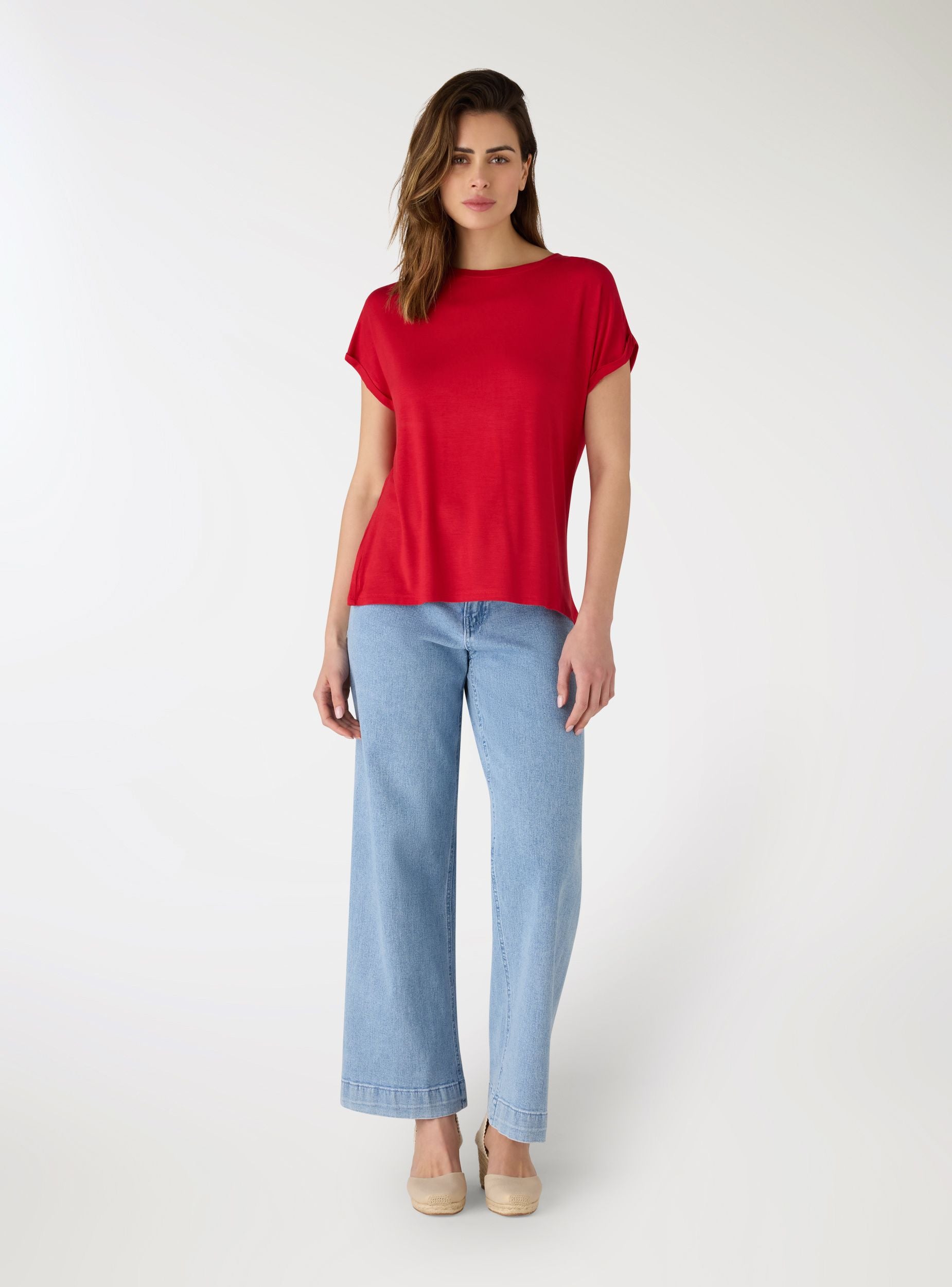 Maglietta da donna a tinta unita dal taglio ampio, ideale per look quotidiani e weekend. Girocollo pulito e maniche corte con piccolo risvolto per un tocco curato. Si abbina facilmente a jeans, pantaloni sartoriali o gonne, da indossare dentro o fuori per modulare la vestibilità con semplicità.Dettagli