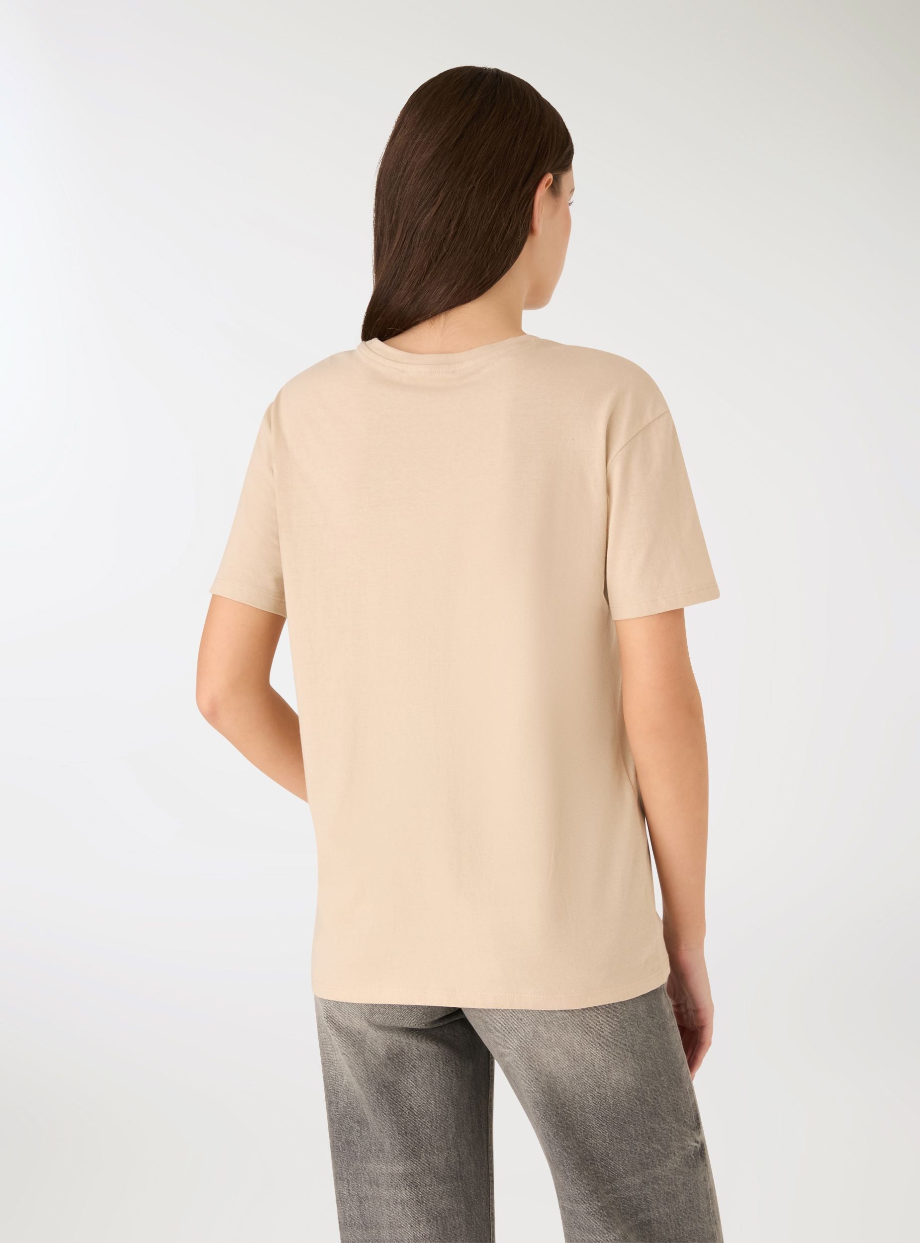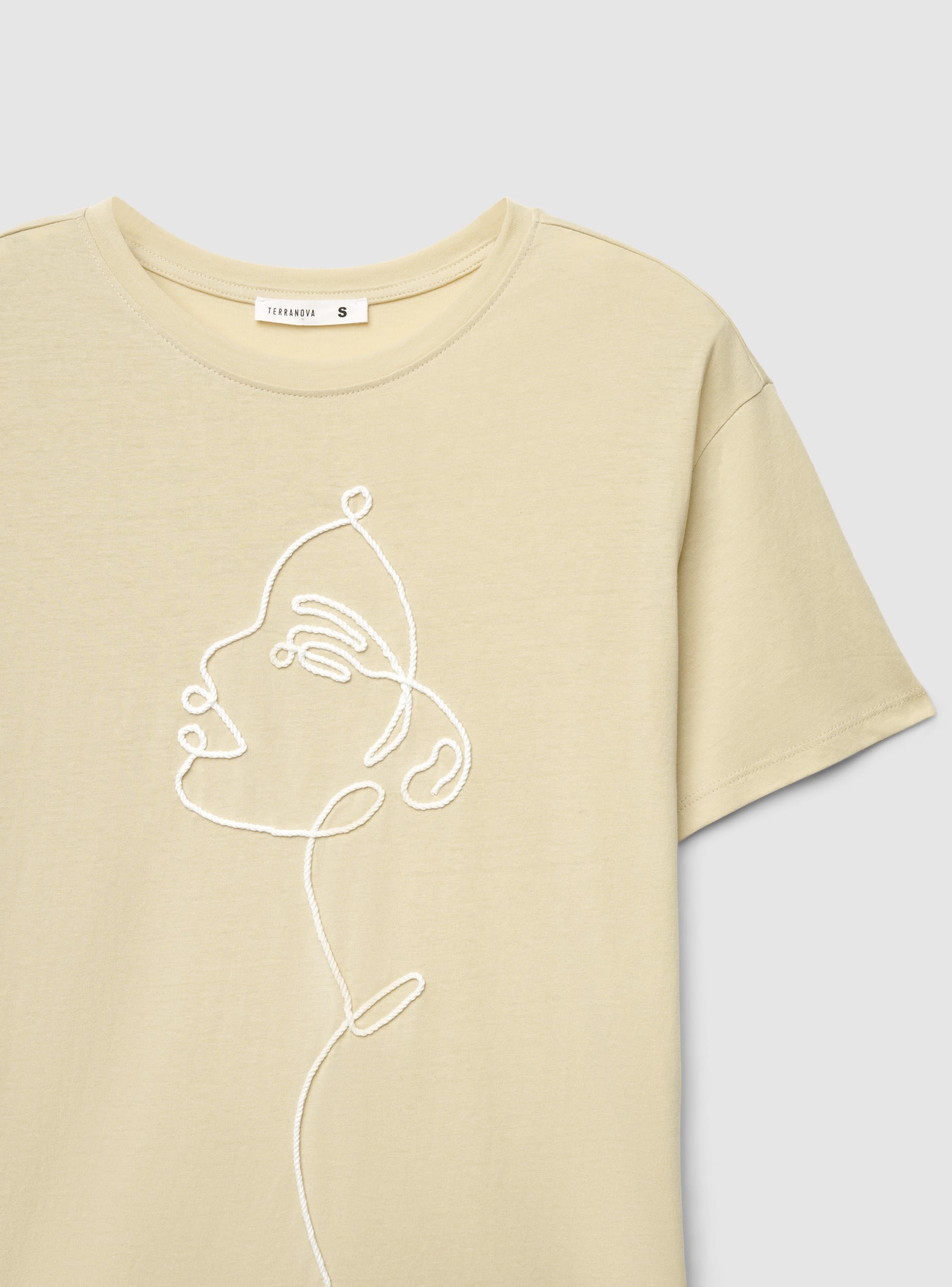 Maglietta da donna con girocollo e maniche corte, impreziosita da un ricamo a cordoncino che delinea un volto stilizzato sul davanti. Vestibilità regular e lunghezza standard, ideale per look casual di tutti i giorni. Facile da abbinare con jeans, pantaloni wide leg o una gonna midi. Design a tinta unita con dettaglio ricamato a contrasto che dona carattere al tuo outfit.Dettagli
