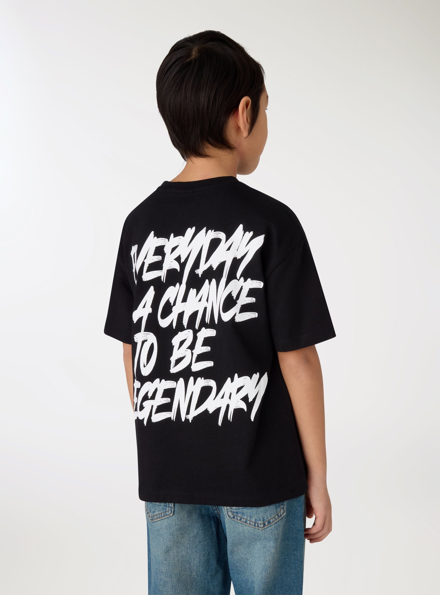 Maglietta da bambino con scritta frontale e maxi scritta sul retro. Girocollo e maniche corte, ideale per la scuola e il tempo libero. Vestibilità regular, facile da abbinare a jeans o pantaloncini e sneakers. Design essenziale con lettering a contrasto che aggiunge carattere ai look quotidiani.Dettagli