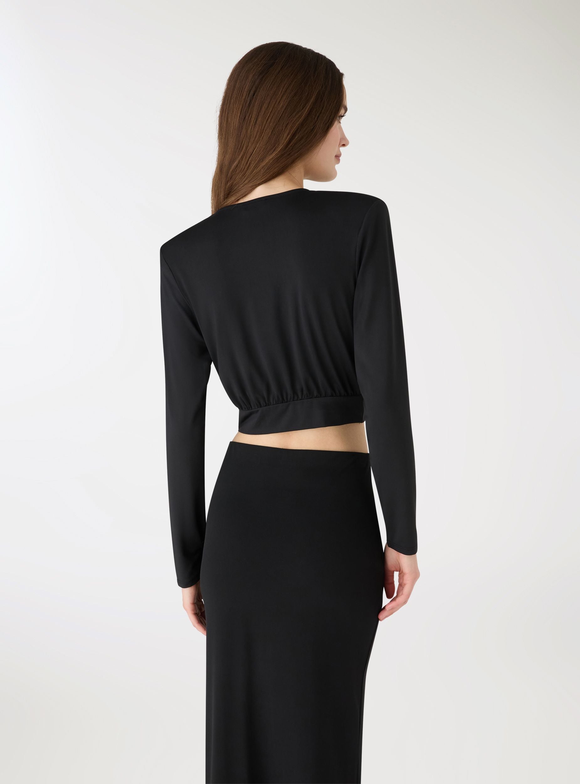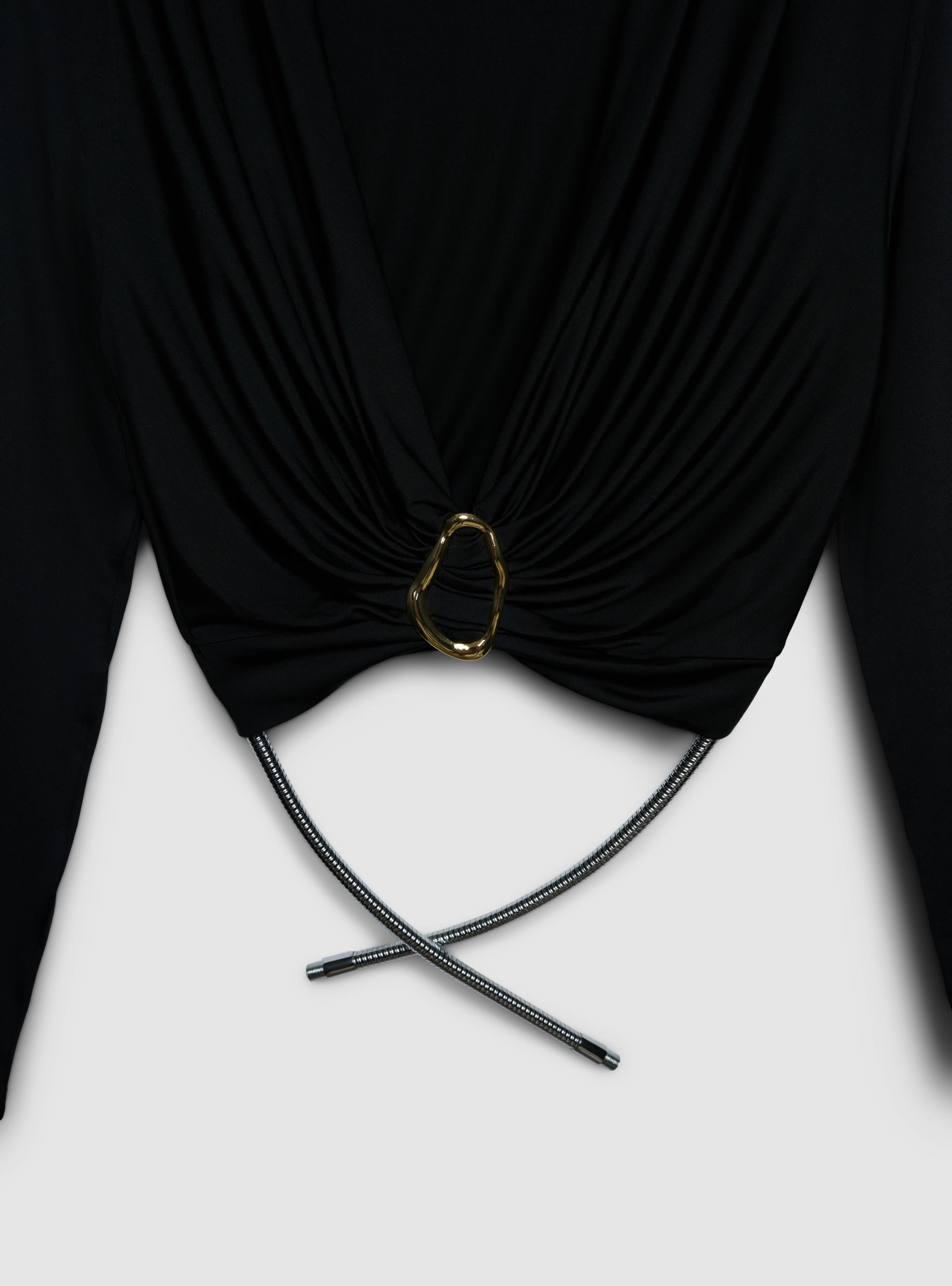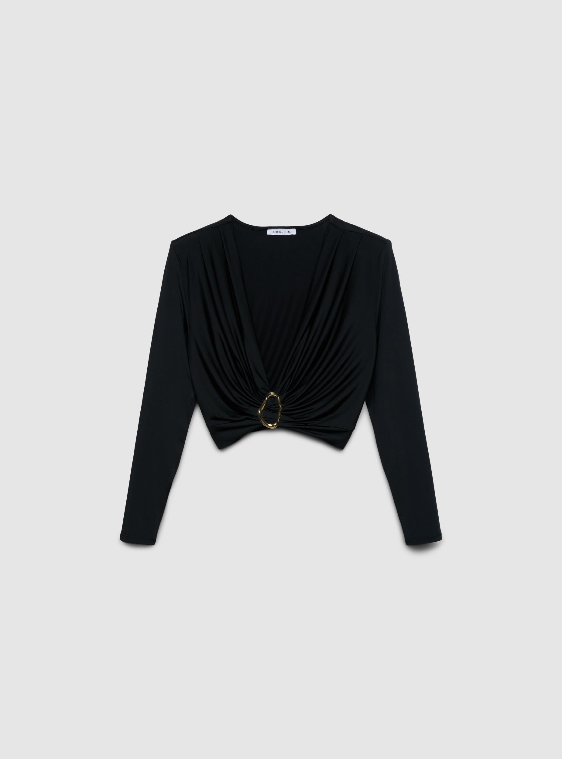 Maglietta da donna a maniche lunghe con vestibilità crop, perfetta per look serali o outfit trendy con jeans a vita alta o gonne midi. Davanti presenta scollo a V incrociato con arriccio e anello decorativo metallico, mentre il retro è liscio. Design a tinta unita.Dettagli