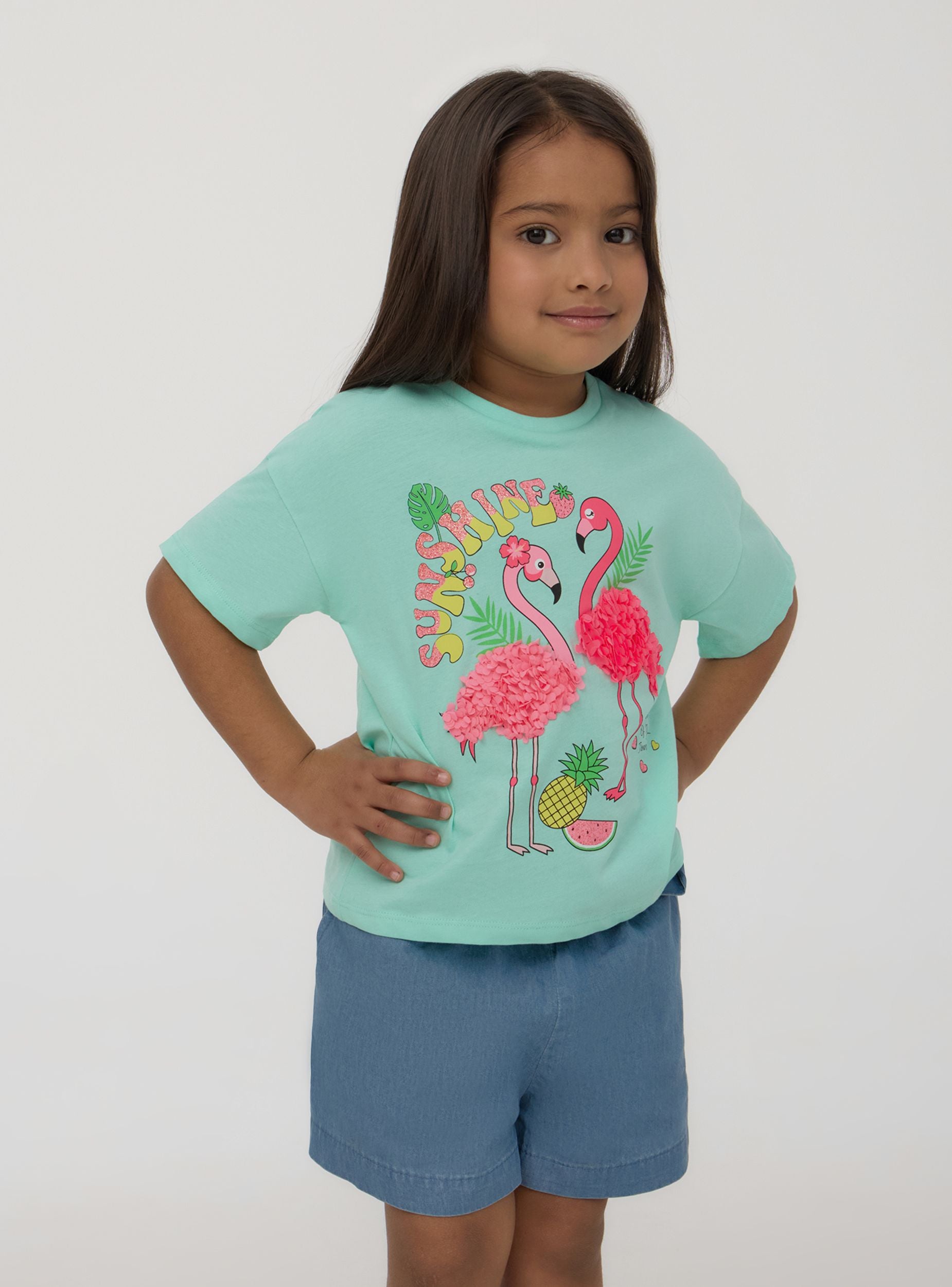 Maglietta da bimba ideale per un look casual e vivace, perfetta per il tempo libero o per un outfit informale. Modello con maniche corte e girocollo. Caratterizzata da una vestibilità crop e un design che presenta una stampa colorata di fenicotteri con applicazioni. Una scelta divertente e alla moda per varie occasioni.Dettagli