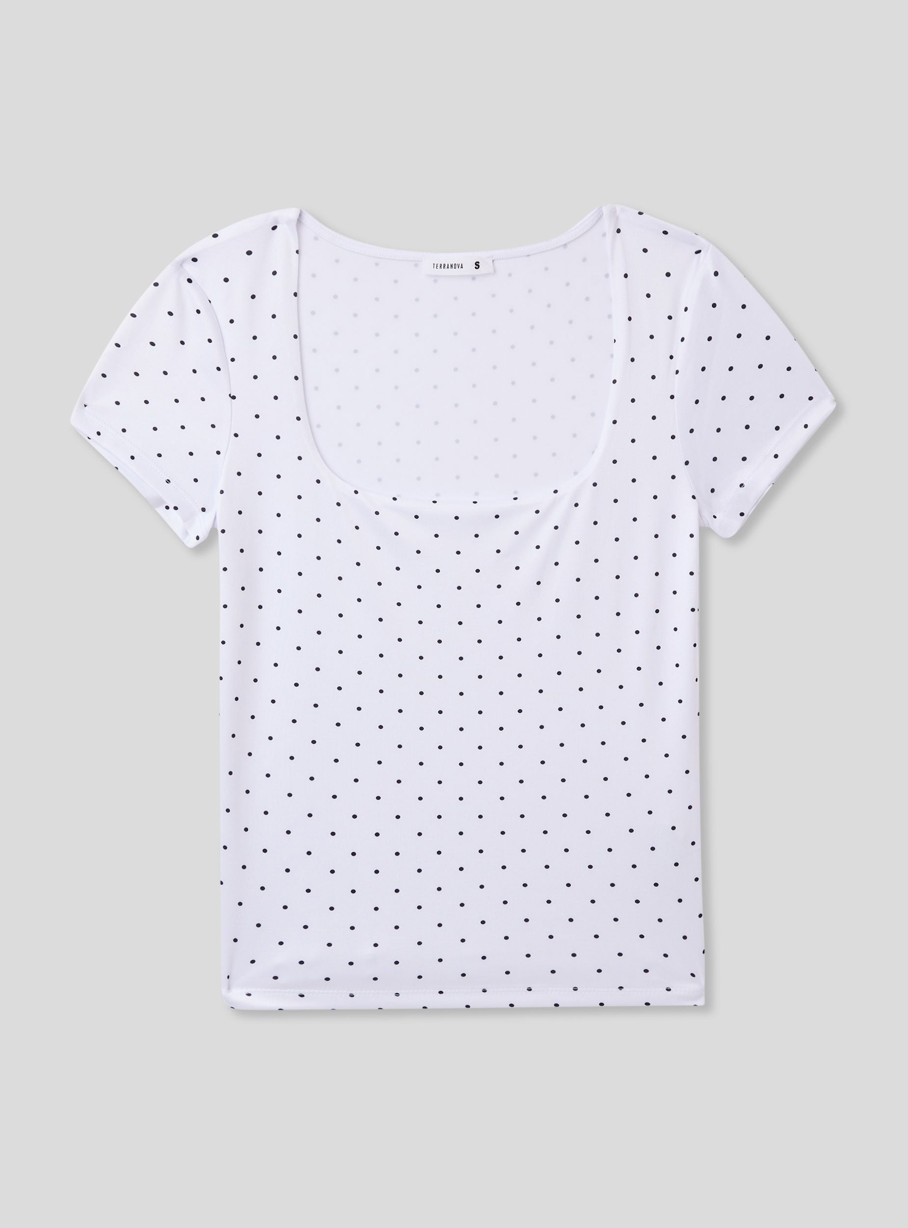 Maglietta da donna a maniche corte con un elegante scollo ampio squadrato. La fantasia a pois distribuita su tutta la superficie conferisce un aspetto vivace e senza tempo. Il capo è realizzato in tessuto elasticizzato, che offre una vestibilità aderente e confortevole, mantenendo una piacevole sensazione di leggerezza. Ideale per un look casual ma raffinato, la maglietta può essere abbinata a vari outfit, perfetta per aggiungere un tocco di stile retrò e chic.Dettagli