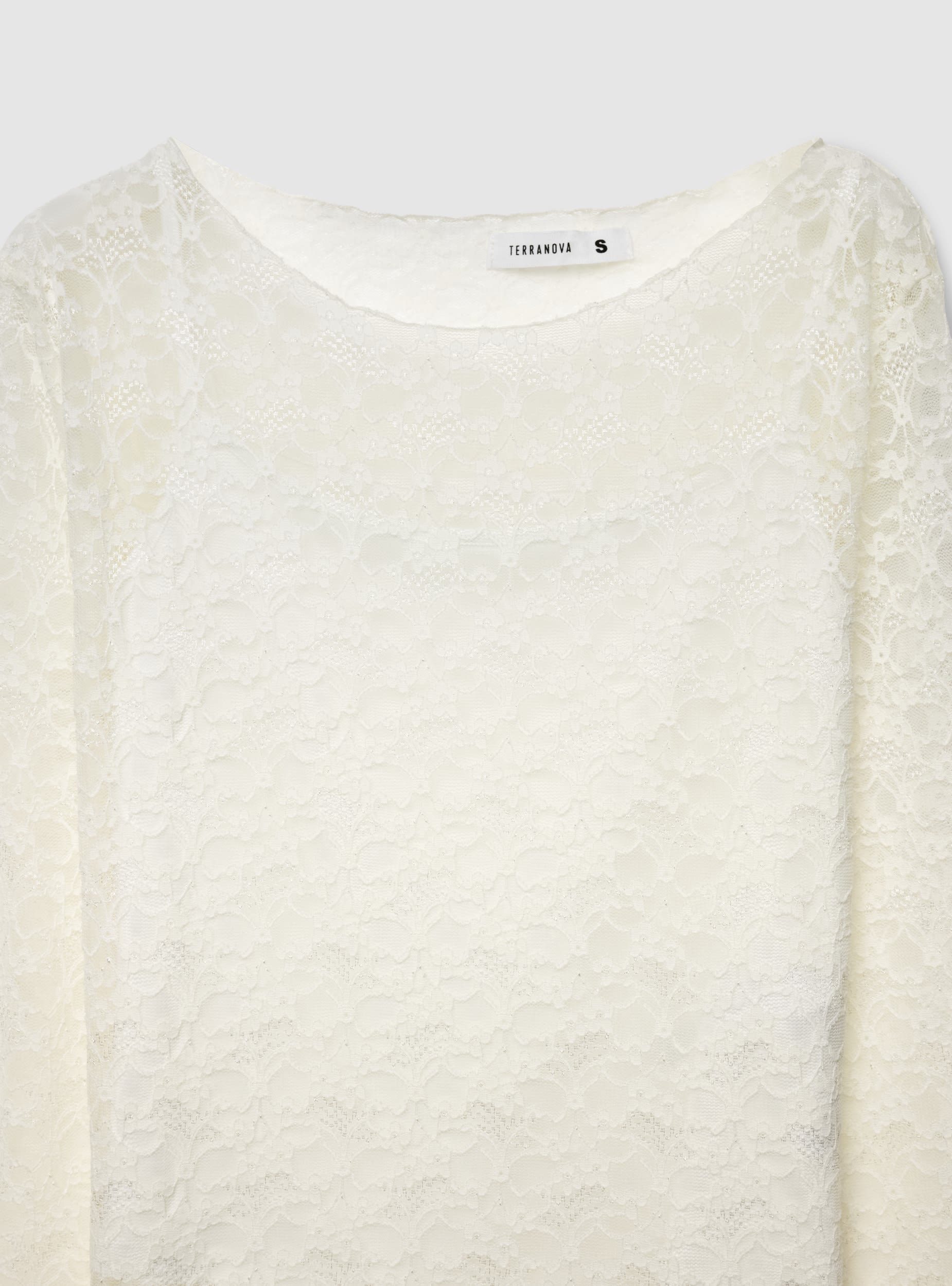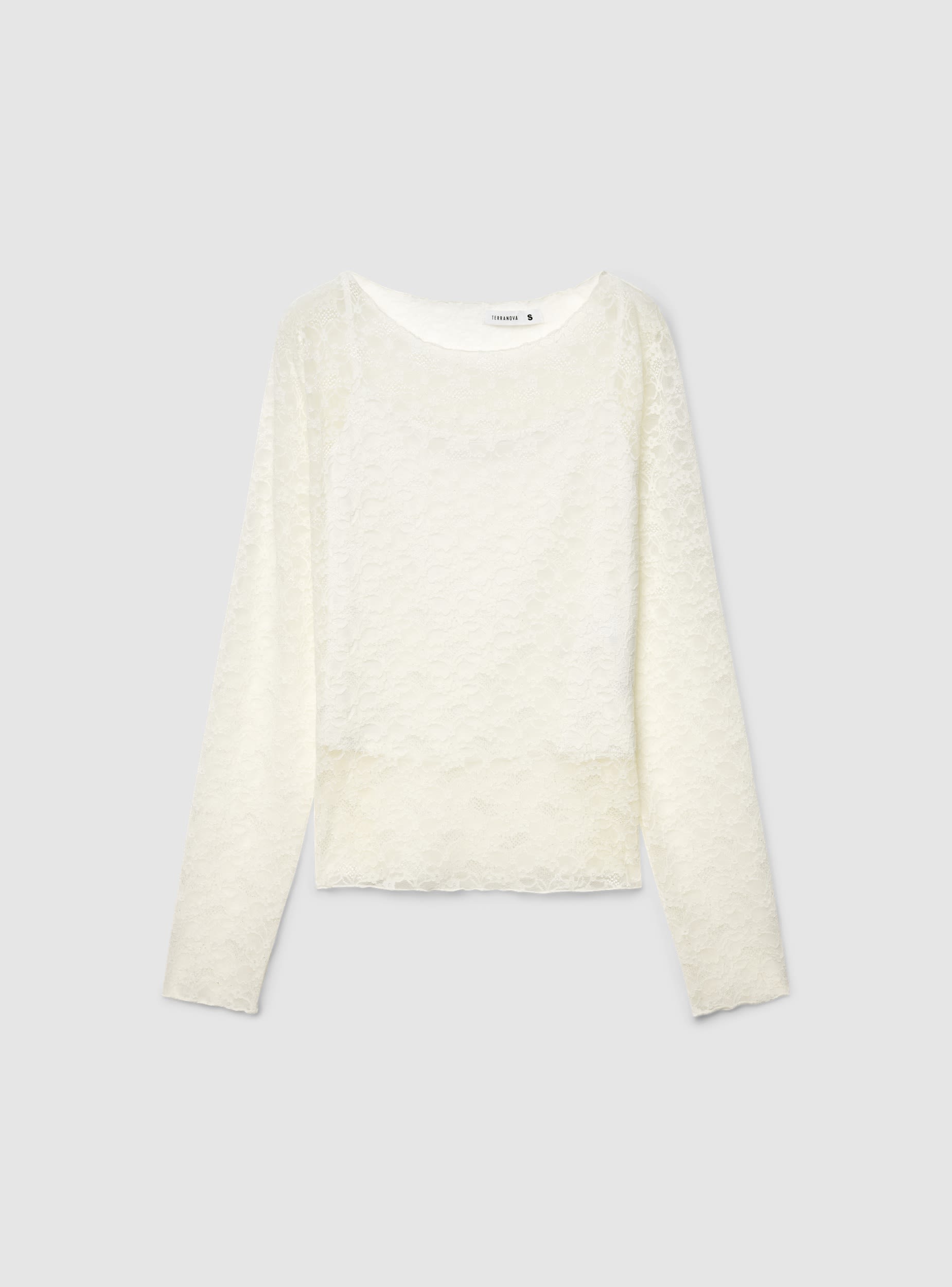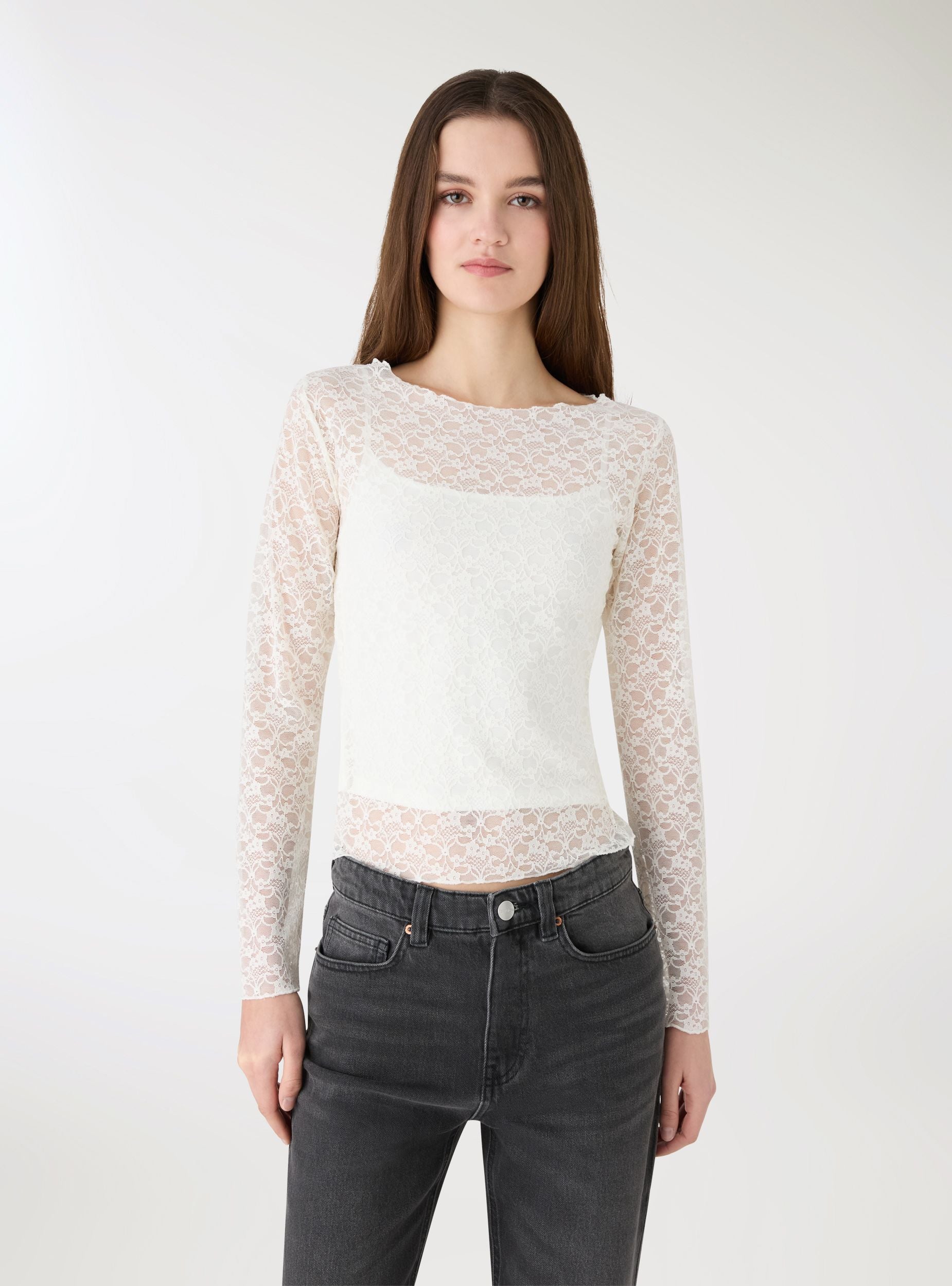 Maglietta da donna in pizzo con maniche lunghe e scollo a barchetta. Modello doppiato sul corpo per maggiore copertura, trasparente su spalle e maniche per un effetto raffinato. Vestibilità regular e lunghezza al fianco, ideale sotto blazer o cardigan per l’ufficio, così come con jeans o gonne per la sera. Design a tinta unita, senza chiusure, finiture delicate che valorizzano il look.Dettagli