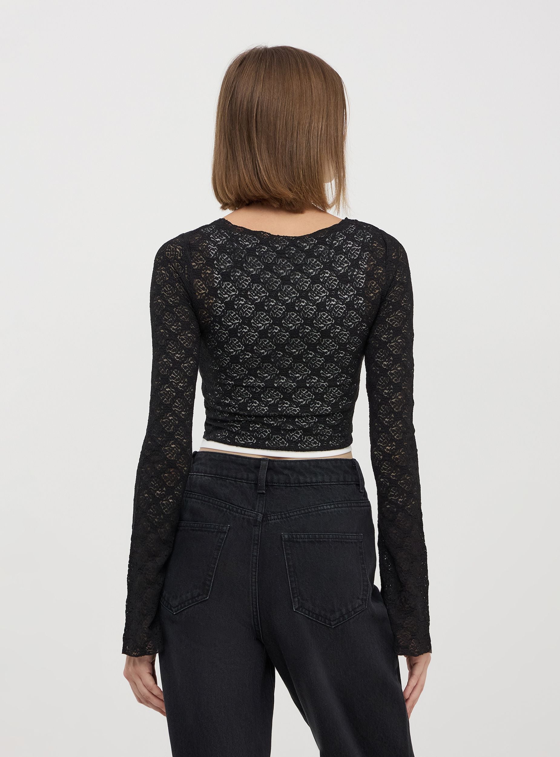 Maglia da donna a maniche lunghe, tessuto in pizzo a tinta unita. Questo capo presenta uno scollo ampio e una vestibilità crop, perfetta per creare outfit femminili e raffinati. Il tessuto in pizzo delicato dona un look romantico e sofisticato, ideale per le occasioni speciali o per aggiungere un tocco chic al tuo abbigliamento quotidiano. Abbinala a pantaloni a vita alta o gonne per un look alla moda e ricercato.Dettagli
