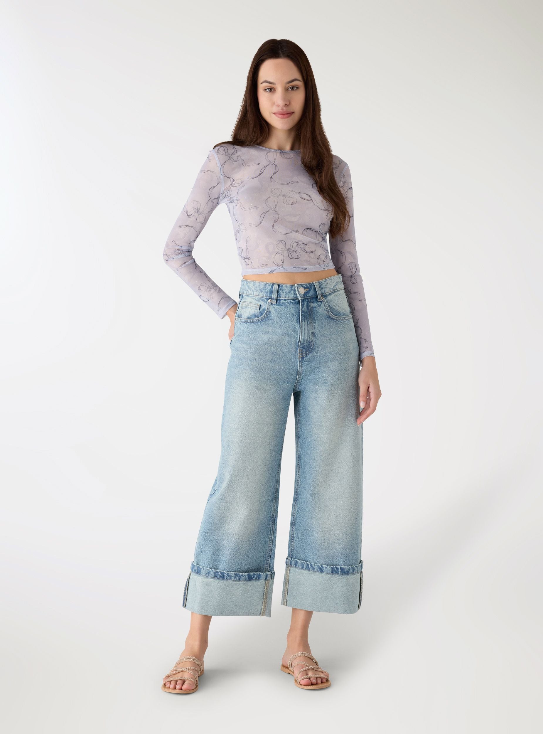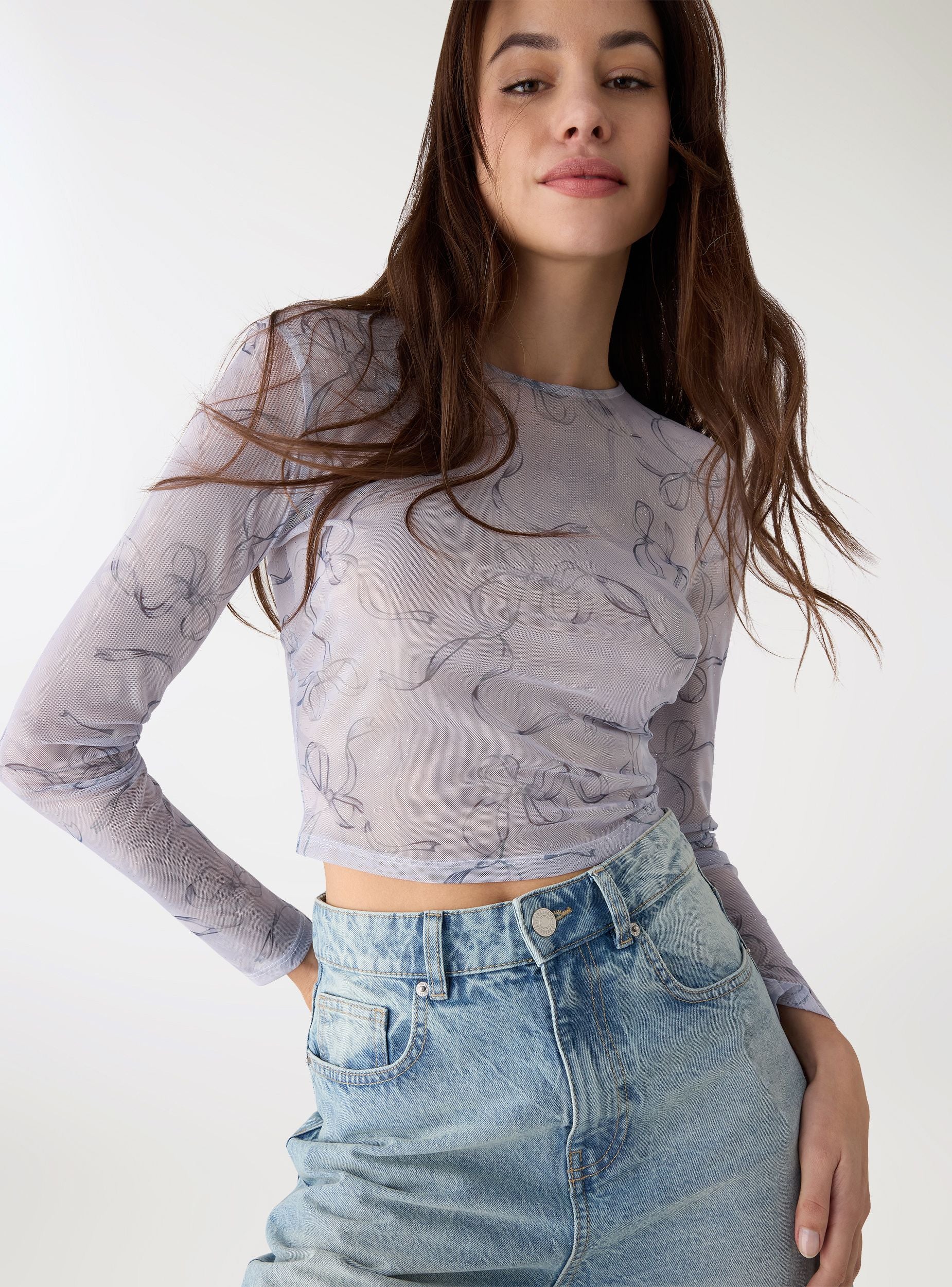 Maglietta da donna a maniche lunghe con stampa di fiocchi ed effetto luccicante. Modello leggero in tulle, scollo tondo e vestibilità regular, perfetto da indossare su top o bralette per look a strati. Ideale per serate e uscite casual, si abbina a jeans a vita alta o minigonne per un tocco femminile. Design semi-trasparente, senza chiusure, finiture pulite sull’orlo e sui polsini, fantasia all over.Dettagli