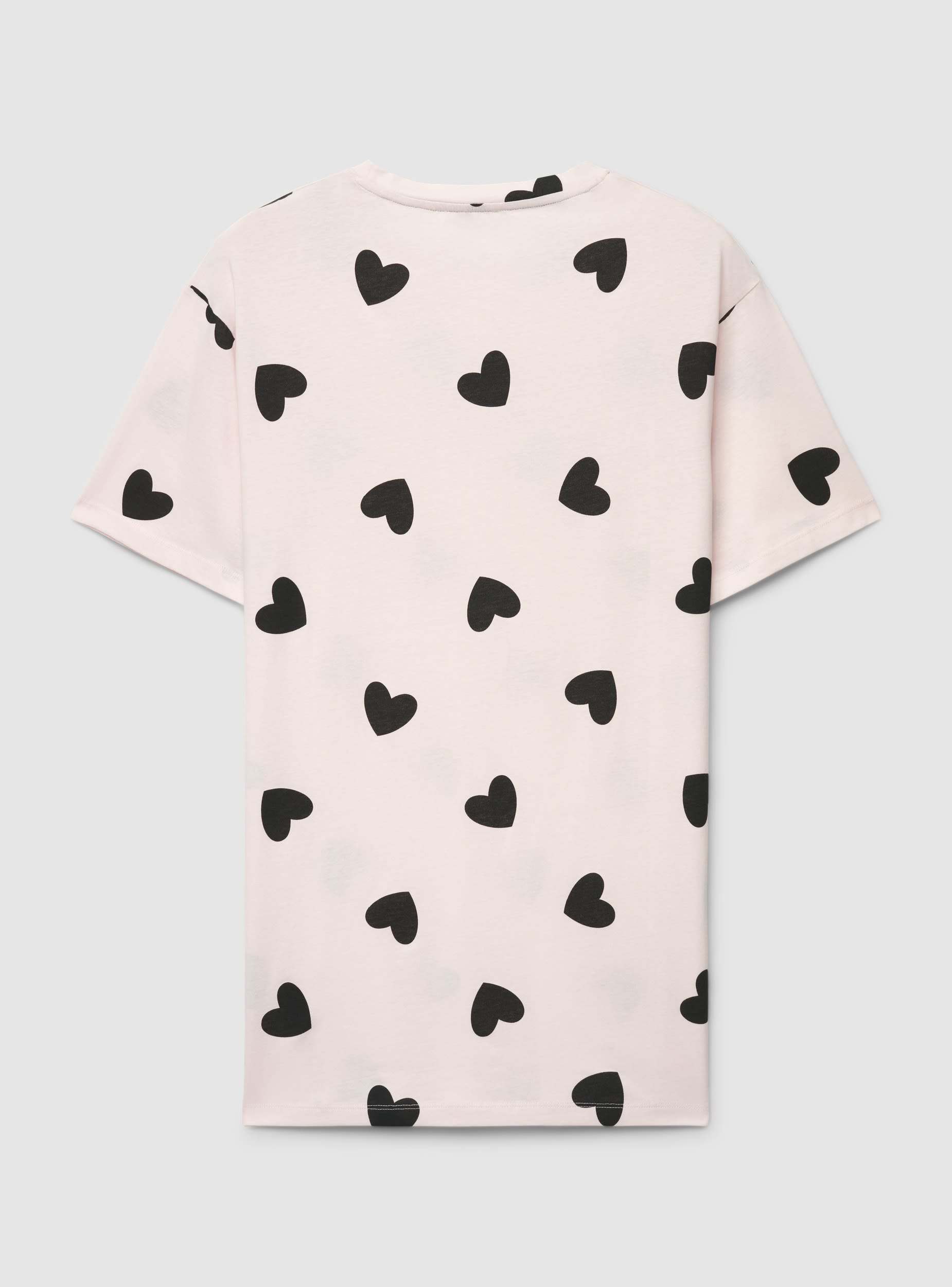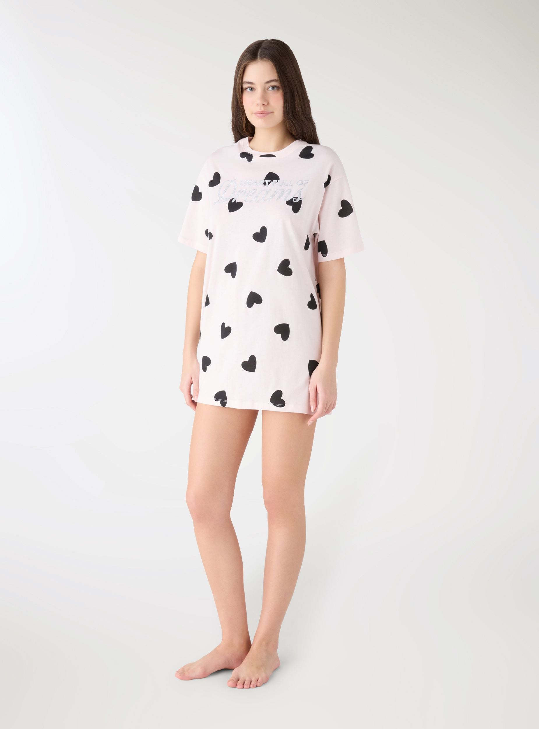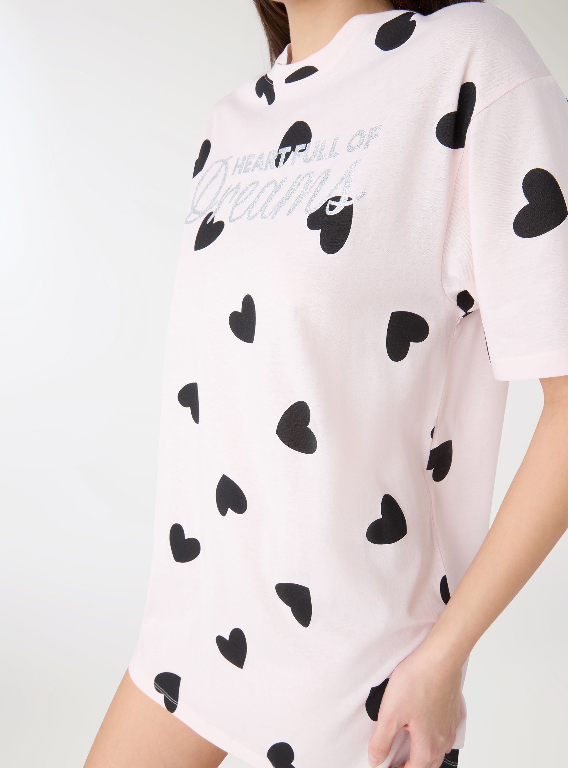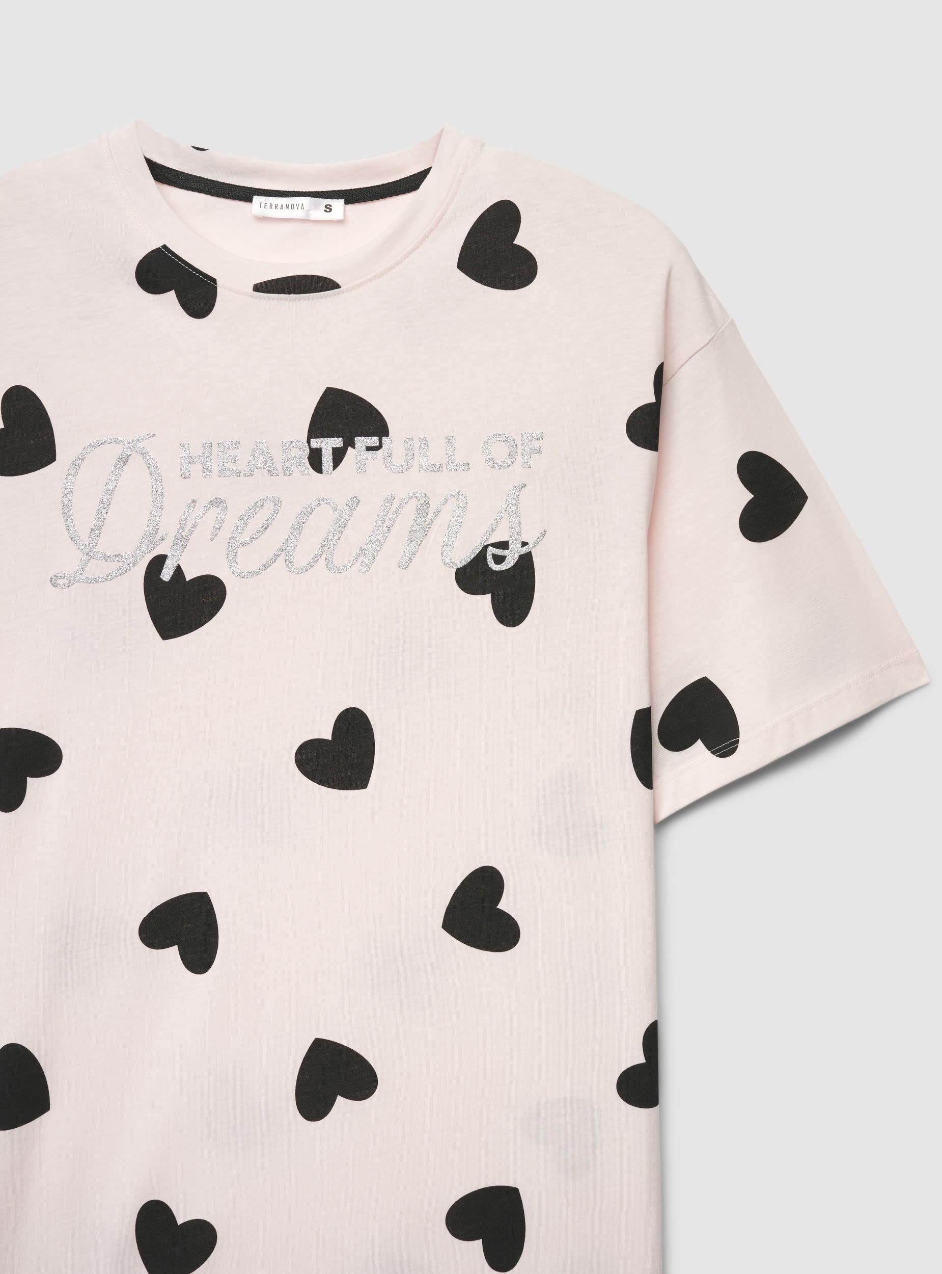 Maglietta da donna over con stampe cuori e scritta frontale con glitter. Girocollo e maniche corte, perfetta per il tempo libero e i momenti di relax.Dettagli