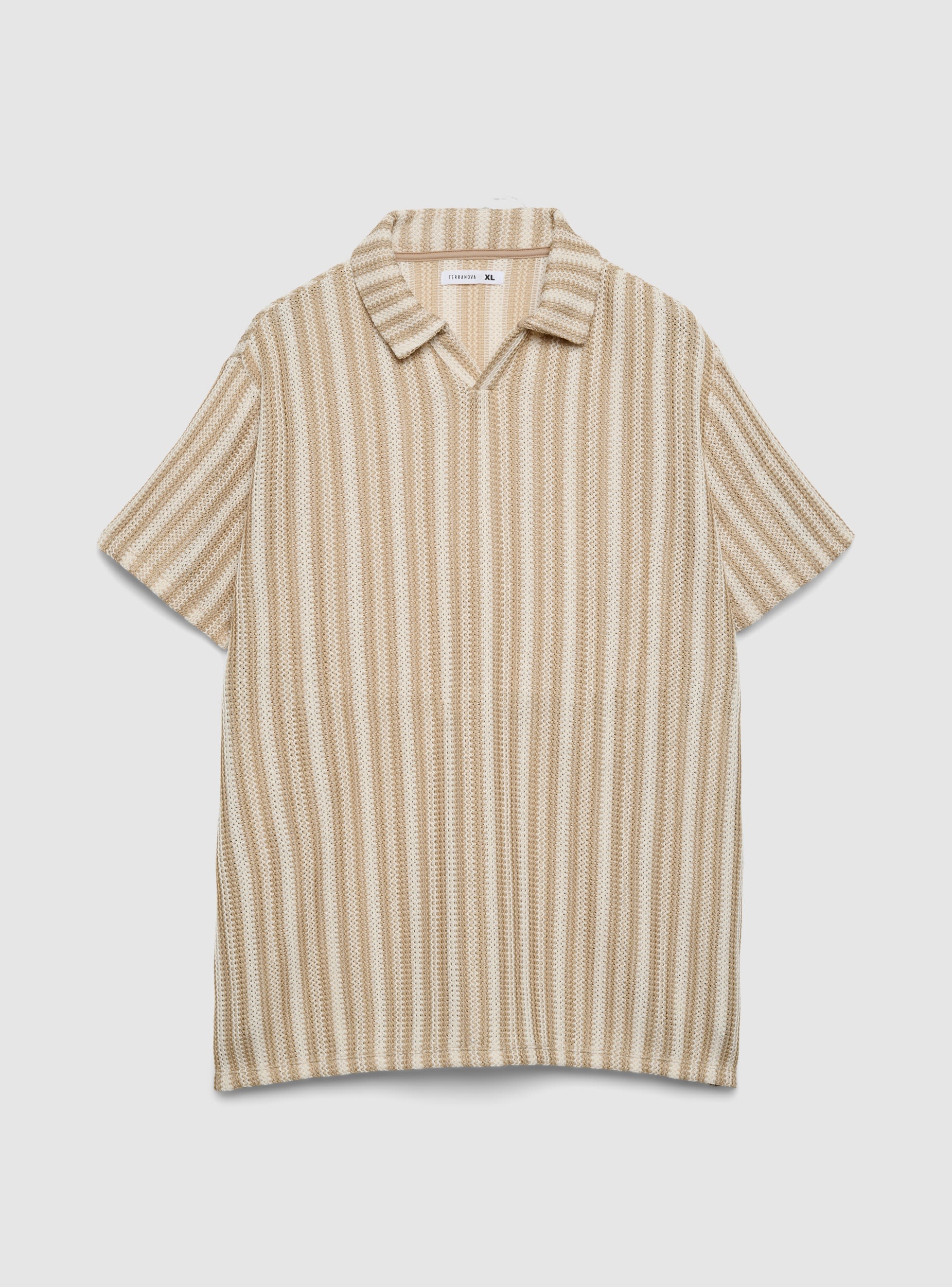 Maglietta da uomo a righe con effetto crochet, pensata per look estivi curati. Il modello presenta colletto stile polo e scollo a V senza bottoni, maniche corte e linea dritta per una vestibilità comoda. Perfetta con jeans o bermuda per il tempo libero e le uscite serali, dona un tocco ricercato anche sotto una camicia aperta.Dettagli