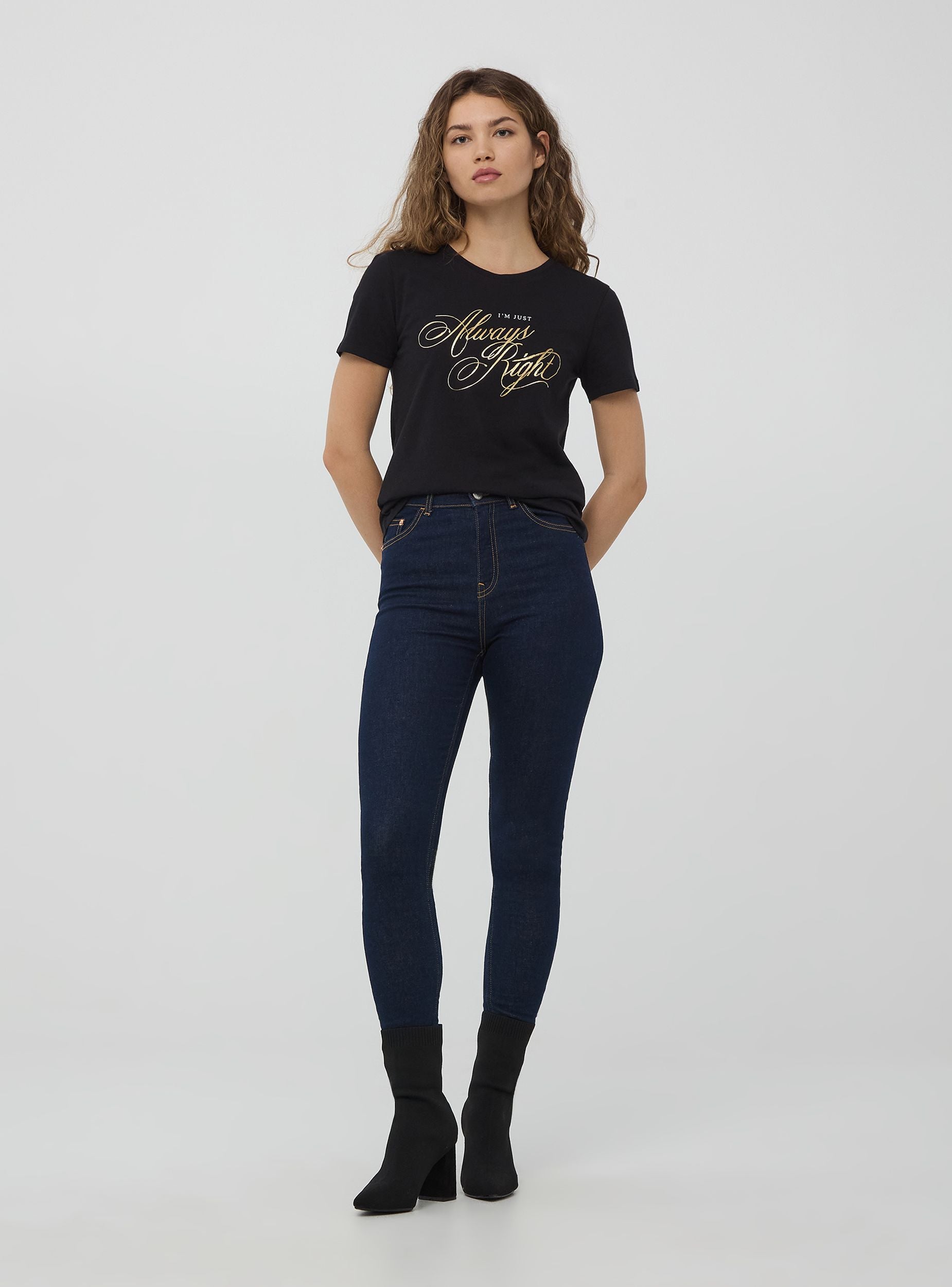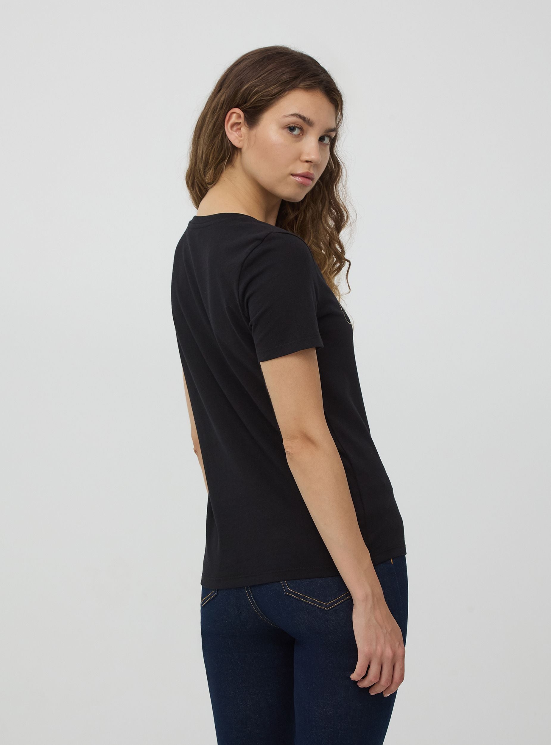 Maglietta da donna in jersey di cotone. Modello girocollo a maniche corte con scritta laminata. Capo casual ideale per i look di tutti i giorni. Vestibilità regular.Dettagli