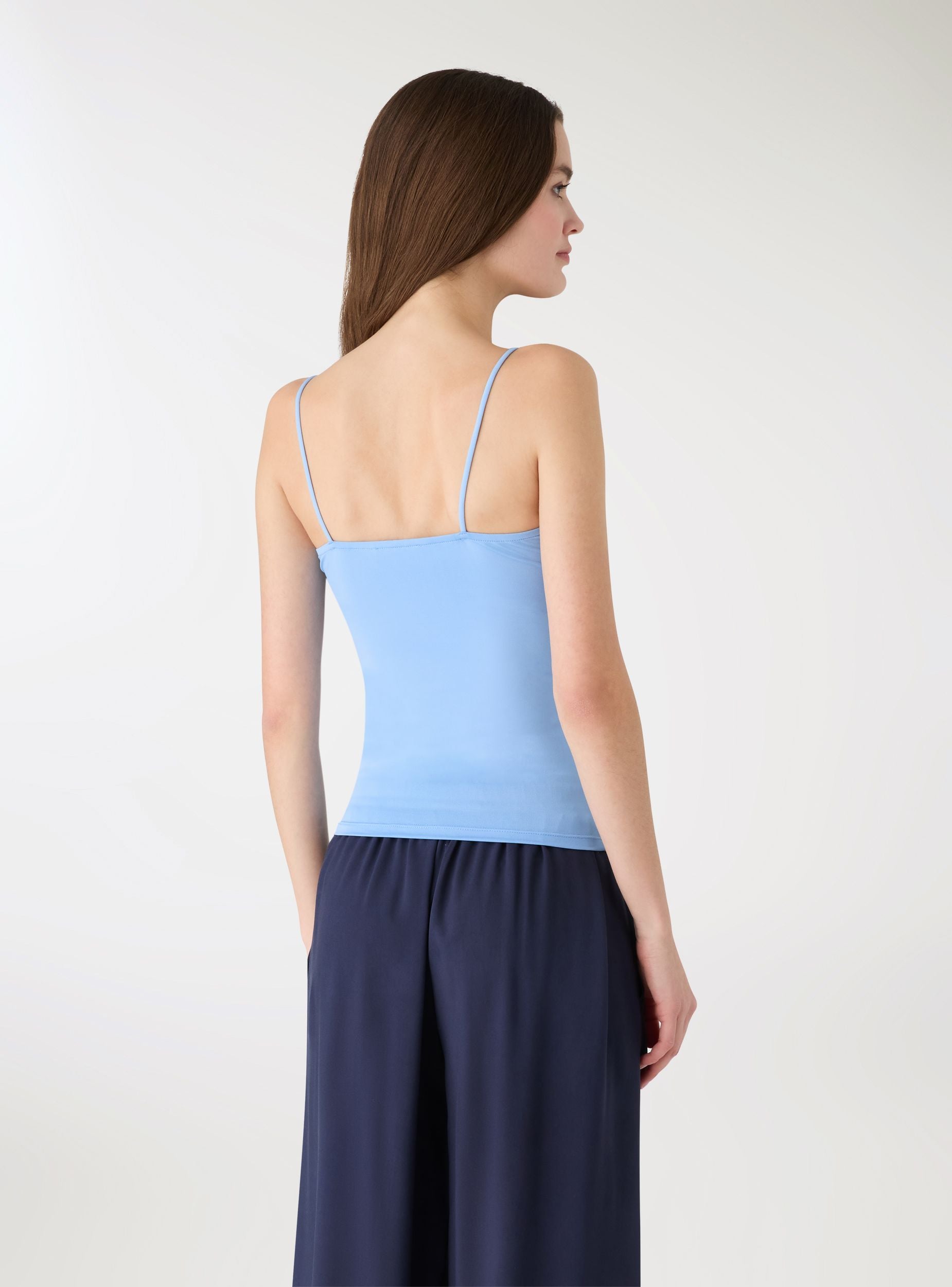 Canotta da donna a tinta unita con spalline sottili e scollo morbido drappeggiato. Lunghezza regular, ideale sotto blazer o camicie per l’ufficio e perfetta con jeans o gonne per il tempo libero. Design minimal. Un capo versatile da indossare da solo nelle giornate calde o per look a strati nelle mezze stagioni.Dettagli