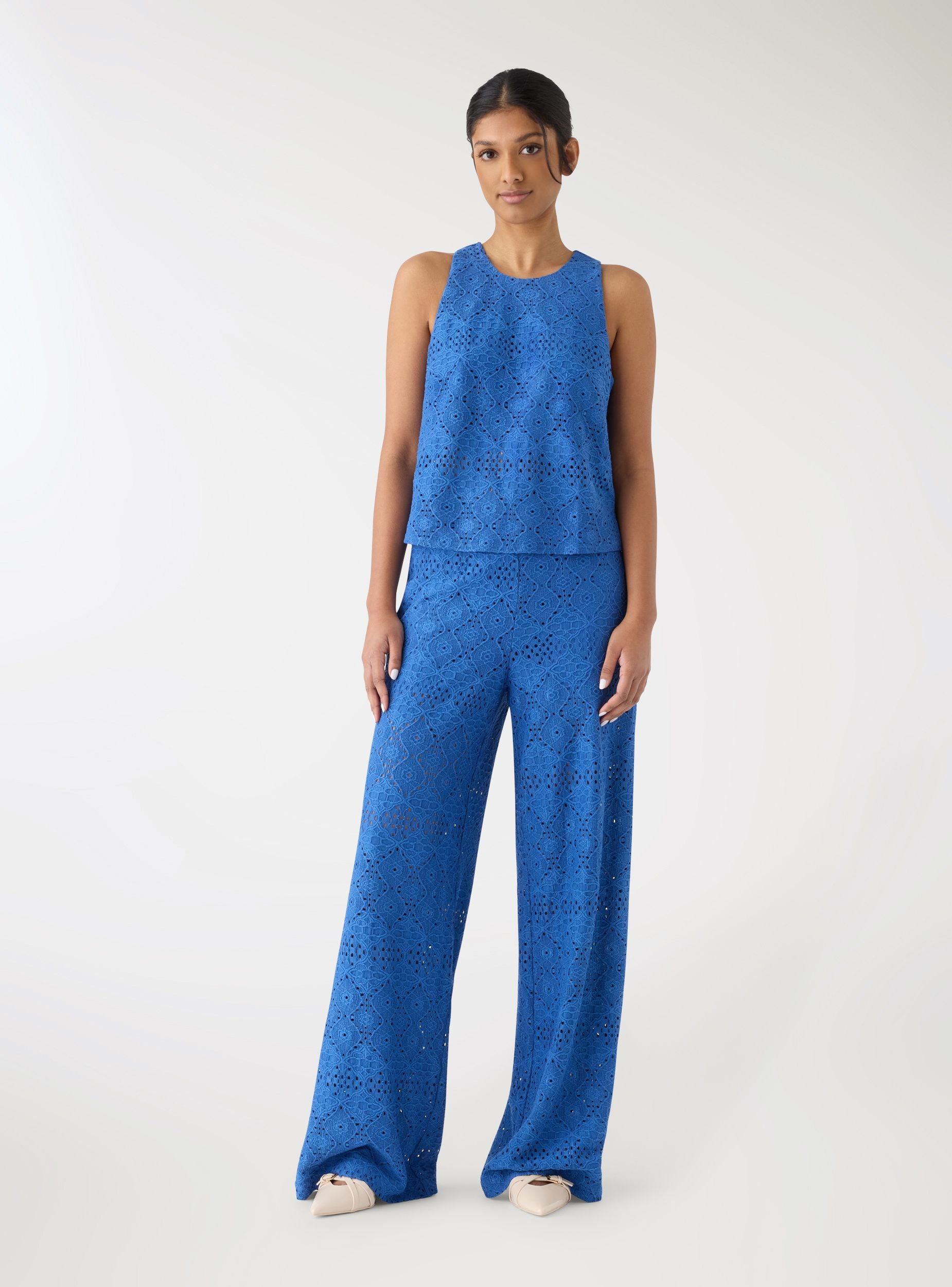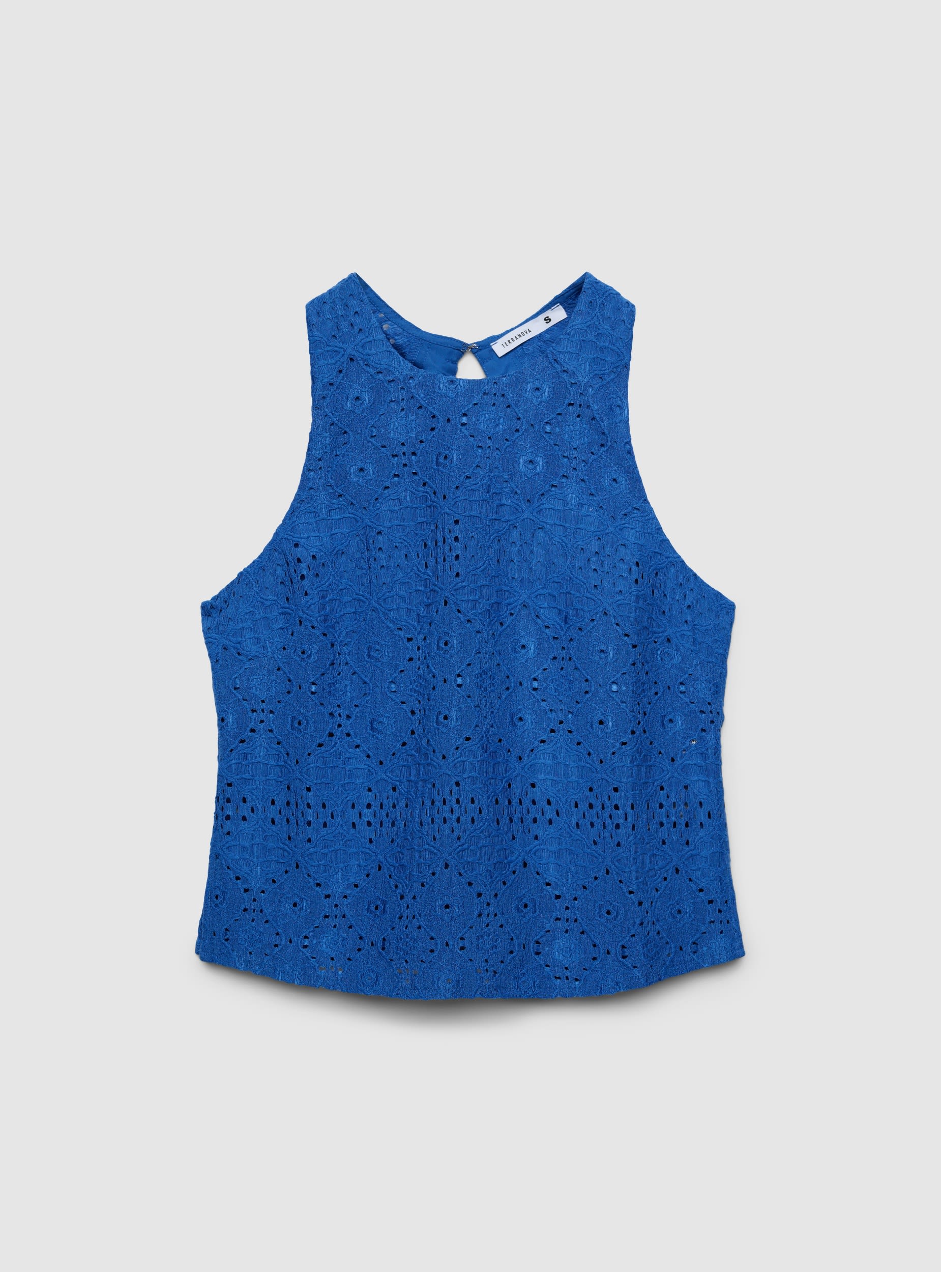 Top da donna a tinta unita, lavorazione sangallo con motivo traforato. Girocollo e piccolo oblò posteriore con chiusura a gancetto. Vestibilità regular e lunghezza standard, ideale per outfit estivi con jeans, gonne a vita alta o pantaloncini. Perfetta per occasioni casual o serate con accessori minimal grazie al design ricamato che aggiunge un tocco femminile.