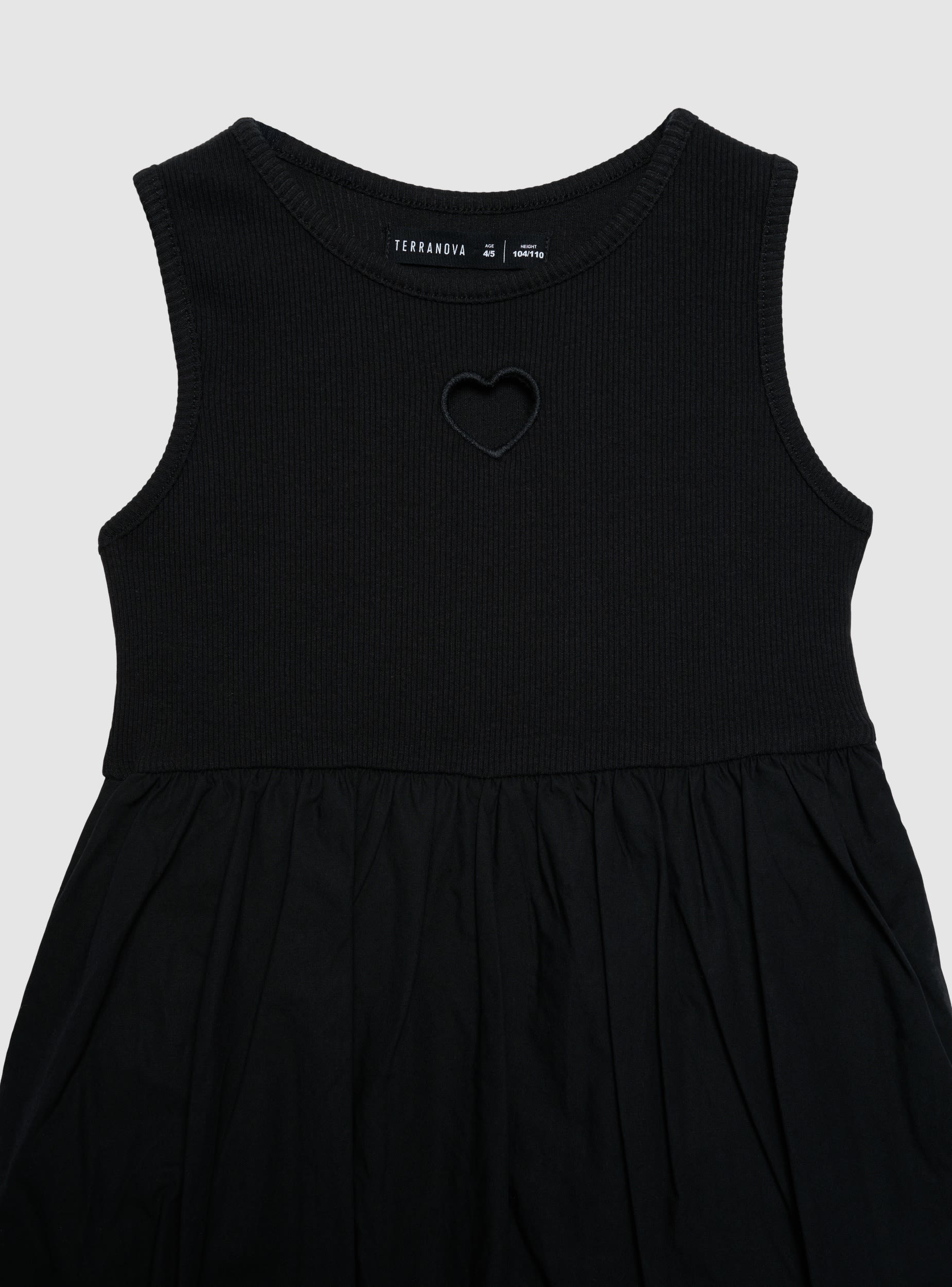 Abito da bambina a tinta unita dal design balloon, ideale per feste e occasioni speciali ma perfetto anche con sneakers per la scuola. Modello senza maniche con scollo tondo e taglio in vita che valorizza la silhouette. Il dettaglio cuore applicato sul petto aggiunge un tocco dolce, mentre la gonna ampia con orlo arricciato dona movimento.Dettagli