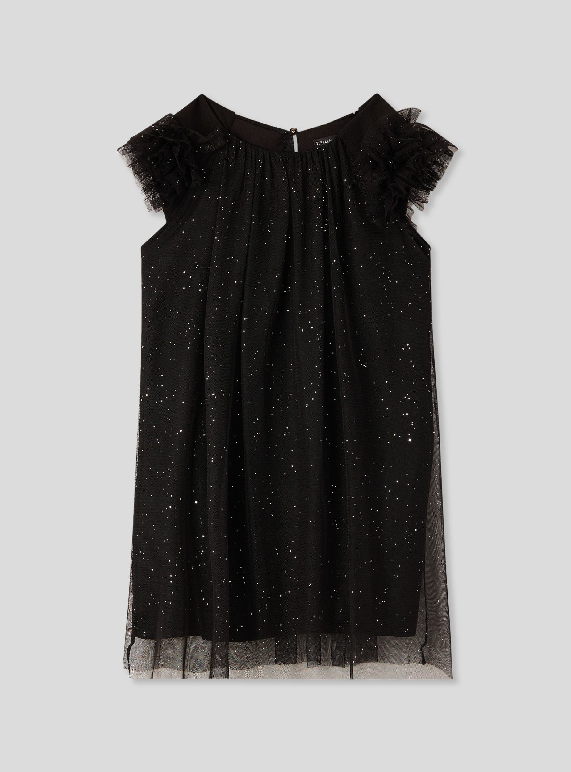 Abito da bambina ideale per occasioni speciali, caratterizzato da una vestibilità regolare e maniche corte con volant in tulle che donano un tocco elegante. Il design presenta una fantasia tinta unita arricchita da dettagli effetto luccicante, perfetti per aggiungere brillantezza al look. Collo tondo e chiusura a goccia sul retro completano il capo, versatile da abbinare a ballerine o sandali.Dettagli