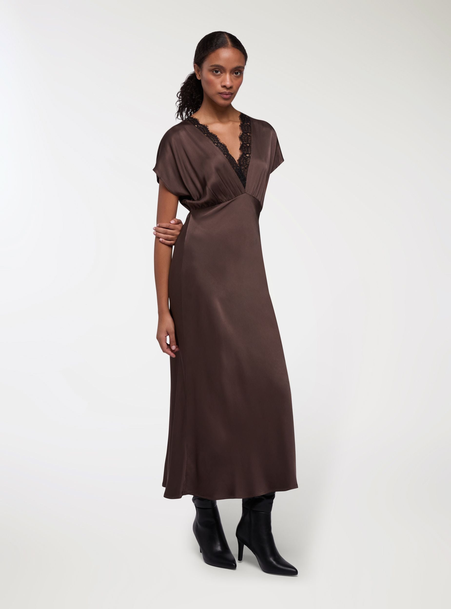 Abito lungo da donna effetto raso, a tinta unita con scollo a V impreziosito da inserti in pizzo. Maniche corte e linea morbida che cade fluida, ideale per occasioni serali o eventi eleganti. Perfetto con sandali a tacco e pochette, si presta anche a un look raffinato con blazer leggero. Vestibilità regular, dettagli arricciati sotto il decolté per valorizzare la silhouette.Dettagli