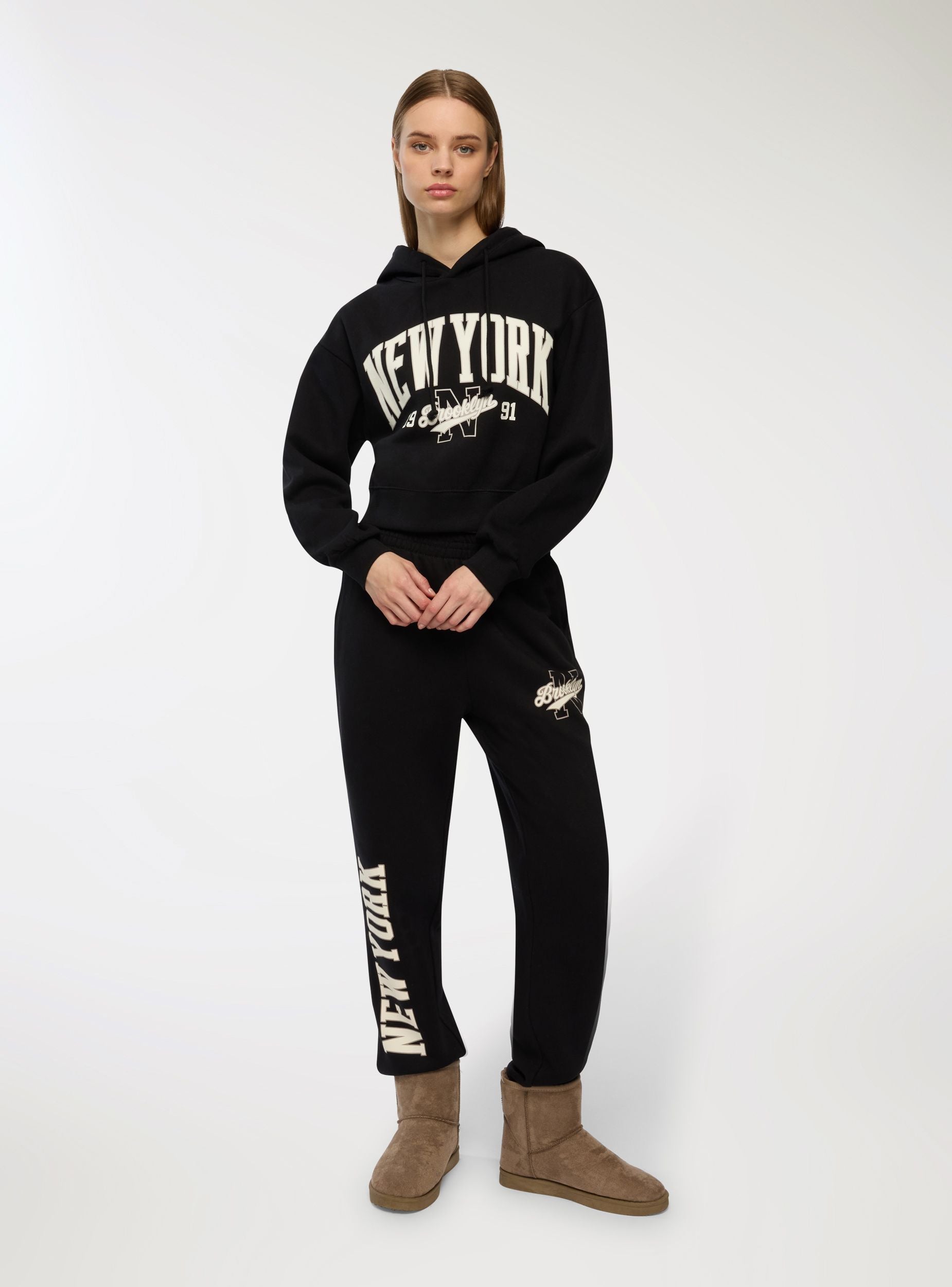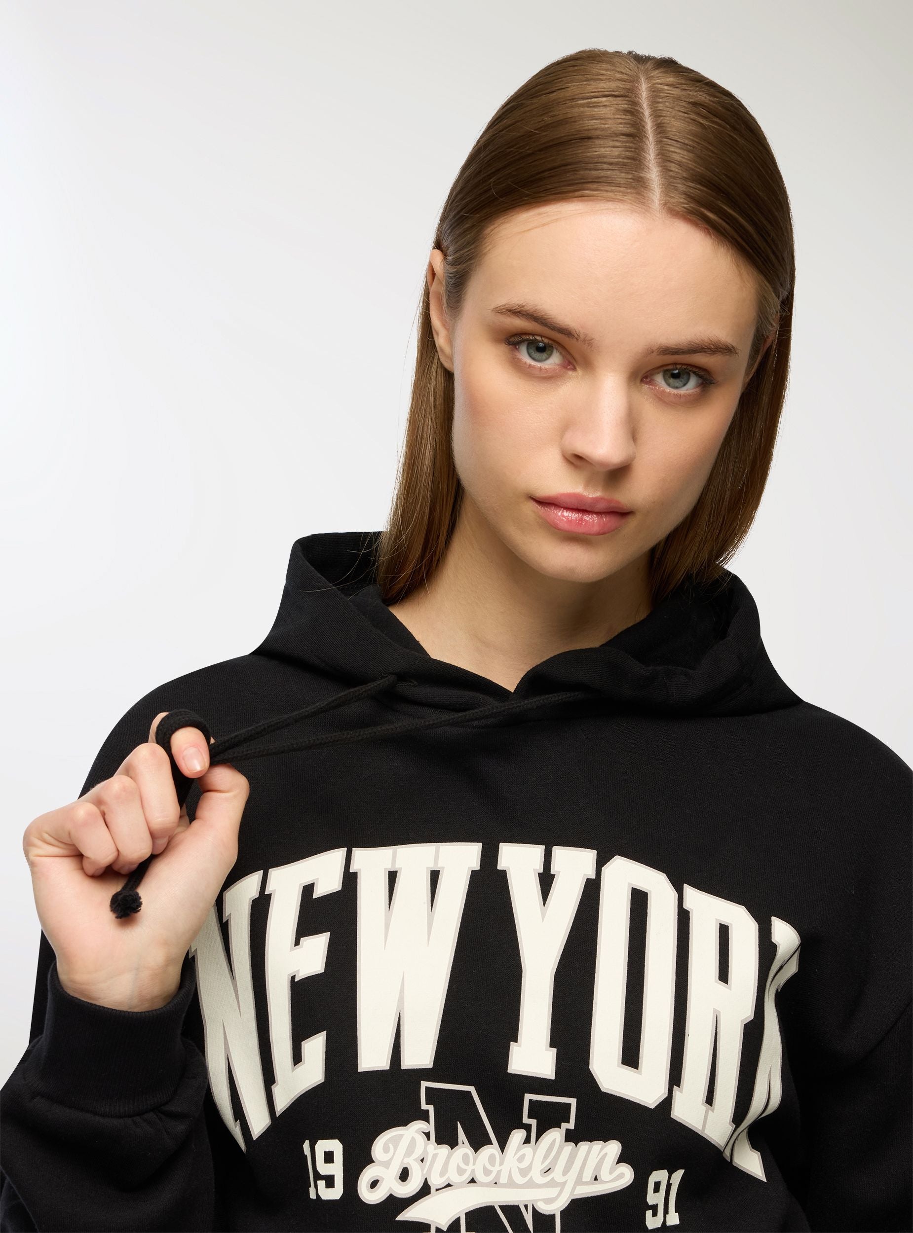 Hanorac gros de damă cu glugă reglabilă cu șnur și imprimeu în stil colegiu american pe partea din față. Modelul cropped, cu tiv și manșete striate, evidențiază silueta și conferă un aer sportiv ținutei. Ideal pentru a înfrunta zilele mai reci cu stil și confort. Perfect cu blugi, joggers sau leggings pentru outfituri casual, inspirate de stilul urban, confortabile și la modă.Detalii