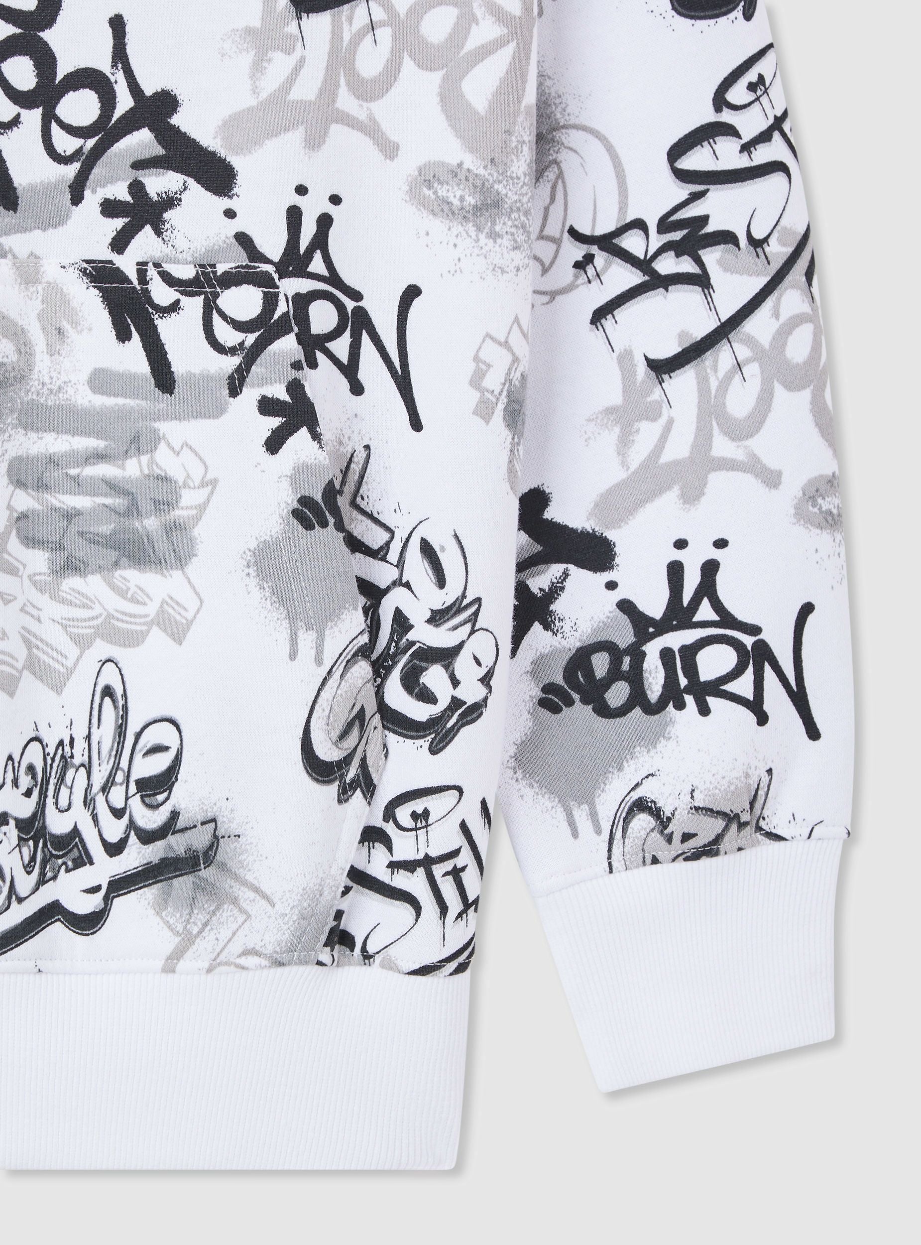 Hanorac gros pentru copii, cu glugă, caracterizat printr-o imprimare graffiti pe toată suprafața. Ideal pentru un look casual și modern, perfect pentru timpul liber sau pentru a completa ținute streetwear. Croială comodă și design atractiv, cu detalii care îl fac unic și la modă.Detalii