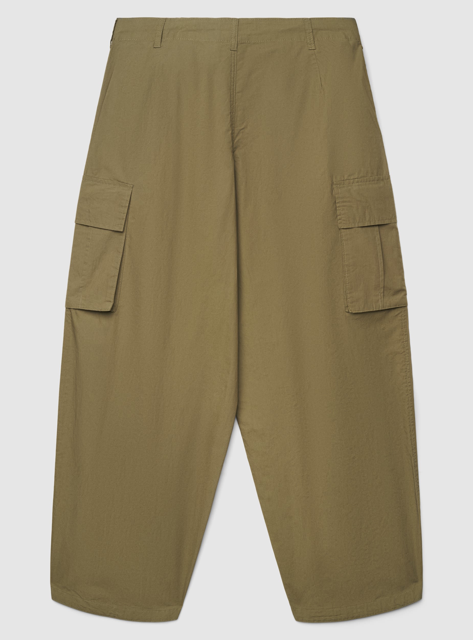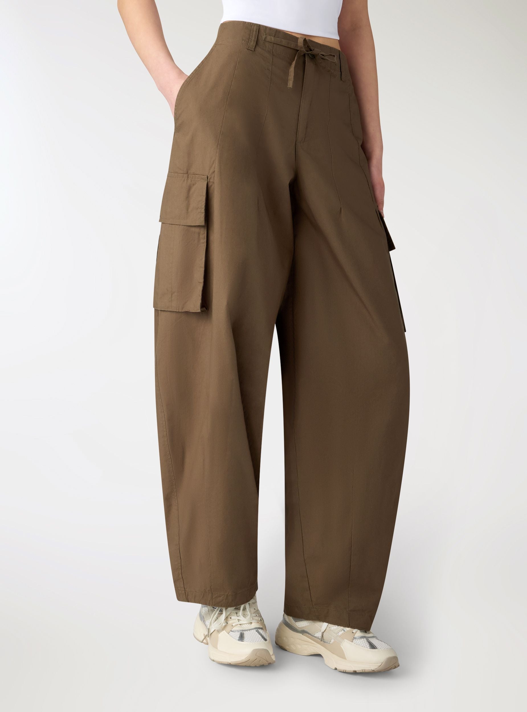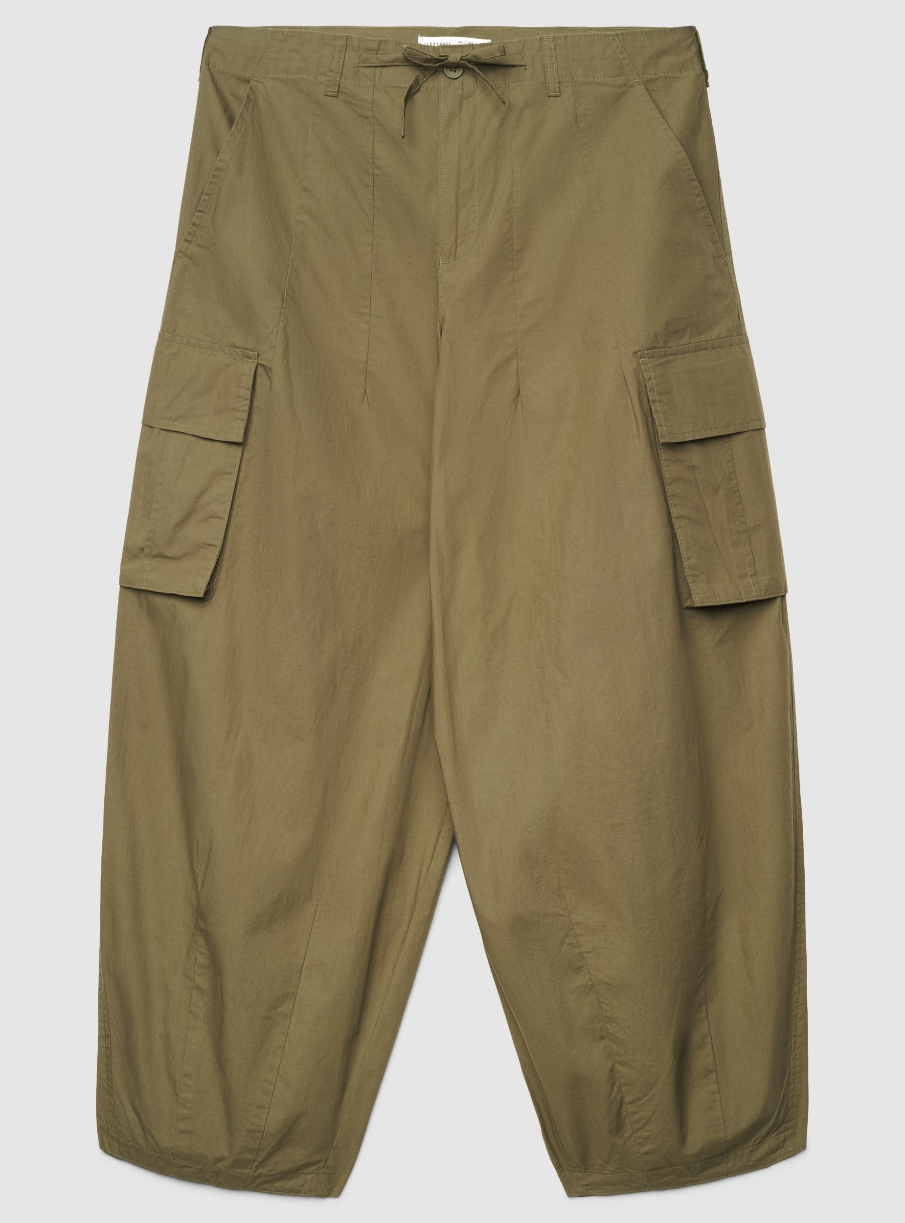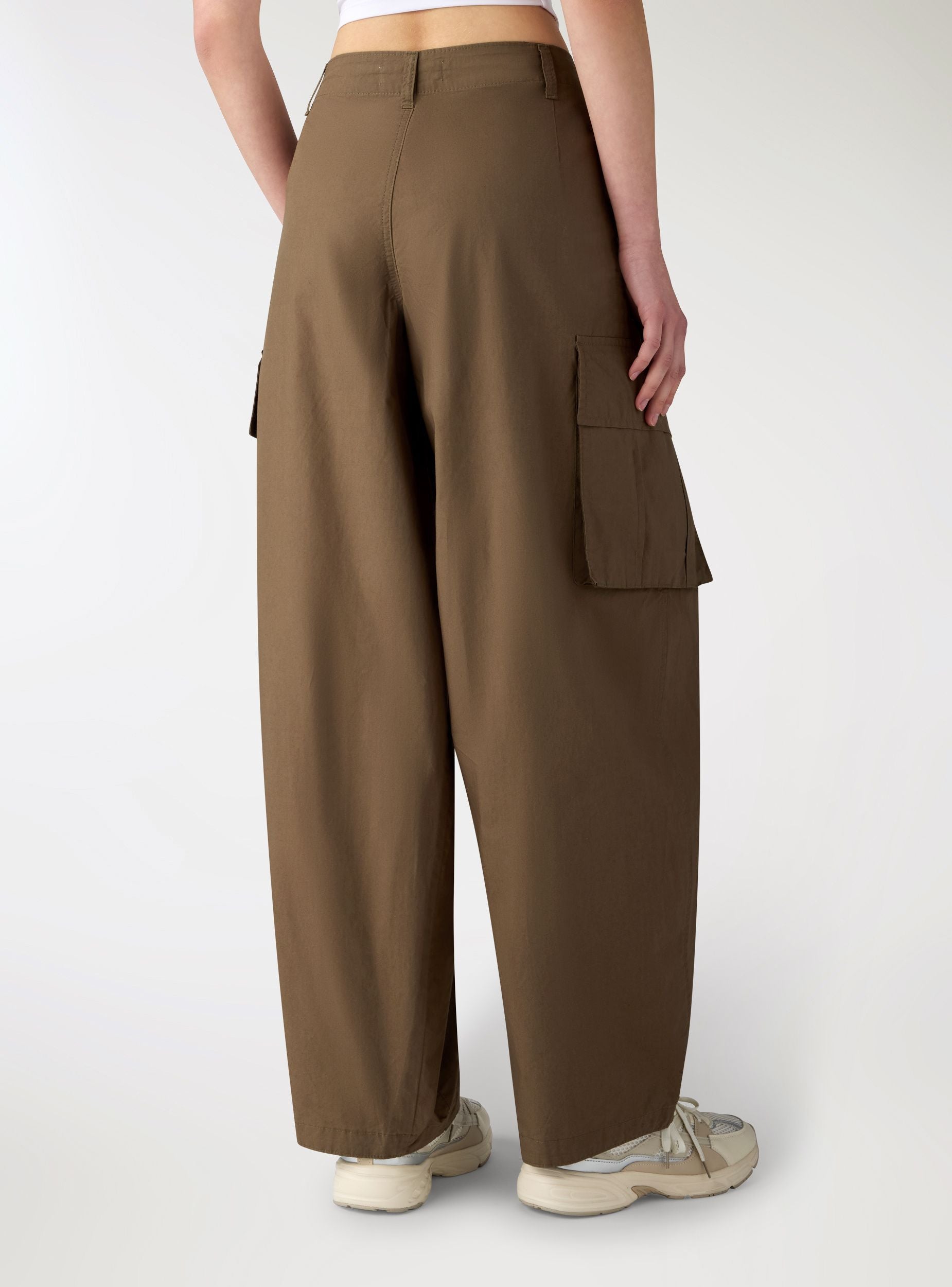 Pantaloni lungi pentru femei, uni, din poplin de bumbac, cu croială balloon pentru o potrivire lejeră și contemporană. Talie cu curele și șnur interior pentru confort, în timp ce închidere cu nasture și fermoar asigură o linie curată. Modelul este completat de buzunare laterale și buzunare cargo cu clapetă pe picioare, ideale pentru un look urban cu adidași sau sandale.Detalii