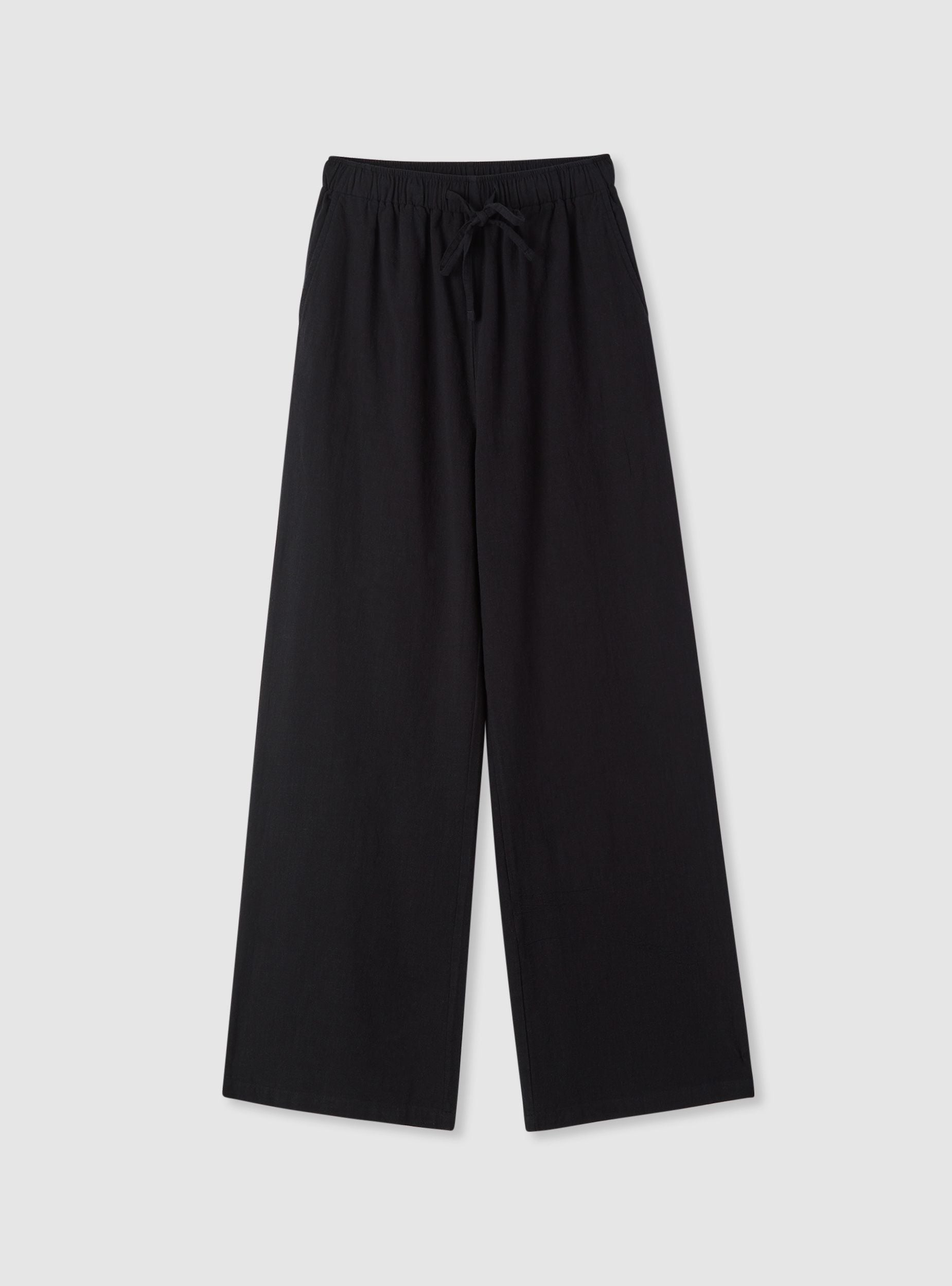 Pantaloni lungi de damă din țesătură de bumbac uni, perfecți pentru timpul liber și un look casual. Model wide leg cu croială confortabilă și talie elastică reglabilă prin șnur. Au buzunare laterale cu fante și o linie moale care cade drept până la gleznă. Ușor de asortat cu un tricou și sandale sau cu o cămașă ușoară pentru ținute relaxate cu o siluetă aerisită.Detalii