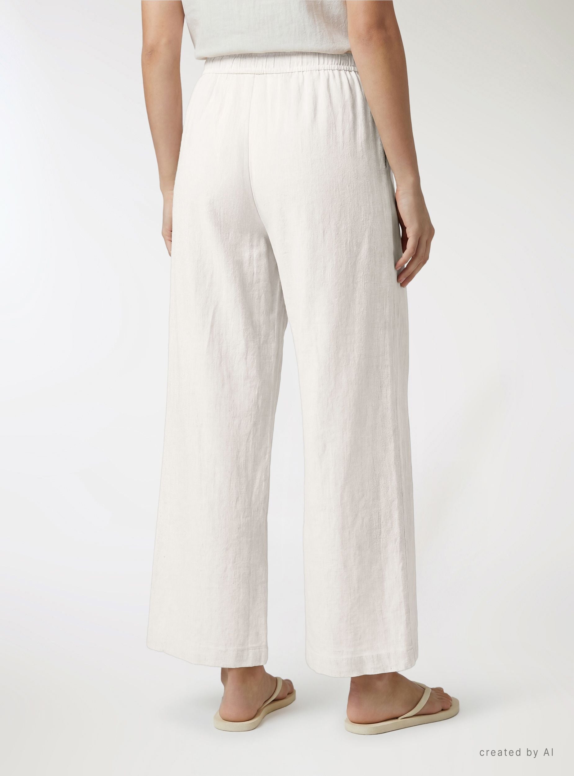 Pantaloni lungi pentru femei din țesătură de bumbac uni, perfecți pentru timpul liber și look casual. Model wide leg cu croială confortabilă și talie elastică reglabilă prin șnur. Prezintă buzunare laterale cu fante și o linie moale care cade drept până la gleznă. Ușor de asortat cu tricou și sandale sau cu o cămașă ușoară pentru ținute relaxate cu o siluetă aerisită.Detalii