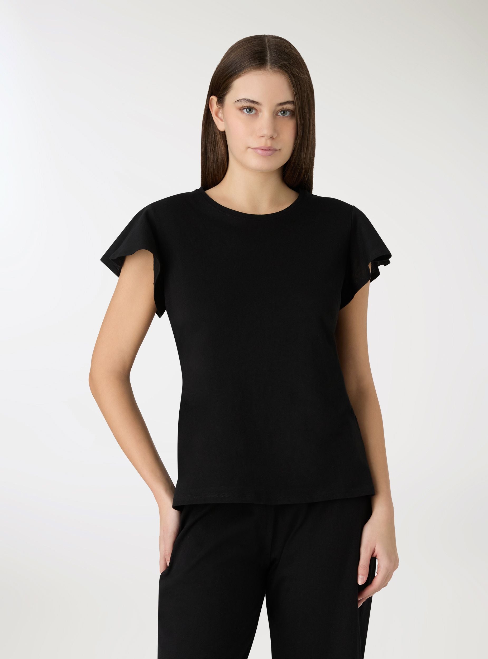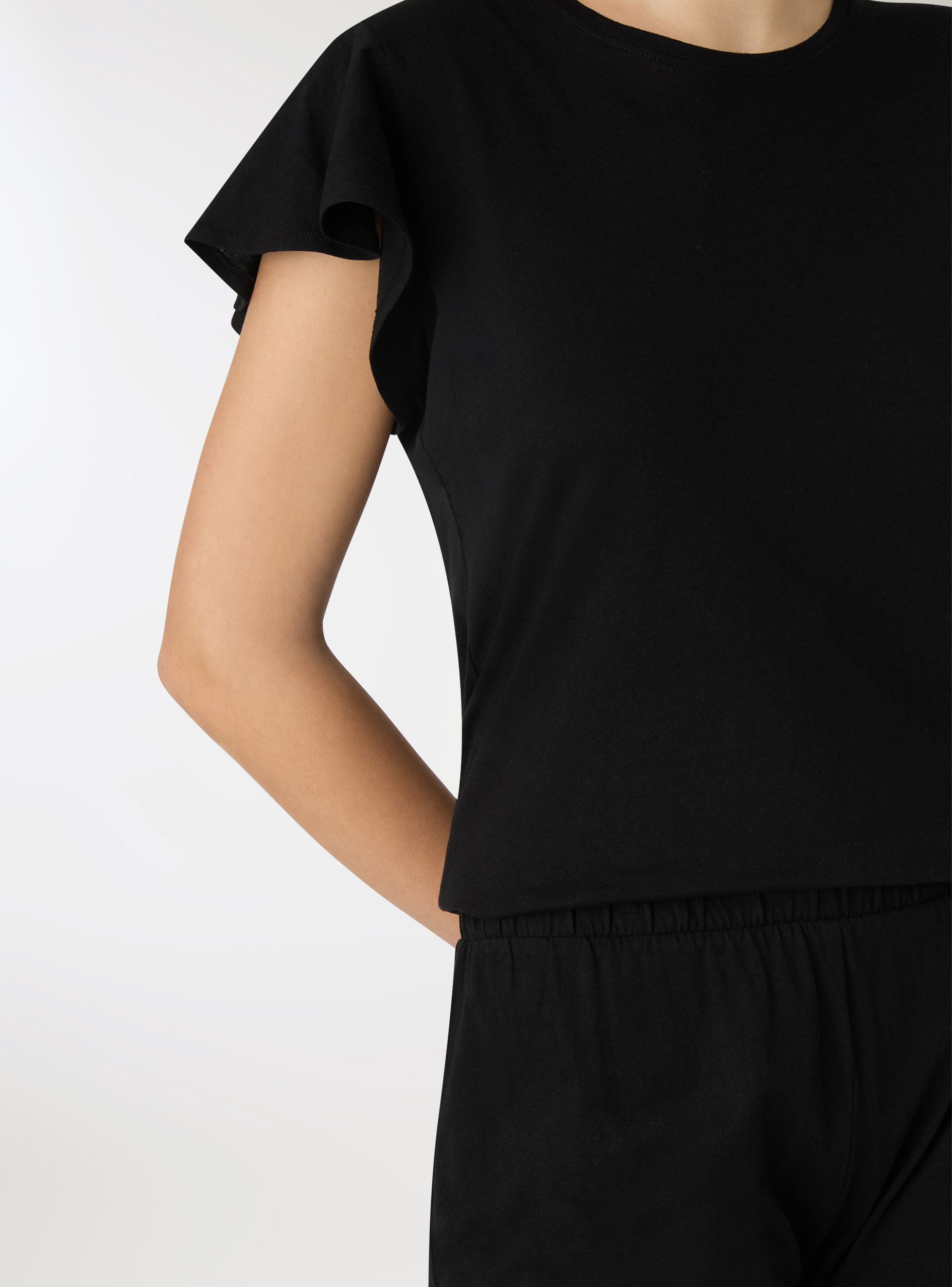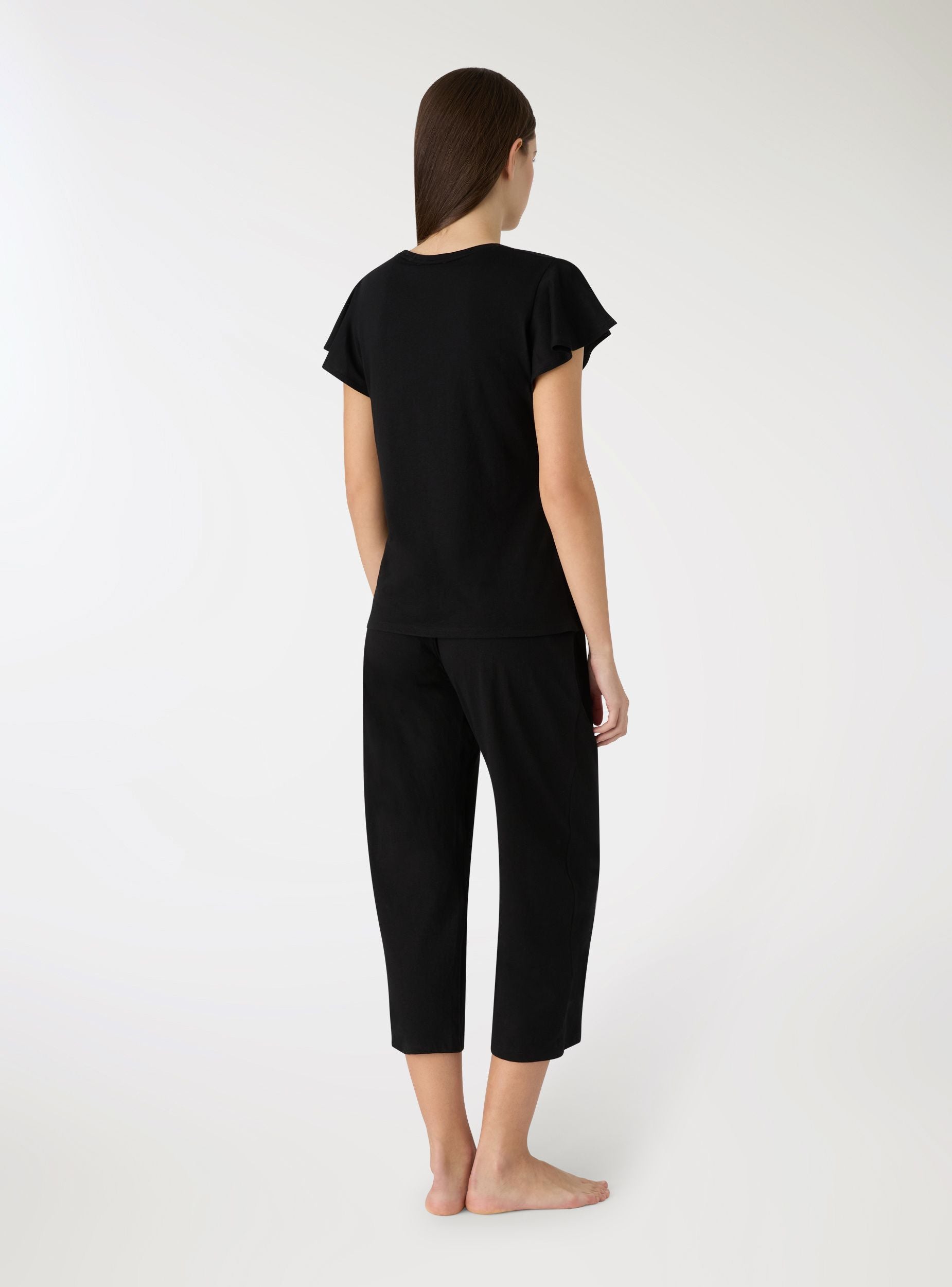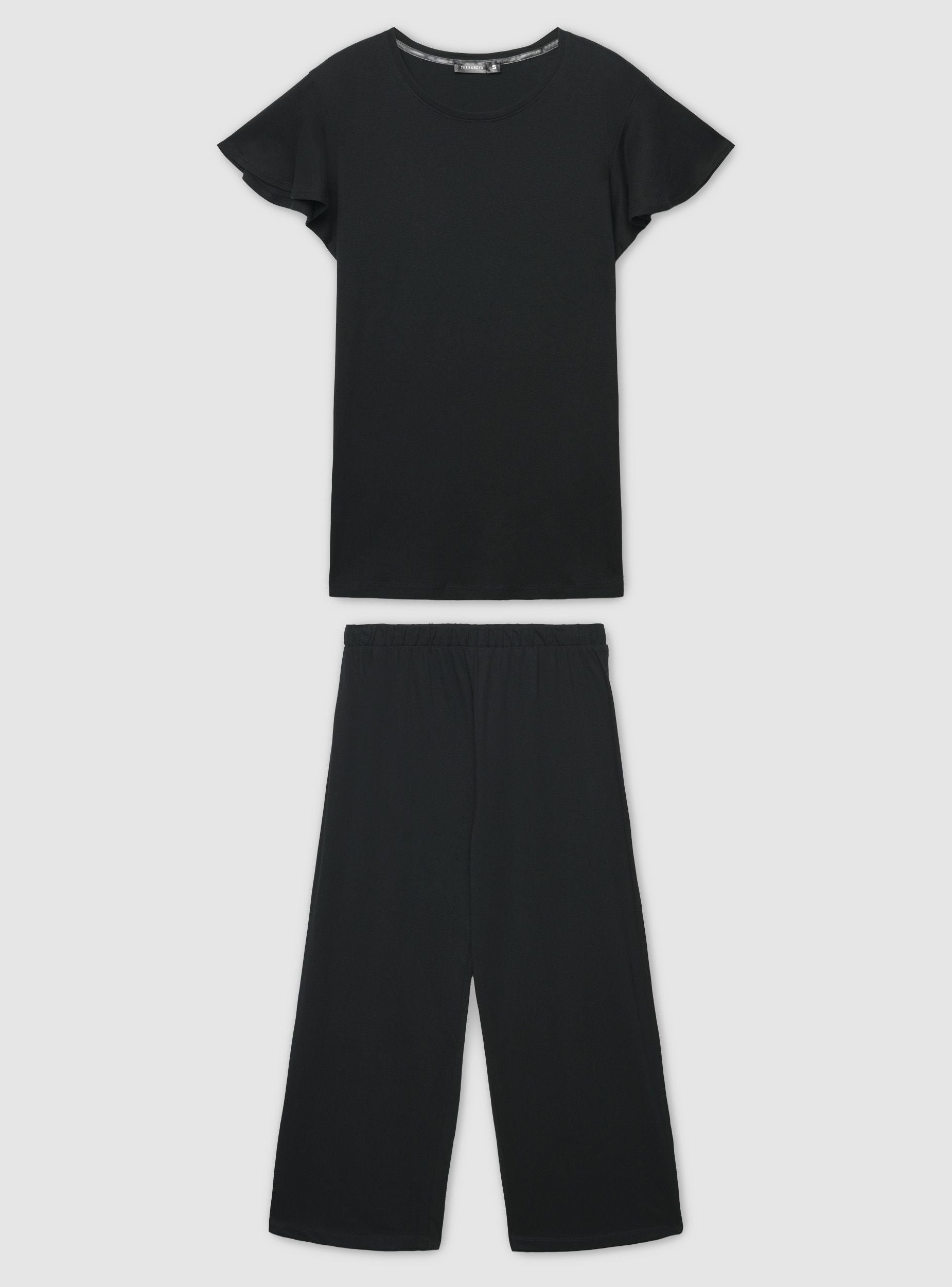 Pijamale damă uni compus din tricou cu mâneci scurte și decolteu rotund și pantaloni capri. Ideal pentru serile liniștite și momentele de relaxare, oferă o croială confortabilă și linii simple. Tricoul are mâneci ușor evazate, iar pantalonii capri asigură libertate de mișcare. Perfect împreună cu o halat ușor și papuci pentru un look coordonat acasă.Detalii