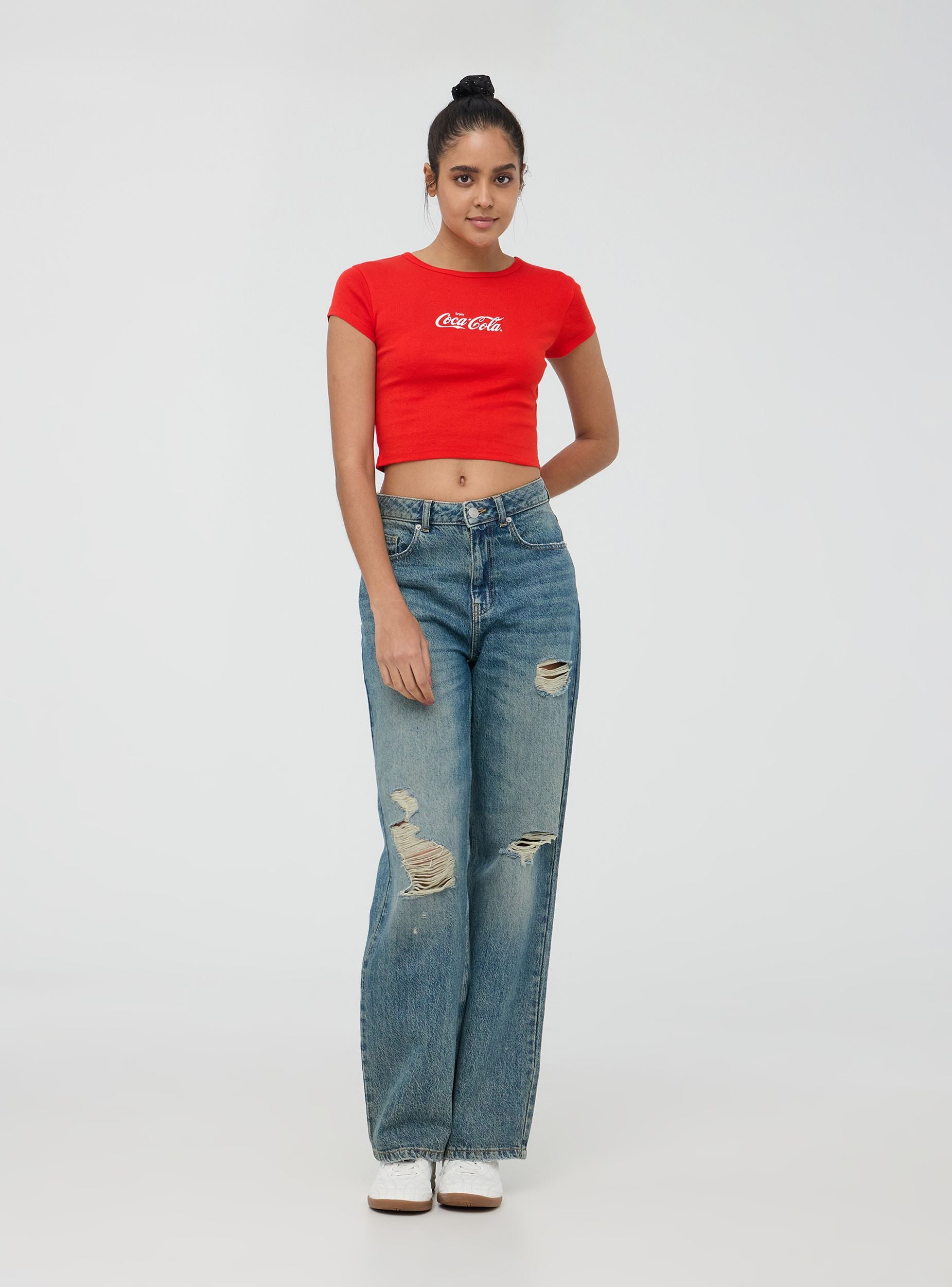 Tricou crop pentru femei, ideal pentru un look casual și lejer. Are guler rotund și mâneci scurte, perfecte pentru sezonul estival. Caracteristica principală este imprimeul frontal cu celebrul logo Coca-Cola®, care oferă piesei un aer iconic. Acest tricou este perfect pentru ținute informale și pentru cei care îmbină stilul cu confortul.Detalii