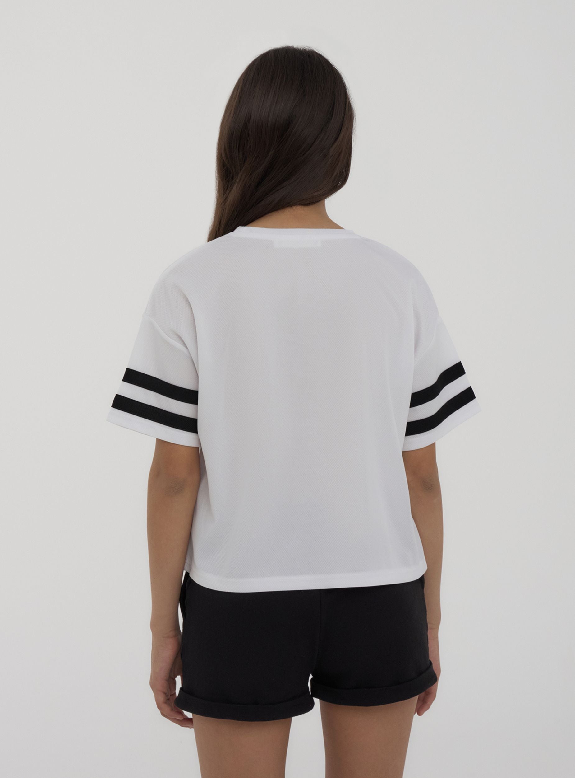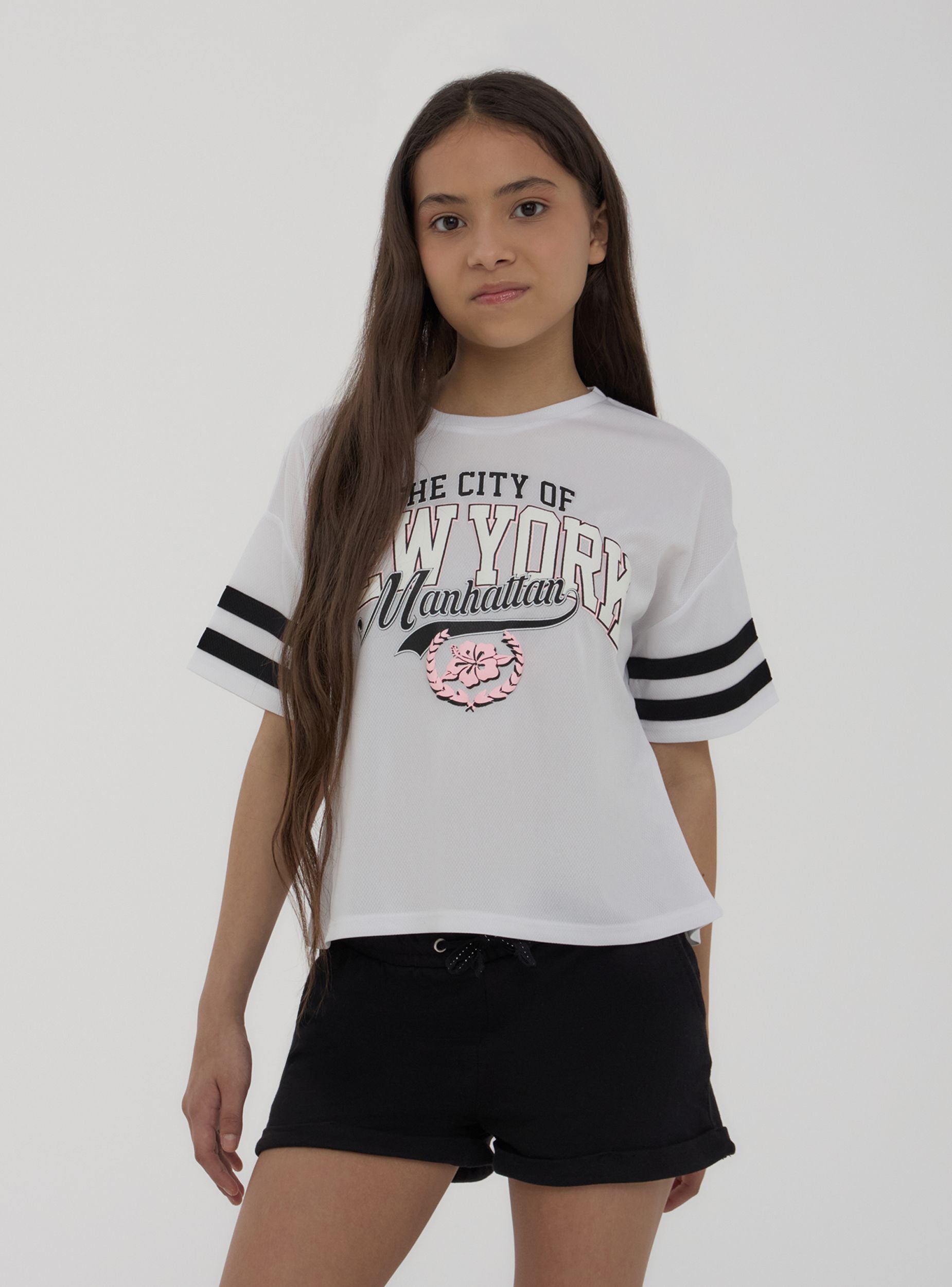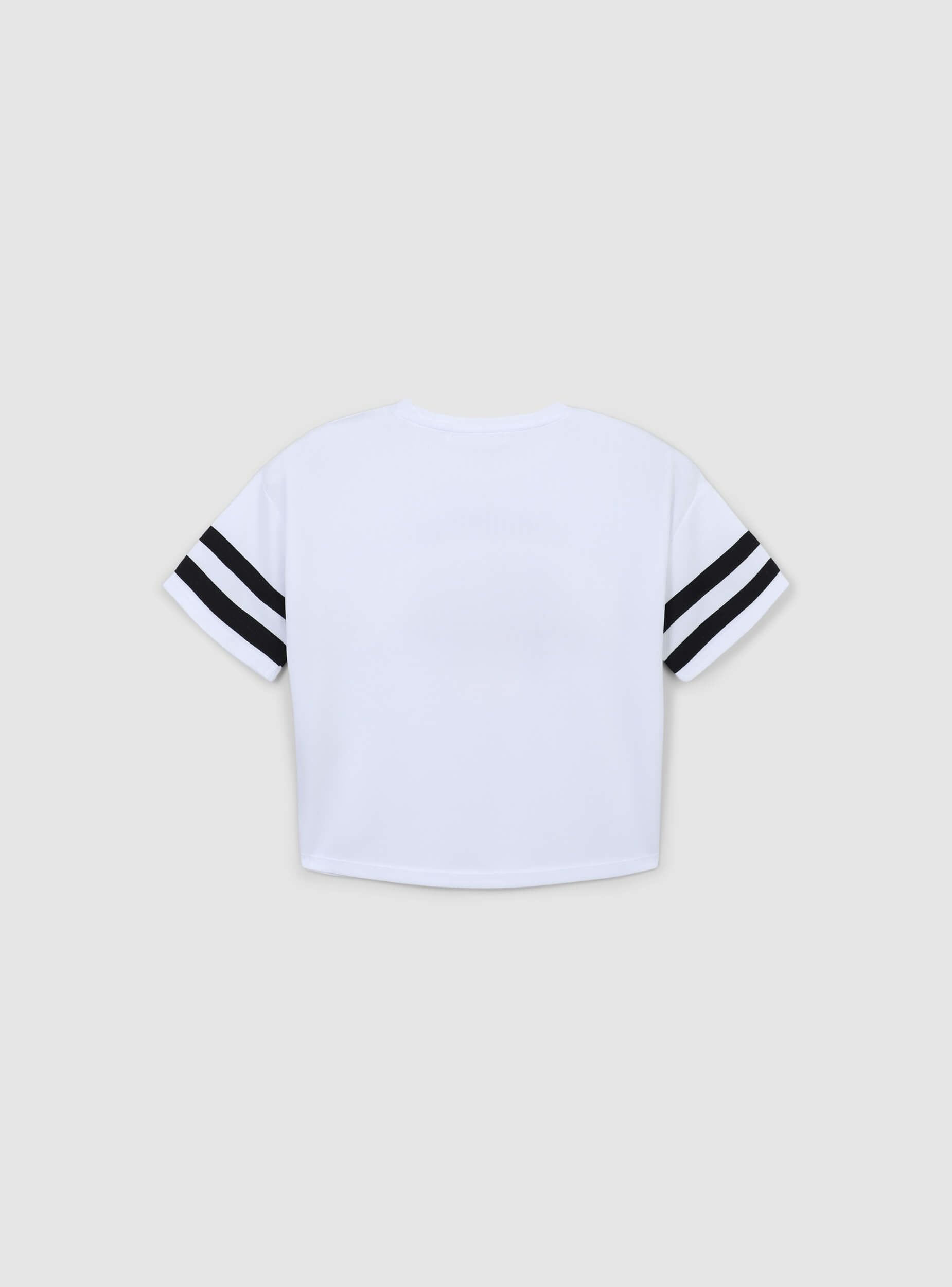 Tricou pentru fete, ideal pentru un look casual și dinamic, perfect pentru timpul liber. Caracterizat printr-o croială regular, prezintă o imprimare cu inscripții pe partea din față și detalii cu dungi pe mânecile scurte. Un articol versatil și la modă, potrivit pentru diverse ocazii informale.Detalii