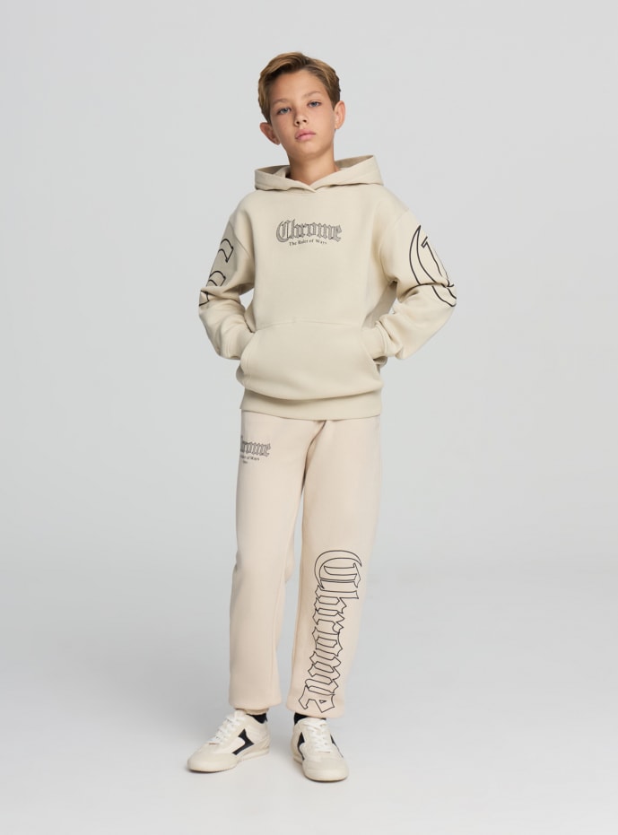 Dečije trenerke sa gotičkim printom na nozi. Pojas sa pertlama za praktično podešavanje, donji deo sa elastičnim manžetnama i bočni džepovi. Regular kroj, idealne za školu, sport i slobodno vreme. Lako se kombinuju sa duksericom ili majicom i patikama za ležeran i urbani izgled. Teži materijal.