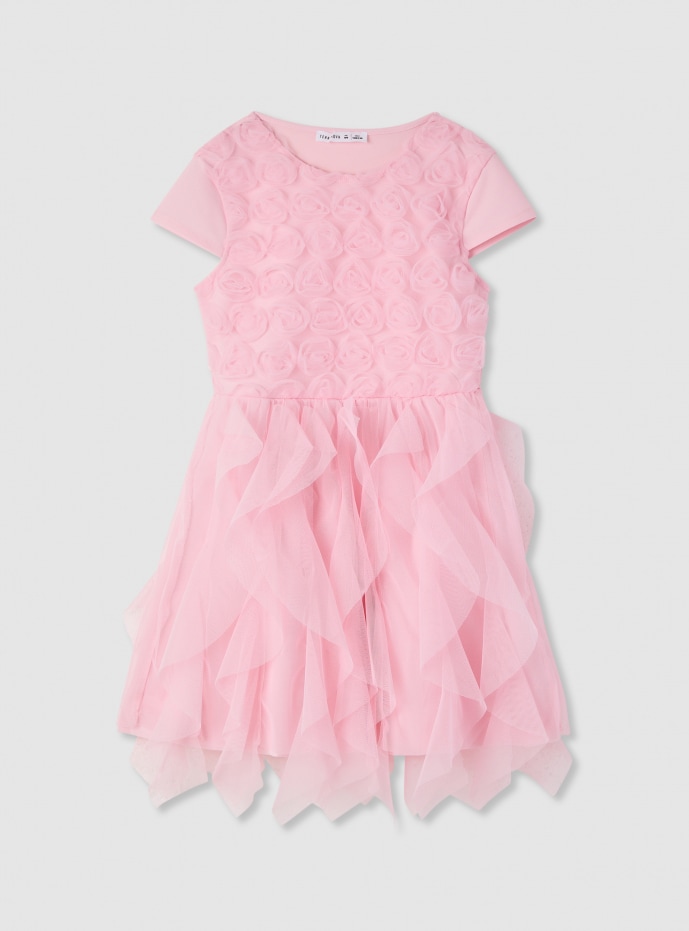 Haljina za devojčice sa izvezenim cvetnim aplikacijama na gornjem delu i suknjom sa laganim volanima. Idealna za svečanosti i posebne prilike. Kratki rukavi i okrugli izrez, savršena za kombinovanje sa baletankama i malom torbicom. Šara je u jednobojnoj varijanti, sa bogatom teksturom koja daje pokret i romantičan izgled.