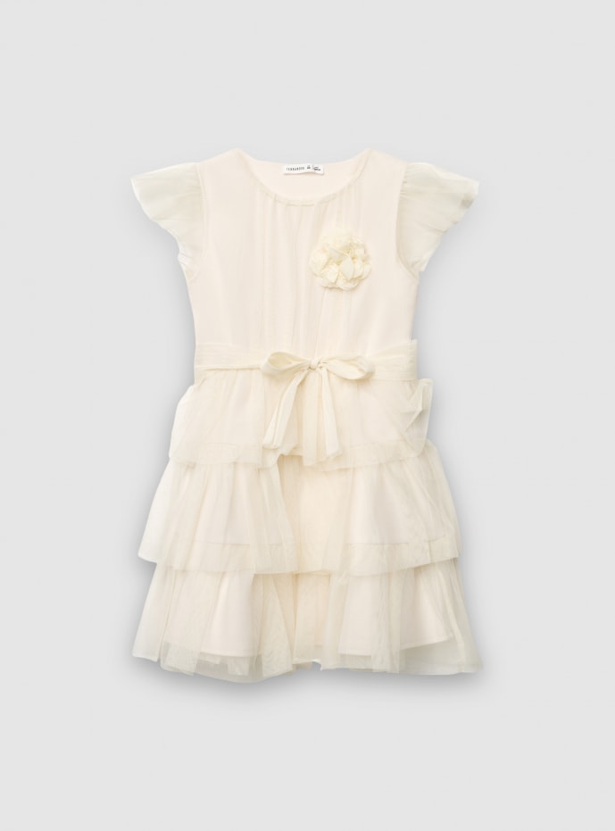 Haljina za devojčice u jednobojnoj varijanti, sa kratkim rukavima na karner i okruglim izrezom. Romantičan dizajn sa cvetom aplikovanim na grudima i pojasom za vezivanje u struku koji ističe kroj. Suknja sa laganim naborima za prozračan efekat, idealna za ceremonije i posebne prilike. Može se kombinovati sa baletankama i kardiganom za elegantan izgled.