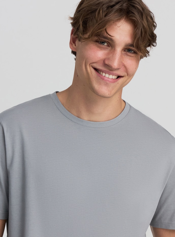 Majica za muškarce osnovna, u jednobojnoj boji, idealna za ležeran i svestran izgled. Izrađena od mekog pamučnog džersija, ima kratke rukave i okrugli izrez sa rebrastim obrubom. Osnovni deo muške garderobe, savršena za nošenje samostalno ili ispod dukserica i jakni. Regularna kroja i čisti dizajn čine je pogodnom za svaku svakodnevnu priliku.