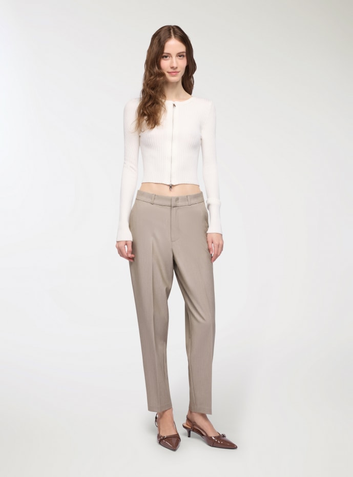 Ženske pantalone dugih nogavica u jednobojnoj varijanti, ravnog kroja sa ispeglanom falcom na nogavici i inspiracijom iz chino stila. Struk sa petljama za kaiš, skrivenim prednjim zatvaračem, francuskim i zadnjim džepovima sa šlicem za čist izgled. Teži materijal ih čini savršenim za jesenje i zimske dane. Udoban kroj sa elastičnim strukom koji naglašava bez stezanja. Idealne za kancelariju i slobodno vreme, mogu se kombinovati sa košuljama i blejzerima ili džemperima i patikama za ležerniji izgled.